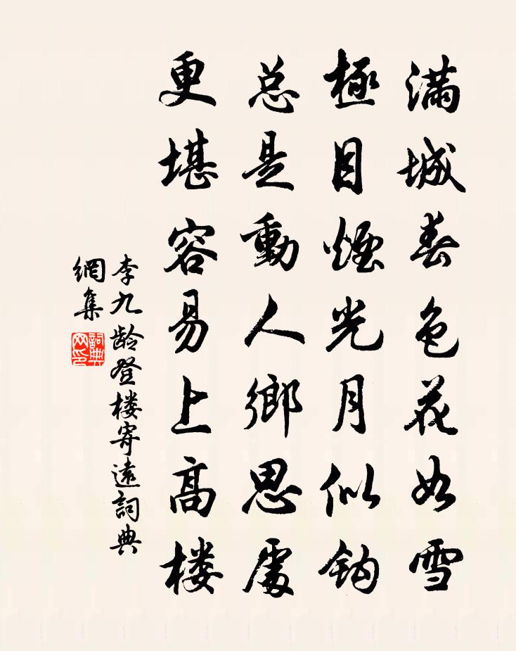 詩詞名句歷史字典書法欣賞書法字典國語詞典說文解字康熙字典古漢語字典標 題 作 者 詩 句 登樓寄遠作者:李九齡 朝代:唐代登樓寄遠原文滿城春色花如雪,極目煙光月似鉤。總是動人鄉思處,更堪容易上高樓。詩詞問答問:登樓寄遠的作者是誰?答:李九齡問:登樓寄遠寫於哪個朝代?答:唐代問:登樓寄遠是什麼體裁?答:七絕李九齡登樓寄遠書法欣賞登樓寄遠書法作品注釋全唐詩:卷730-5詩詞推薦登郡譙偶見姜應明司馬醉歸蘇轍〔宋代〕蒼然莫色映樓台,江市遊人夜未回。何處酒仙無一事,肩輿鼾睡過橋來。亂前上盧相司空圖〔唐代〕虜黠雖多變,兵驕即易乘。猶須勞斥候,勿遣大河冰。書空對月洪邁〔宋代〕天公自厭雨,一夕開寒晴。霜風淨曠野,鴻落有餘聲。飢鴉得林靜,霽月素窗生。慰開睡眼色,一洗空花橫。故人送項山人歸天台杜荀鶴〔唐代〕因話天台歸思生,布囊藤杖笑離城。不教日月拘身事,自與煙蘿結野情。龍鎮古潭雲色黑,露淋秋檜鶴聲清。此中浣溪沙(季欽擁雙妙麗,使來求長短句,為賦)朱敦儒〔宋代〕折桂歸來懶覓官。十年風月醉家山。有人挾瑟伴清閒。楚畹飛香蘭結佩,藍田生暖玉連環。擁書萬卷看雙鸞。洋州三十景獲浦鮮于侁〔宋代〕凝霜壓寒蘆,白月鋪淨練。誰起落梅聲,愁人淚如霰。病後晨興食粥戲書陸游〔宋代〕蝴蝶莊周安在哉!達人聊借作嘲詼。不知自此隨緣住,更把晨窗粥幾杯?蝶戀花陳允平〔宋代〕謝了梨花寒食後。翦翦輕寒,曉色侵書牖。寂寞幽齋惟酌酒。柔條恨結東風手。淺黛嬌黃春色透。薄霧輕煙,遠映和定慧超勝長老寄謝紫衣頌三首陳襄〔宋代〕恩袍出掛壯禪誹,試問何人達此機。船子夜來親下釣,碧潭明月有餘輝。曹源和尚贊釋道沖〔宋代〕遭密庵罵,恨入骨髓。此恨難忘,充塞天地。四海五湖無處避,能有幾人著它底。著它底,冤冤相報無窮已。挽丘大卿二首劉克莊〔宋代〕武仲孝標皆己矣,可堪又奪到丘遲。漢家卿將今能幾,洛社耆英在者誰。作有道碑寧免愧,過喬公墓定何時。春風水調歌頭劉辰翁〔宋代〕似似不常似,似我一生徒。畫工自畫龍種,忽近海飛魚。大笑北宮稱弟,遂使西河疑女,同氣自椒萸。且謂杜公者和禱富沙趙希逢〔宋代〕也知銅玉寧無璞,自是蒙金合以沙。挽首何辜聯盜械,脫身無路覓仙槎。懷珍空自經三獻,受用何嘗得五車。事業同鄔戴關中旅寓錢起〔唐代〕文士皆求遇,今人誰至公。靈台一寄宿,楊柳再春風。更惜忘形友,頻年失志同。羽毛齊燕雀,心事阻鴛鴻。留滯春居雜興王禹偁〔宋代〕雨株桃杏映籬斜,妝點商山副使家。何事春風容不得,和鶯吹折數枝花。聞高常侍亡(忠州作)杜甫〔唐代〕歸朝不相見,蜀使忽傳亡。虛歷金華省,何殊地下郎。致君丹檻折,哭友白雲長。獨步詩名在,只令故舊傷。春陰鄭谷〔唐代〕推琴當酒度春陰,不解謀生只解吟。舞蝶歌鶯莫相試,老郎心是老僧心。理宗明堂前朝享二首真宗〔宋代〕皇矣昭考,聖靈在天。稱秩宗祀,有嚴恭先。奉幣以訝,見之僾然。仁深澤厚,厥光以延。瓜丁謂〔宋代〕綿瓞憐同帶,鋤耰莫誤芸。浮泉滋紺質,巾綌透清芬。積石三年熟,瑤池五色文。靜思空洞美,寧問邵平君。偶約道流終乖文會答皮陸張賁〔唐代〕仙侶無何訪蔡經,兩煩韶濩出彤庭。人間若有登樓望,應怪文星近客星。名句推薦用舍由時,行藏在我,袖手何妨閒處看。蘇軾《沁園春·孤館燈青》 銅壺漏報天將曉,惆悵佳期又一年。羅隱《七夕》 萬里橋西一草堂,百花潭水即滄浪。杜甫《狂夫》 雪滿山中高士臥,月明林下美人來。高啟《詠梅九首》 天公見玉女,大笑億千場。李白《短歌行》 安上在於悅下,為己存乎利人。房玄齡《晉書·列傳·第二十四章》 胡馬依北風,越鳥巢南枝。佚名《行行重行行》 飛雪帶春風,裴回亂繞空。劉方平《春雪》 久在樊籠里,復得返自然。陶淵明《歸園田居·其一》 山光忽西落,池月漸東上。孟浩然《夏日南亭懷辛大》