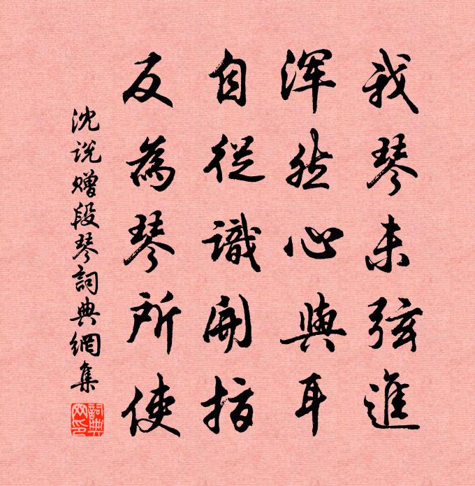詩詞名句歷史字典書法欣賞書法字典國語詞典說文解字康熙字典古漢語字典標 題 作 者 詩 句 贈段琴作者:沈說 朝代:宋代贈段琴原文我琴未弦進,渾然心與耳。自從識開指,反為琴所使。詩詞問答問:贈段琴的作者是誰?答:沈說問:贈段琴寫於哪個朝代?答:宋代沈說贈段琴書法欣賞贈段琴書法作品詩詞推薦臨江仙王以寧〔宋代〕此理循環如引鋸,春來百草菲菲。道人一笑悟前非。功名真長物,夕靄與朝霏。夢褥清孫今綠隱,漫郎自許風期。黃粹餉鱟一徐尉餉蝤蛑十同時至方岳〔宋代〕誰餉螯如徑尺盤,更分鱟似惠文冠。麵生醉嚼玉五殼,劍客生劙珠一簟。我與爾元同蠢動,冤哉烹亦到蹣跚。不知生查子(正月十六日周仲先勸酒)李處全〔宋代〕溫柔屬東南,和冷經三五。幾夜德星明,果應荀陳聚。分虎屈雄姿,展驥淹遐步。除詔已塗芝,便看朝天去。柬全小汀林則徐〔清代〕蓬山儔侶賦西征,累月邊庭並轡行。荒磧長驅回鶻馬,驚沙亂撲曼胡纓。但期繡隴成千頃,敢憚鋒車歷八城。丈室風入松沈禧〔元代〕虬枝撐月倚高寒。瘦影拂琅*。露華冷沁蒼苔潤,更深後、萬籟聲乾。塵慮於時頓息,沖襟此際惟寬。儼然妝飾整客中思家趙孟堅〔宋代〕楚楚輕衫翦薄紗,而今憶得在山家。蕭娘為是親蠶事,嗔帶含香紫笑花。春詞毛滂〔宋代〕春色年年染御溝,鴨頭輕綠弄花柔。今年春到崑崙上,九折委蛇舞翠虯。出郊懷汪尚中代簡吳泳〔宋代〕一春煙雨盡愁端,晴日郊行尚怕寒。芳草被堤風信過,雜英滿甸雪泥乾。劉郎去後花無恙,杜牧來遲春漸闌。明日子京以長篇告別值予欲出一絕謝之陳文蔚〔宋代〕二年不作上方游,一日重尋舊話頭。卻恨嬋娟成兩處,清尊無分共中秋。稻飯陸游〔宋代〕買得烏犍遇歲穰,此身永免屬官倉。塘南塘北九千頃,八月村村稻飯香。謁顏範祠趙蕃〔宋代〕處士當年配水仙,范公亦儼客星懸。誰知舊日番君國,颯爽英姿蓋九賢。蝶戀花(月詞)黃裳〔宋代〕伏以合歡開宴,奉樂國之賓朋;對景攄懷,待良時之風月。此者偶屈三益,幸逢四並。六幕星稀,萬欞風細。天發詠丹桂贈周純甫馮德厚袁甫〔宋代〕一種自然色,如吾方寸丹。天教傳信到,人莫作花看。骨氣超凡俗,聲名徹廣寒。留君良為此,憶別鼻休酸。喜遷鶯·花不盡晏殊〔宋代〕花不盡,柳無窮。應與我情同。觥船一棹百分空。何處不相逢。朱弦悄。知音少。天若有情應老。勸君看取利名場文彭州輓詩魏了翁〔宋代〕二仲嬋嫣起,清修自一家。踐塗中險阻,宰郡晚光華。氣焰奔金虜,威稜憺鐵耶。料應九峰下,朝露泣姚花。寄懷南陽潤卿皮日休〔唐代〕鹿門山下捕魚郎,今向江南作渴羌。無事只陪看藕樣,有錢唯欲買湖光。醉來渾忘移花處,病起空聞焙藥香。何事送千二十侄五首李呂〔宋代〕江左風流久擅名,成章擲地作金聲。清新俟逸俱難及,若比前賢更老成。南歌子石孝友〔宋代〕蟻酒浮明月,鯨波泛落星。春花秋葉幾飄零。只有廬山君眼、向人青。明日非今日,長亭更短亭。不辭一飲盡雙瓶米元章海岳詩帖贊岳珂〔宋代〕海岳之東西,見於印而驗於碑。觀乎此詩,景與物隨。於虖噫嘻,此皆是也,夫豈復有今是而昨非。江湯湯其不移念奴嬌黃人傑〔宋代〕菊黃萸紫,近重陽、天氣秋光如洗。懷燕占熊,還又應、崧岳生申時節。玉女擎香,金仙持送,錦里歡聲徹。照人名句推薦江上月明胡雁過,淮南木落楚山多。劉長卿《江州重別薛六柳八二員外》 歌鐘不盡意,白日落昆明。李白《經亂離後天恩流夜郎憶舊遊書懷贈江夏韋太守良宰》 能勝強敵者,先自勝者也。商鞅《商君書·畫策》 誠者,天之道也;思誠者,人之道也。至誠而不動者,未之有也;不誠,未有能動者也。孟子《孟子·離婁章句上·第十二節》 曉月過殘壘,繁星宿故關。司空曙《賊平後送人北歸》 百里不同風,千里不同俗班固《漢書·傳·王貢兩龔鮑傳》 皎皎窗中月,照我室南端。潘安《悼亡詩三首》 實無有法佛得阿耨多羅三藐三菩提。鳩摩羅什譯《金剛經·究竟無我》 嵩雲秦樹久離居,雙鯉迢迢一紙書。李商隱《寄令狐郎中》 明妃留在兩眉愁,萬古春山顰不盡元好問《玉樓春·驚沙獵獵風成陣》