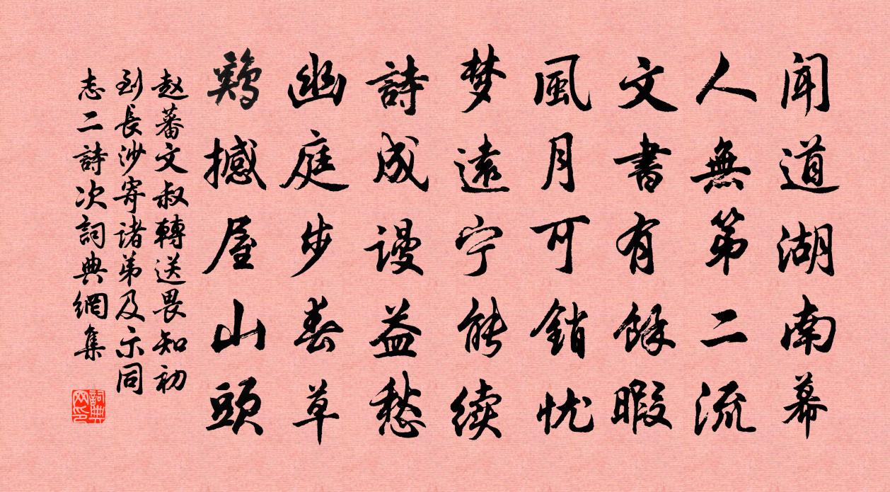 詩詞名句歷史字典書法欣賞書法字典國語詞典說文解字康熙字典古漢語字典標 題 作 者 詩 句 文叔轉送畏知初到長沙寄諸弟及示同志二詩次作者:趙蕃 朝代:宋代原文聞道湖南幕,人無第二流。文書有餘暇,風月可銷憂。夢遠寧能續,詩成謾益愁。幽庭步春草,雞撼屋山頭。詩詞問答問:《文叔轉送畏知初到長沙寄諸弟及示同志二詩次》的作者是誰?答:趙蕃問:該詩寫於哪個朝代?答:宋代書法欣賞文叔轉送畏知初到長沙寄諸弟及示同志二詩次書法作品詩文賞析【原題】:文叔轉送畏知初到長沙寄諸弟及示同志二詩次韻寄畏知二首詩詞推薦對食戲作陸游〔宋代〕白鹽赤米了朝餔,拗項何妨瓠煮壺。一種是貧吾尚可,鄰家稗飯亦常無。教坊歌兒孟郊〔唐代〕十歲小小兒,能歌得朝天。六十孤老人,能詩獨臨川。去年西京寺,眾伶集講筵。能嘶竹枝詞,供養繩床禪。能詩水調歌頭石孝友〔宋代〕清霜洗空闊,黍管吹秋灰。七蓂餘翠,半月流素影徘徊。天遣蟠根仙李,世折一枝丹桂,積慶到雲來。風骨峭冰玉三月晦日即席和章師侍郎沈繼祖〔宋代〕玉帳清無一點塵,浹旬休暇樂延賓。二天共醉千鍾酒,三月惟餘一日春。風急鳥雛猶喚友,雨晴燕子也留人。驪珠摸魚兒·正莓牆張榘〔宋代〕正莓牆、柳綿低度,枝頭紅紫飛盡。穠陰漲綠冰鈿碎,浥浥麝蘭成陣。仙骨嫩。悅姑射瑤姬,青幰游瓊苑。風前有分流水司空曙〔唐代〕古時愁別淚,滴作分流水。日夜東西流,分流幾千里。通塞兩不見,波瀾各自起。與君相背飛,去去心如此。杭州雜詩和林石田汪元量〔宋代〕偶出西湖士,新蒲緣未齊。攜來鯿縮項,買得蟹團臍。問酒入新店,喚船行舊隄。亂離多殺戮,水畔幾人啼。向以書戲邦衡雲某自廬山游西山當就迎公召節周必大〔宋代〕慧遠遙同社,洪崖近拍肩。松枝年紀萬,棐實歲逾千。徑欲通天漢,忙因棹酒船。午城均一握,易地即皆然。和徐季功舒蘄道中二十首王之道〔宋代〕一聲何處叫提壺,楊柳陰中駐犢車。笑語誰家騃兒女,浣紗溪上數游魚。知遇華岳〔宋代〕淮陰西漢一英雄,史氏持衡論亦工。不向追亡羨蕭相,卻於援死著滕公。豈知並績三人傑,皆自當時一語功。後世北征陳與義〔宋代〕世故信有力,挽我復北馳。獨沖七月暑,行此無盡陂。百卉共山澤,各自有四時。華實相後先,盛過當同衰。亦復次韻周朝宗六月十日泛湖周邦彥〔宋代〕風舟挽猶遲,兀若乘款段。深行蛟龍國,氈盪光炯散。洲涼扇荷箑,山晚垂雲幔。眷言江海期,百年行欲半。木文真人章聖朝合州進到其事甚怪至京其木中李廌〔宋代〕犀視月通角,蟬想丸目入。果臝祝螟蛉,天風化陰鶂。物變知品殊,尚可易形質。真人友造化,故與物為一。持此瑩老自浙歸住東廣光孝移住南華五首曾豐〔宋代〕南宗要勘北機關,踏遍江湖淮浙山。始信廣東元有佛,打包依舊更南還。秋前三日大雨范成大〔宋代〕暑殘堪喜亦堪憎,恰似沙場喋血兵。縱有背城餘燼在,能禁幾度瀉檐聲。初夏即事十二解楊萬里〔宋代〕玉磬金鍾天半鳴,夢中驚我起來聽。萬松花上三更雨,政事堂中有此聲。疏梅陳棣〔宋代〕發興江頭路,相將月下台。沖行逢縞袂,迫視得疏梅。木偶富三嗅,石腸應九回。鍾情唯我輩,欲去更徘徊。送趙德勤將漕淮東陳文蔚〔宋代〕才難嘆息古猶今,使節雙持委寄深。真主厲精思吏治,累朝忠孝結人心。激揚正賴扶風憲,欽恤惟存布德音。吏稱春陰即事王洋〔宋代〕春風雖輕颺,摧折猶有補。適當濃華時,明知不須雨,浴蠶待桑錢,特禾候陽土。婦子三時勤,亦欲少歌舞。百草再過九龍巖黃朝散〔宋代〕臘盡春來氣應和,豐年嘉瑞作民歌。一杯龍洞梅花酒,□破牢愁埒太阿。名句推薦若為化得身千億,散上峰頭望故鄉。柳宗元《與浩初上人同看山寄京華親故》 刑賞之本,在乎勸善而懲惡吳兢《貞觀政要·卷八·論刑法》 大江流日夜,客心悲未央。謝朓《暫使下都夜發新林至京邑贈西府同僚》 天下從事者,不可以無法儀。無法儀而其事能成者,無有。墨子《墨子·04章 法儀》 遠牧牛,繞村四面禾黍稠。李涉《牧童詞》 恨鐵不成鋼曹雪芹《紅樓夢·第九十六回》 樓前柳,憔悴幾秋風。賀鑄《小重山·花院深疑無路通》 翠葉吹涼,玉容消酒,更灑菇蒲雨。姜夔《念奴嬌·鬧紅一舸》 林外鳴鳩春雨歇,屋頭初日杏花繁。歐陽修《田家》 他年我若為青帝,報與桃花一處開。黃巢《題菊花》
