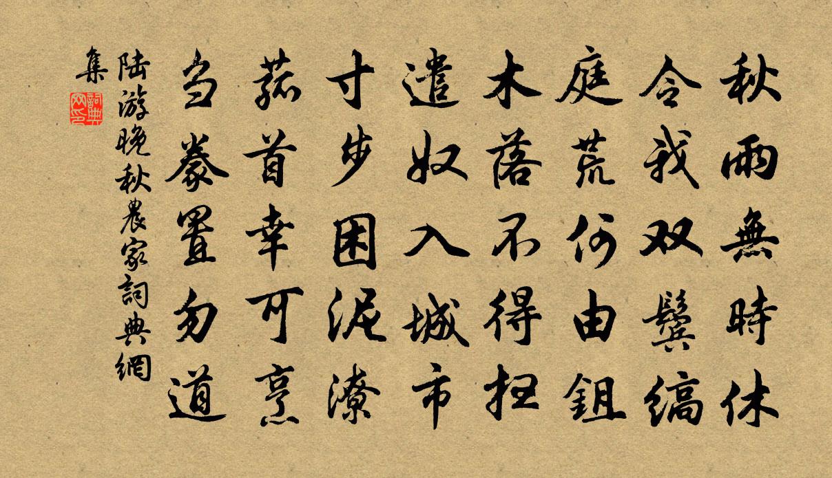 詩詞名句歷史字典書法欣賞書法字典國語詞典說文解字康熙字典古漢語字典標 題 作 者 詩 句 晚秋農家作者:陸游 朝代:宋代晚秋農家原文秋雨無時休,令我雙鬢縞。庭荒何由鉏,木落不得掃。遣奴入城市,寸步困泥潦。菰首幸可烹,芻豢置勿道。詩詞問答問:晚秋農家的作者是誰?答:陸游問:晚秋農家寫於哪個朝代?答:宋代問:陸游的名句有哪些?答:陸游名句大全陸游晚秋農家書法欣賞晚秋農家書法作品詩詞推薦南鄉子 贈友人魏初〔元代〕一別五雲城。慚愧朝陽有鳳鳴。奔走幾年成潦倒,堪驚。底事能傳萬古名。猶記少年行。可慣清樽獨自傾。昨日東積學吟金朋說〔宋代〕莠除苗自長,醅化醴方醇。學至盎然後,眼前皆是春。和丹岩衛宗武〔宋代〕芳事從今鼎鼎來。看看花片撲樓台。一和既盎寒如掃,錦繡香中圖畫開。祝英台近·惜多才戴復古妻〔宋代〕惜多才,憐薄命,無計可留汝。揉碎花箋,忍寫斷腸句。道傍楊柳依依,千絲萬縷,抵不住、一分愁緒。如何訴。遍地花佚名〔宋代〕元是竹林舊伴侶。去人日、偶相遇。笑盧同、狂怪嘗茶,問子建、詩成幾步。憶去年、乞巧同歡,把琴弦、細細與好事近楊冠卿〔宋代〕晚起倦梳妝,斜壓翠鬟雲鬢。手拈花枝輒笑,問青鸞音信。繡簾慵卷玉鉤垂,風篁奏餘韻。燈火黃昏院落,報雕鞍江神子(集句惜春)晁補之〔宋代〕雙鴛池沼水融融。桂堂東。又春風。今日看花,花勝去年紅。把酒問花花不語,攜手處,遍芳叢。留春且住莫匆匆題西溪無相院張先〔宋代〕積水涵虛上下清,幾家門靜岸痕平。浮萍 * 見山影,小艇歸時聞棹聲。入郭僧尋塵里去,過橋人似鑒中行。已憑送王國博赴江南提刑魏野〔宋代〕聖主憂民意,過於民自憂。一麾常慎選,八使更親求。車馬皆新賜,江山半舊遊。蠻旌飄後騎,水駑下仙舟。貧愛焦山范同〔宋代〕客星底事犯宸居,輸與焦君臥草廬。萬樹遮山難覓寺,百川入海此歸墟。浮沉心事盟鷗鳥,獻替功名愧{上制下魚蘭王柏〔宋代〕早受樵人貢,春蘭訪舊盟。謝庭夸瑞物,楚澤擷芳名。蒼玉圭影,紫檀含露英。奚奴培護巧,苔蘚綠菁菁。偈頌一百零二首釋紹曇〔宋代〕墅里山前,一棚傀儡。個東個西,或進或退。打東山鼓樂,斷送及時。著楊岐戲衫,編排合制。雖由行主線牽抽,楊莊鋪彭可軒〔宋代〕芳草迢迢去路,垂楊脈脈長亭。野渡半篙水碧,斜陽數點山青。近承琮上人問訊甚勤老懶不能作書以偈答之晁公溯〔宋代〕食時持缽乞諸隣,不用毗耶遣化身。想見堂中慚此老,法累未轉轉飢輪。春日陳與義〔宋代〕朝來庭樹有鳴禽,紅綠扶春上遠林。忽有好詩生眼底,安排句法已難尋。胡季亨贈集句古風,效其體奉酬楊萬里〔宋代〕秋氣集南澗,清風來故人。遺我一端綺,桃李不成春。大句乾元造,高詞媲皇墳。百衲收寸錦,一字買堪貧。苦恨鵲橋仙 上都金蓮劉敏中〔元代〕重房自拆,嬌黃誰注。爛熳風前無數。凌波夢斷幾番秋,只認得、三生月露。川平野闊,山遮水護。不似溪塘遲暮自況三首邵雍〔宋代〕滿天風月為官守,遍地雲山是事權。唯我敢開無意口,對人高道不妨言。自蘇州訪醫回酬盧士關判官見贈皎然〔唐代〕尋醫初疾理,忽憶故山雲。遠訪桑公子,還依柳使君。周旋承惠愛,佩服比蘭薰。從事因高唱,秋風起處聞。贈趙當可王灼〔宋代〕晚交得王孫,每見心輒醉。平生虎豹韜,近者詩酒累。流光迫壯懷,撫事我亦欷。不如從君飲,此外談無味。名句推薦寧可枝頭抱香死,何曾吹落北風中。鄭思肖《畫菊》 半壁見海日,空中聞天雞。李白《夢遊天姥吟留別 / 別東魯諸公》 四顧山光接水光,憑欄十里芰荷香。黃庭堅《鄂州南樓書事》 去歲江南見雪時,月底梅花發。張孝祥《卜運算元·雪月最相宜》 只在此山中,雲深不知處。賈島《尋隱者不遇 / 孫革訪羊尊師詩》 向來吟秀句,不覺已鳴鴉。韓翃《酬程延秋夜即事見贈》 堪怨王孫,不記歸期早。梅堯臣《蘇幕遮·草》 上林訊息好,鴻雁已歸來。張元乾《臨江仙·送宇文德和被召赴行在所》 首夏猶清和,芳草亦未歇。謝靈運《游赤石進帆海》 東岩富松竹,歲暮幸同歸。王勃《送盧主簿》