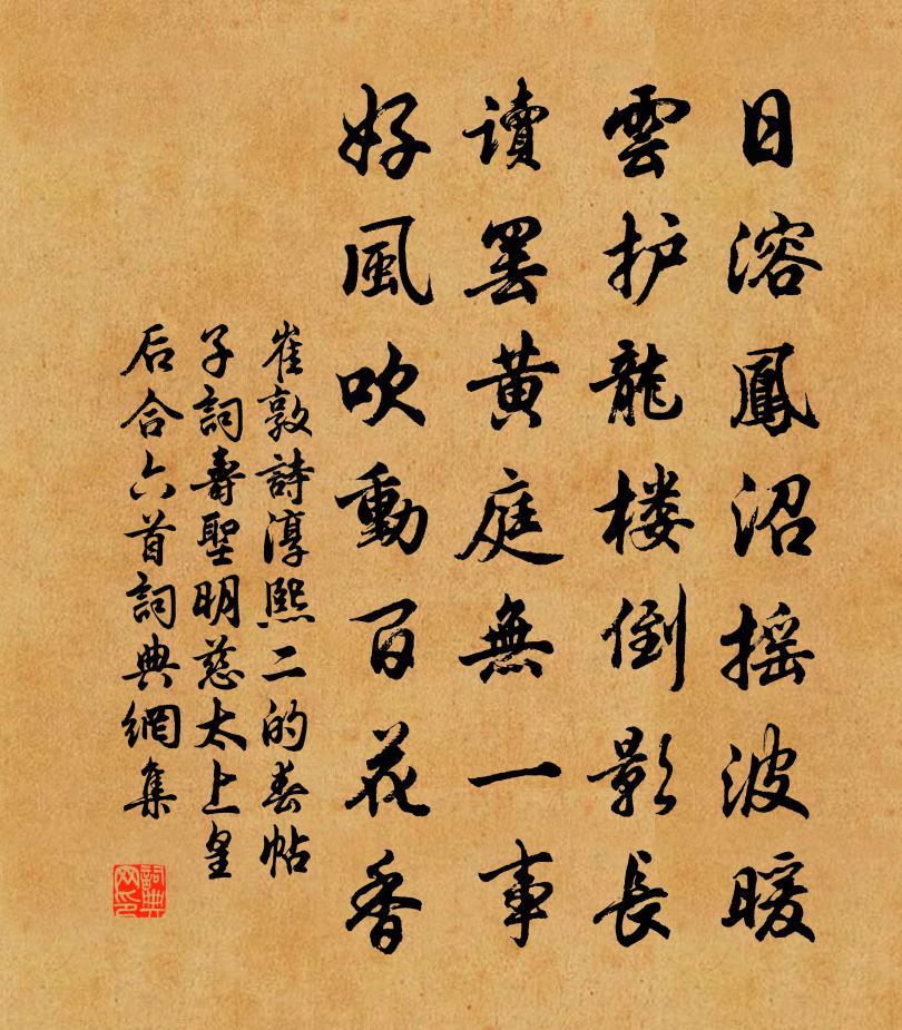 詩詞名句歷史字典書法欣賞書法字典國語詞典說文解字康熙字典古漢語字典標 題 作 者 詩 句 淳熙二的春帖子詞壽聖明慈太上皇后合六首作者:崔敦詩 朝代:宋代原文日溶鳳沼搖波暖,雲護龍樓倒影長。讀罷黃庭無一事,好風吹動百花香。詩詞問答問:《淳熙二的春帖子詞壽聖明慈太上皇后合六首》的作者是誰?答:崔敦詩問:該詩寫於哪個朝代?答:宋代書法欣賞淳熙二的春帖子詞壽聖明慈太上皇后合六首書法作品詩詞推薦送王簡卿歸天台二首姜夔〔宋代〕迎風吹白髮,送客向黃岩。在事何為爾,如君自不凡。城陰當復會,詩卷可頻緘。縱別無多久,江沙望遠帆。用易岩韻壽易岩王柏〔宋代〕天地之氣秋惟清,清之極者為聖人。惟皇降衷本均平,賢愚美惡氣質成。有偉易岩萬人英,聖涯涵泳心即經。人心秋思陸游〔宋代〕弊衣但故絮,糲食惟黃齏。餘年如登山,步步勤攀躋。從子念寂寞,千里致鹿麑。秋風石帆下,伴我扶青藜。送石深之歸沃洲謝耘〔宋代〕嬾踏紅塵地,結廬岩壑間。酒催清夜別,身伴白雲還。賀老湖邊月,支公屋外山。沃洲吟不盡,天與老翁閒。隋門隋文帝周曇〔唐代〕孤兒寡婦忍同欺,輔政剛教篡奪為。矯詔必能疏昉譯,直臣誠合重顏儀。雪中會孫洙舍人飲王氏西堂戲成三絕蘇轍〔宋代〕新歲逼人無一日,殘冬飛雪已三回。百分琥珀從君勸,十里瓊瑤走馬來。南國高人真巨源,華堂邂逅接清樽。十年芭蕉(數歲時作,傳於都下)路德延〔唐代〕一種靈苗異,天然體性虛。葉如斜界紙,心似倒抽書。擬和御製郊祀詩李洪〔宋代〕新地彌文考九丘,寅威郊見故遲留。黃琮蒼玉神娭燕,月璧星珠瑞應浮。禮洽漢山呼萬歲,事殊唐鑒獻千秋。侍臣詠梅五十首呈史尚書釋紹嵩〔宋代〕暖律還吹嶺上梅,數枝先發日徘徊。苔封曲徑無人到,付與春風自在開。仙掌齊己〔唐代〕峭形寒倚夕陽天,毛女蓮花翠影連。雲外自為高出手,人間誰合斗揮拳。鶴拋青漢來岩檜,僧隔黃河望頂煙。晴露湖舟即事顧逢〔宋代〕樓閣青山里,闌乾幾處憑。樂同湖上酒,清在坐中僧。水影飛雙蝶,風聲磨一鷹。夕陽堪入畫,金蚓走春冰。挽縣尉陳元圭喻良能〔宋代〕平生自負氣雄豪,落筆文詞涌怒濤。蚤歲賢關幾雁塔,暮年花縣未牛刀。凜然風義誰能並,偉甚衣冠眾所高。我欲定風波王哲〔元代〕里閒人戶外閒。方遊歷白雲間。射日臨光景媚,*前明朗見崑山。得怡然諸爭略。,中珍寶好躋攀。里金花開馥馥挽吳止水王珪〔唐代〕人生五馬貴,不負壯心期。竟作青門隱,空吟畫戟詩。家聲江表重,心事歲寒知。未恨風流絕,雙珠似可兒。送朱相士朱文昭族孫雲得劉碧雲相法葉適〔宋代〕南盪書林長砌蘿,碧雲鞋底曬庭莎。從今湖海須行遍,眼法雖親要看多。足趙丈句蘇泂〔宋代〕水光山色斗分明,何許清泠畫不成。月在波心流不去,蒹葭影里一舟橫。題潤州金山寺張祜〔唐代〕一宿金山寺,超然離世群。僧歸夜船月,龍出曉堂雲。樹色中流見,鐘聲兩岸聞。翻思在朝市,終日醉醺醺。泗水行張籍〔唐代〕泗水流急石纂纂,鯉魚上下紅尾短。春冰銷散日華滿,行舟往來浮橋斷。城邊魚市人早行,水煙漠漠多棹聲。偶宴西蜀摩訶池暢當〔唐代〕珍木郁清池,風荷左右披。淺觴寧及醉,慢舸不知移。蔭簟流光冷,凝簪照影欹。胡為獨羈者,雪涕向漣漪。拜明招二先生墓有感王柏〔宋代〕竹輿侵曉出山阿,宿露清圓憶舊喔。當日解衣盤礴意,明明分付一池荷。名句推薦啼鶯舞燕,小橋流水飛紅。白樸《天淨沙·春》 別來幾春未還家,玉窗五見櫻桃花。李白《久別離》 同欲者相憎,同憂者相親。劉向《戰國策·中山·犀首立五王》 金玉其外,敗絮其中劉基《賣柑者言》 黯然銷魂者,唯別而已矣!江淹《別賦》 放眼暮江千頃,中有離愁萬斛,無處落征鴻。楊炎正《水調歌頭·把酒對斜日》 論如析薪,貴能破理。劉勰《文心雕龍·論說》 憐君片雲思,一棹去瀟湘。杜牧《送薛種游湖南》 嘴甜心苦,兩面三刀,上頭一臉笑,腳下使絆子,明是一盆火,暗是一把刀。曹雪芹《紅樓夢·第六十五回》 何處合成愁。吳文英《唐多令·惜別》