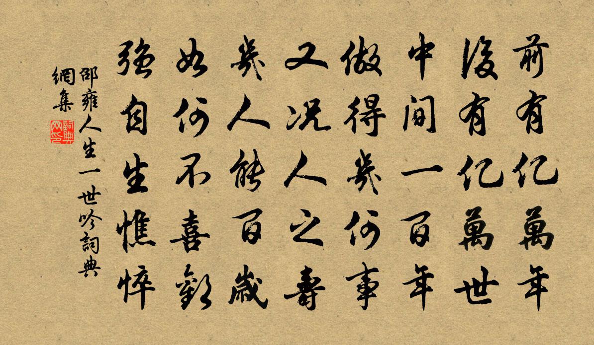 詩詞名句歷史字典書法欣賞書法字典國語詞典說文解字康熙字典古漢語字典標 題 作 者 詩 句 人生一世吟作者:邵雍 朝代:宋代人生一世吟原文前有億萬年,後有億萬世。中間一百年,做得幾何事。又況人之壽,幾人能百歲。如何不喜歡,強自生憔悴。詩詞問答問:人生一世吟的作者是誰?答:邵雍問:人生一世吟寫於哪個朝代?答:宋代邵雍人生一世吟書法欣賞人生一世吟書法作品詩詞推薦寄鄭谷郎中齊己〔唐代〕人間近遇風騷匠,鳥外曾逢心印師。除此二門無別妙,水邊松下獨尋思。原明官閒以余兼職良苦作詩見勞次韻二首右范祖禹〔宋代〕野性從來麋鹿游,強加冠服祗為憂。何時放出樊籠去,定似飛鴻上九秋。江秀才新居趙湘〔唐代〕營居知避俗,領鶴過秋郊。泉照書初架,窗移樹未巢。留題新墨濕,掩戶舊鄰敲。數本當簾竹,茶煙漸欲交。余以庚寅十月十日抵敝廬今恰三年感而有作偶吳芾〔宋代〕何處風煙似我園,且將蕭散樂餘年。向來已不憂三黜,老去誰能羨九遷。門外往還惟白足,里中游舊盡華顛。竹林送元秀才入道劉威〔唐代〕不教榮樂損天機,願逐鸞皇次第飛。明月滿時開道帔,欲塵飄處脫儒衣,只攜仙籍還金洞,便與時流隔翠微。空有和學士秋懷一十五首李彌遜〔宋代〕厚顏衰暑未甘衰,秋事於人卻有期。怯雨垂蕉全披靡,受風疏葦強扶持。鷓鴣天 鵝湖歸病起作辛棄疾〔宋代〕枕簟溪堂冷欲秋,斷雲依水晚來收。紅蓮相倚渾如醉,白鳥無言定自愁。書咄咄,且休休,一丘一壑也風流。不知和晁應之山中張耒〔宋代〕康樂雖為吏,不忘山水情。我無連璧美,君許托車行。幽鳥花前語,春泉竹外鳴。勒移無草草,吾友笑功名。讀慶元黨人家乘蜀王邁〔宋代〕石顯權傾帝,穰侯勢逼王。群狐爭伺夜,丹鳳獨鳴陽。閶闔辭天仗,洋川佩郡章。誰嘗舒亶唾,有舌巧如簧。城南蔣莊四首李長民〔宋代〕今旦商飈起,蕭然雲氣秋。稚蛩工促織。老蔓擬牽牛。莫賦潘安閣,聊登王粲樓。家園歸未得,孤夢繞松楸。次韻吳厚秀才見贈三首蘇轍〔宋代〕騷人思苦骨岩岩,百里攜詩相就談。故作微詞挑遷客,不嫌春雨濕歸衫。少年舊喜登高賦,老病今成見敵慚。問我錦城方天瑞玄英先生後人得白雲山居圖仿佛桐仇遠〔宋代〕翼翼山千朵,蕭蕭屋數間。石崖不可度,門徑幾曾關。綠樹經秋在,白雲終日閒。依稀鏡湖曲,西島水迴環。題閻求仁虛樂亭秦觀〔宋代〕長官平昔嗜林丘,僧與開亭待勝游。修竹迴環扶碧瓦,小池方折轉清流。春深鶗鴃催詩句,夜靜蟾蜍入酒舟。只恐又和原甫省壁畫蟹韓維〔宋代〕天工不為神,眾物自我具。錢侯掃墨筆,敖跪生指顧。如依石穴出,尚想秋江度。真偽本相奪,安知彼非誤。郊廟歌辭。享惠昭太子廟樂章。送文舞出迎武舞入孟簡〔唐代〕喧喧金石容既缺,肅肅羽駕就行列。緱山遺響昔所聞,廟庭進旅今攸設。論語三省章陳普〔宋代〕專心於內最為難,又主其三得大端。曾識中庸並孟子,正如江水發岷山。元符親享明堂十一首佚名〔宋代〕聖能享帝,孝克事親。於皇宗祀,盛節此陳。何以下虔,二精有類。何以致祥,上天鑒止。出城李廌〔宋代〕岸走舟安穩,逍遙若步虛。晴煙迷白鷺,春水見浮魚。桑樹連坡種,人家夾水居。年豐村舍好,稚子學詩書。偈頌一百五十首釋心月〔宋代〕山遙海闊古蘭若,月白風清老比丘。萬象森羅總賓客,相逢莫不小低頭。念奴嬌劉克莊〔宋代〕少時獨步詞場,引弦百發無虛矢。歲晚卻蒙崑體力,世業工修鞋底。曾裂白麻,曾塗墨敕,謫墮俄徵起。鼎湖龍去名句推薦立業無論大小,總要此身做得來。王永彬《圍爐夜話·第三九則》 江水漾西風,江花脫晚紅。王安石《江上》 遍身羅綺者,不是養蠶人張俞《蠶婦》 居安思危。思則有備,有備無患左丘明《左傳·襄公·襄公十一年》 故明主必謹養其和,節其流,開其源,而時斟酌焉。荀子《荀子·富國》 三人行,必有我師焉。擇其善者而從之,其不善者而改之。孔子弟子《論語·述而篇》 江上月明胡雁過,淮南木落楚山多。劉長卿《江州重別薛六柳八二員外》 明月皎皎照我床,星漢西流夜未央。曹丕《燕歌行二首·其一》 黃雲萬里動風色,白波九道流雪山。李白《廬山謠寄盧侍御虛舟》 海燕歲微渺,乘春亦暫來。張九齡《歸燕詩》