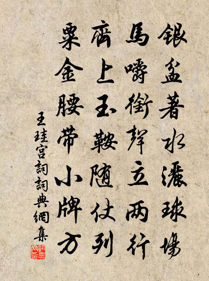 詩詞名句歷史字典書法欣賞書法字典國語詞典說文解字康熙字典古漢語字典標 題 作 者 詩 句 宮詞作者:王珪 朝代:唐代宮詞原文銀盆著水灑球場,馬嚼銜聲立兩行。齊上玉鞍隨仗列,粟金腰帶小牌方。詩詞問答問:宮詞的作者是誰?答:王珪問:宮詞寫於哪個朝代?答:唐代王珪宮詞書法欣賞宮詞書法作品詩詞推薦湘山寺郝顯〔宋代〕偃蹇蒼松鎖翠岩,邦人云是古湘山。寺穿石磴高低處,塔聳雲煙吞吐間。物外豈知塵世事,箇中只許老僧間。我來中{左氵右霝}泉舊在揚子江心今題金山寺井曰林景熙〔宋代〕蜀波萬里與淮連,揚子江心浪折天。陸羽當年亦奇士,驪龍蟄處識名泉。金鰲背上汲清泠,僧說龍移遠脈靈。若定萬杉寺史文卿〔宋代〕君恩報答果何如,手植松杉一萬株。溪足斷邊橫略彴,峰頭好處見浮屠。鳳書御墨藏飛白,龍吐山泉散作珠。包帚和渭北劉大夫借便秋遮虜寄朝中親友白居易〔唐代〕巨鎮為邦屏,全材作國禎。韜鈐漢上將,文墨魯諸生。豹虎關西卒,金湯渭北城。寵深初受棨,威重正揚兵。陣占平生陸游〔宋代〕平生涉世似虛舟,不著胸中一點愁。已用浮雲看富貴,肯緣華屋嘆山丘?戴溪寒釀千峰雪,嚴瀨聲酣七里秋。好景幽誓范成大〔宋代〕天風厲兮山木黃,歲晼晚兮又早霜。虎號崖兮石飛下,山中人兮孰虞。予造軔兮挾輈,紛不可兮此淹留。靈曄兮遄二十四詩品司空圖〔唐代〕涓涓群松,下有漪流。晴雪滿竹,隔溪魚舟。可人如玉,步渫尋幽,載瞻載止,空碧悠悠。神出古異,淡不可收。掃花游/掃地游趙文〔宋代〕結廬勝境,似舊日曾游,玉蓮佳處。萬花織組。愛迴廊宛轉,楚腰束素。度密穿青,上有燕支萬樹。探梅去。正竹憶秦娥蔡伸〔宋代〕花陰月。蘭堂夜宴神仙客。神仙客。江梅標韻,海棠顏色。良辰佳會誠難得。花前一醉君休惜。君休惜。楚台雲雨渡太湖范成大〔宋代〕囊風閣雨半晴陰,慘澹誰知造化心。委命浮沉惟一葉,計身輕重亦千金。紅塵猶道不勝險,白浪莫嗔如許深。晚得十一月九日夜夢與人論神仙道術因作一詩八句蘇軾〔宋代〕析塵妙質本來空,(夢中於此句若瞭然有所得者。)更積微陽一線功。照夜一燈長耿耿,閉門千息自濛濛。養成丹喜雨口號呈陳守伯固十二首陳造〔宋代〕邦人苦旱日呻呼,公比邦人更瘠臞。賀雨歸來人競問,邦君今日解顏無。和胡文友冷齊口號四首熊瑞〔宋代〕交情落落今如此,世事茫茫何所之。安得檐花清夜酌,相同鄭老話襟期。知宗柑詩用韻頗險予既知之復取所未用之韻續林景熙〔宋代〕書閱揚州貢,功觀禹化覃。香包分橘柚,秋色動江潭。破暑花凝雪,凌寒葉染藍。金衣愛日照。珠實碧波涵。未止題惠老松竹圖章甫〔宋代〕風細聲音互答,月明體用全彰。二士為君提唱,老僧無法商量。水調歌頭(濠州觀魚台作)葉夢得〔宋代〕渺渺楚天闊,秋水去無窮。兩淮不辨牛馬,輕浪舞迴風。獨倚高台一笑,圉圉游魚來往,還戲此波中。危欄對千里再用韻贈湖塘來上人二首王之道〔宋代〕望外荊榛蔽輞川,我來何必為逃喧。亂余村疃雞豚盡,秋到江湖藻荇繁。雜曲歌辭。灞上輕薄行孟郊〔唐代〕長安無緩步,況值天景暮。相逢灞滻間,親戚不相顧。自嘆方拙身,忽隨輕薄倫。常恐失所避,化為車轍塵。此中四並堂葛密〔宋代〕華圃控弦秋習射,寒窗留燭夜鈔書。良辰美景饒心事,觀日相併樂起予。龜堂雜興陸游〔宋代〕朝來地碓玉新舂,雞跖豚肩異味重。便腹摩挲更無事,老人又過一年冬。名句推薦人煙寒橘柚,秋色老梧桐。李白《秋登宣城謝朓北樓》 經年塵土滿征衣,特特尋芳上翠微。岳飛《池州翠微亭》 卻看妻子愁何在,漫捲詩書喜欲狂杜甫《聞官軍收河南河北》 花片片飛風弄蝶,柳陰陰下水平橋。張先《浣溪沙·樓倚春江百尺高》 水滿有時觀下鷺,草深無處不鳴蛙。陸游《幽居初夏》 諸君才絕世,獨步許誰強妙信《九日酬諸子》 詩言志,歌永言,聲依永,律和聲。佚名《尚書·虞書·舜典》 雲收雨過波添,樓高水冷瓜甜,綠樹陰垂畫檐。白樸《天淨沙·夏》 似醉煙景凝,如愁月露泫。崔護《五月水邊柳》 自是相思抽不盡,卻教風雨怨秋聲。鄭燮《詠芭蕉》