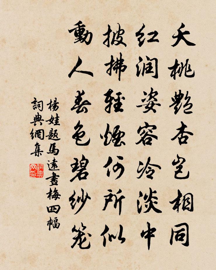 詩詞名句歷史字典書法欣賞書法字典國語詞典說文解字康熙字典古漢語字典標 題 作 者 詩 句 題馬遠畫梅四幅作者:楊娃 朝代:宋代題馬遠畫梅四幅原文夭桃艷杏豈相同,紅潤姿容冷淡中。披拂輕煙何所似,動人春色碧紗籠。詩詞問答問:題馬遠畫梅四幅的作者是誰?答:楊娃問:題馬遠畫梅四幅寫於哪個朝代?答:宋代楊娃題馬遠畫梅四幅書法欣賞題馬遠畫梅四幅書法作品詩詞推薦外舅莊子尚生辰仲並〔宋代〕家聲久矣冠淮東,自喜升堂獲拜公。每看雲煙生筆下,故應邱壑滿胸中。祠公此日家山樂,明府他時社稷功。早晚送龍圖范丈德孺帥慶晁補之〔宋代〕君不見先君往在康定中,奉詔經略河西戎。大順胡蘆盡耕稼,賊封不到秦關東。邊人鹹識侍中子,至今猶說將軍似爭棋方岳〔宋代〕江南底處無楊柳,海內何人解詩酒。春蓑雨濕蕙煙寒,閒卻鷗沙釣竿竹。塞雲漠漠方笞兵,油幢安用白面生。東山和琴趙希逢〔宋代〕四時那得如秋清,夜靜無人琴有聲。月華如水不動塵,無端耳畔寒蛩鳴。題王氏琴清堂馬廷鸞〔宋代〕孤桐缺月風露秋,夜蟲催織寒颼颼。拂床文字翻葉葉,古心埋沒從何求。客來洗予箏笛耳,清圜琅然散百憂。南窗何秀才郊園五首司馬光〔宋代〕濁酒不取味,素琴無復弦。何須更清論,相見自蕭然。元和甲午歲詔書盡征江湘逐客余自武陵赴京宿於…諸君子劉禹錫〔唐代〕雷雨江山起臥龍,武陵樵客躡仙蹤。十年楚水楓林下,今夜初聞長樂鍾。贈閻少保張籍〔唐代〕辭榮戀闕未還鄉,修養年多氣力強。半俸歸燒伏火藥,全家解說養生方。特承恩詔新開戟,每見公卿不下床。竹樹明堂樂章。肅和佚名〔唐代〕象天御宇,乘時布政。嚴配申虔,宗禋展敬。樽罍盈列,樹羽交映。玉幣通誠,祚隆皇聖。送施歷城辯歸常州蘇轍〔宋代〕高人不受塵土侵,三年浙江藏河深。久閒物理有相復,歷城官事森成林。乘時斂散逐十二,鞭撻逋負徒哀矜。一杯蝶戀花 西湖感舊葉森〔元代〕小院閒春愁幾許。目斷行雲,醉憶曾游處。寂寞而今芳草路。年年綠遍清明雨。花影重簾斜日暮。酒冷香溫,幽恨遊仙詞三十三首王鎡〔宋代〕寶花如雨落龍樓,上界遙觀下界秋。金鳳一聲天欲曉,銀河光趁月西流。點絳唇(周園分題得湖上聞樂)佚名〔宋代〕紫霧香濃,翠華風轉花隨輦。洞天雲暖。一片笙歌遠。水展龍舟,憶侍瑤池宴。閒庭院。夢回春半。雪鬢無人見。宿漁家劉威〔唐代〕竹屋清江上,風煙四五家。水園分芰葉,鄰界認蘆花。雨到魚翻浪,洲回鳥傍沙。月明何處去,片片席帆斜。清溪江令公宅羅隱〔唐代〕蠻箋象管夜深時,曾賦陳宮第一詩。宴罷風流人不見,廢來蹤跡草應知。鶯憐勝事啼空巷,蝶戀餘香舞好枝。還有壽成惠聖慈佑太皇太后閣春帖子衛涇〔宋代〕北內風光別,仙家日月閒。紫皇天下養,金母在人間。偶作白居易〔唐代〕籃舁出即忘歸舍,柴戶昏猶未掩關。聞客病時慚體健,見人忙處覺身閒。清涼秋寺行香去,和暖春城拜表還。木雁老農吟柴元彪〔宋代〕襏襫田家翁,矍鑠鬚眉白。問渠年幾許,不記年庚甲。自言身世居此村,三十得兒兒復孫。傷哉兒孫已露電,朝昏元老和示小詩自謂非戰之罪復作一絕並坐具還蘇轍〔宋代〕請君卻領彌天具,不欲終收陷虎名。莫道昏沉非戰罪,何如不戰屈人兵。採菊亭張栻〔宋代〕陶公千載人,高標跨餘子。豈無濟時念,斂蔭獨知止。歸來臥衡門,無慍復何喜。九日天氣佳,東籬擷芳蕊。舉頭名句推薦月出於東山之上,徘徊於鬥牛之間。蘇軾《前赤壁賦》 香到酴醾送晚涼,荇風輕約薄羅裳。曲闌憑遍思偏長。葉小鸞《浣溪沙·初夏》 繡袂捧琴兮,登君子堂。貫休《善哉行·傷古曲無知音》 欲渡黃河冰塞川,將登太行雪滿山。李白《行路難·其一》 無功不賞,無罪不罰。荀子《荀子·王制》 蠶娘洗繭前溪淥,牧童吹笛和衣浴。貫休《春晚書山家屋壁二首》 只言啼鳥堪求侶,無那春風欲送行。高適《夜別韋司士》 屋上春鳩鳴,村邊杏花白。王維《春中田園作》 一壺酒,一竿身,快活如儂有幾人。李煜《漁父·浪花有意千里雪》 秋來相顧尚飄蓬,未就丹砂愧葛洪。杜甫《贈李白》