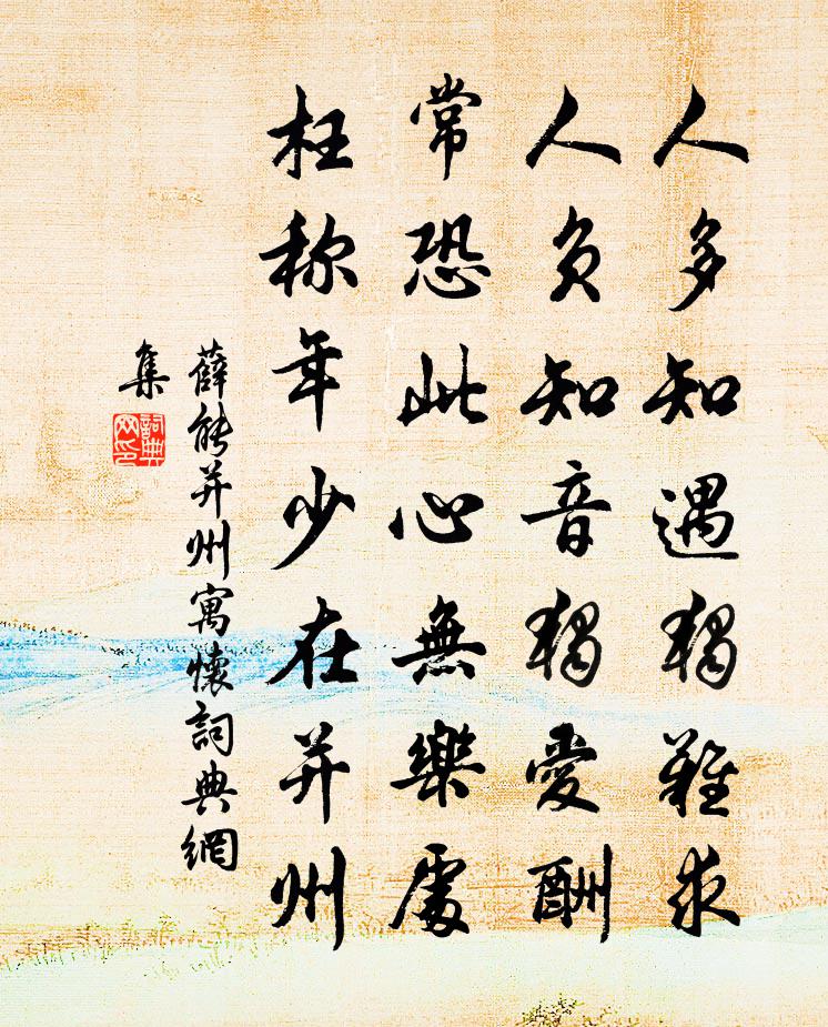 詩詞名句歷史字典書法欣賞書法字典國語詞典說文解字康熙字典古漢語字典標 題 作 者 詩 句 并州寓懷作者:薛能 朝代:唐代并州寓懷原文人多知遇獨難求,人負知音獨愛酬。常恐此心無樂處,枉稱年少在并州。詩詞問答問:并州寓懷的作者是誰?答:薛能問:并州寓懷寫於哪個朝代?答:唐代問:并州寓懷是什麼體裁?答:七絕薛能并州寓懷書法欣賞并州寓懷書法作品注釋全唐詩:卷561-17詩詞推薦梅花十絕追和張文潛韻王之道〔宋代〕別後開園日就荒,對花還憶少年狂。東榮幾樹應無恙,待得予歸破嫩黃。八聲甘州(九日登高)劉將孫〔宋代〕不看萸、把酒對名山,無帽厭西風。渺四海故人,一尊今雨,萬里長空。宇宙此山此日,今夕幾人同。舉世誰不醉暮秋陸游〔宋代〕萬里歸無策,八年淹此留。羞蒙子公力,寧倦長卿游。聽雨瀟湘夜,飛鷹鄠杜秋。更須論富貴。此記亦悠悠。簡見可覓畫三首趙蕃〔宋代〕我居何有惟修竹,一日真成不可無。別後平安久無報,為予十日寫成圖。句陶彝〔宋代〕生涼好雞蘇佛,回味宜稱橄欖仙。陪族叔當塗宰游化城寺升公清風亭李白〔唐代〕化城若化出,金榜天宮開。疑是海上雲,飛空結樓台。升公湖上秀,粲然有辯才。濟人不利己,立俗無嫌猜。了見菩薩蠻趙長卿〔宋代〕隔江一帶春山好。平林新綠春光老。休去倚闌乾。飛紅不忍看。東流何處去。便是歸舟路。芳草外斜陽。行人更斷送先室歸葬西山戴栩〔宋代〕結束遙裝異昔時,江頭送爾一沾衣。五年客殯依禪寂,千里香魂與夢歸。閨美欲書碑易盡,龍封新斸草應稀。西山郴江百詠並序寒泉阮閱〔宋代〕春欲為霜夏欲冰,一山寒氣逼人清。應知炎冷難同處,甘與湯泉各自生。水調歌頭 上南京留守王寂〔元代〕聖世賢公子,符節鎮名邦。褰帷一見豐表,無語已心降。永日風流高會,佳夕文字清歡,香霧濕蘭。四座皆豪逸和戶部岑尚書參跡樞揆沈佺期〔唐代〕大君制六合,良佐參萬機。大業永開泰,臣道日光輝。鹽梅和鼎食,家聲眾所歸。漢章題楚劍,鄭武襲緇衣。理識冬至日瓦橋與李綖少卿會飲蘇頌〔宋代〕使傳驅馳同被命,邊城迢遞偶相從。風霜正急偏催老,歲月如流又過冬。方念去家千里遠,無辭沈醉十分濃。須知黃櫱掌沙彌圖贊釋心月〔宋代〕大機之用誰擔荷,斷際孤風不可追。濟北少年曾未委,風光太子已先知。初聞思歸鳥憶昨寄崔伯易朱元弼王令〔宋代〕去年春日花盛開,嘗有鳥啼歸去來。余詩告爾東海志,子笑屬我南山杯。將睎遐綜蹈高軼,就拔去跡離俗埋。同時陪李金吾花下飲杜甫〔唐代〕勝地初相引,余行得自娛。見輕吹鳥毳,隨意數花須。細草稱偏坐,香醪懶再酤。醉歸應犯夜,可怕李金吾。順宗問鵝湖大義禪師圖贊釋智愚〔宋代〕當機一句避天關,海闊山遙豈等閒。堪笑冬瓜長龍侗,翻成瓠子曲彎彎。次韻庾使左史中書行部二首劉克莊〔宋代〕朝回暖律變嚴冬,應念閩風與蜀同。叢棘冤皆為洗雪,發棠惠遍及飢窮。冰寒吏膽照天燭,泉涌詩腸飲潤虹。帝遣月岩蒲壽宬〔宋代〕皎皎應如欲下弦,為誰長掛此岩前。行人莫笑中空洞,空洞中間儘是天。送隴州使君劉仲儀左藏赴治強至〔宋代〕夾道濃香數里焚,隨車和氣一城薰。兵民如見古循吏,文武兼能今使君。冷射祠堂汧水月,晴飛郡閣隴山雲。幕中七哀詩三首·其三王粲〔魏晉〕邊城使心悲,昔吾親更之。冰雪截肌膚,風飄無止期。百里不見人,草木誰當遲。登城望亭燧,翩翩飛戍旗。行者名句推薦清娥畫扇中,春樹鬱金紅。溫庭筠《清明日》 青山霽後雲猶在,畫出東南四五峰。郎士元《柏林寺南望》 村喜禾花實,峰看嶺岫重。趙汝愚《雨後送李將軍還祠偕同寅飲一杯亭》 清淚浥羅巾,各自消魂,一江離恨恰平分。陸游《浪淘沙·丹陽浮玉亭席上作》 君子時詘則詘,時伸則伸也。荀子《荀子·仲尼》 魏都接燕趙,美女夸芙蓉。李白《魏郡別蘇明府因北游》 浮雲終日行,遊子久不至。杜甫《夢李白二首·其二》 客思似楊柳,春風千萬條。王安石《壬辰寒食》 一葉浮萍歸大海,為人何處不相逢!吳承恩《西遊記·第四十回》 送客自傷身易老,不知何處待先生。劉滄《贈道者》