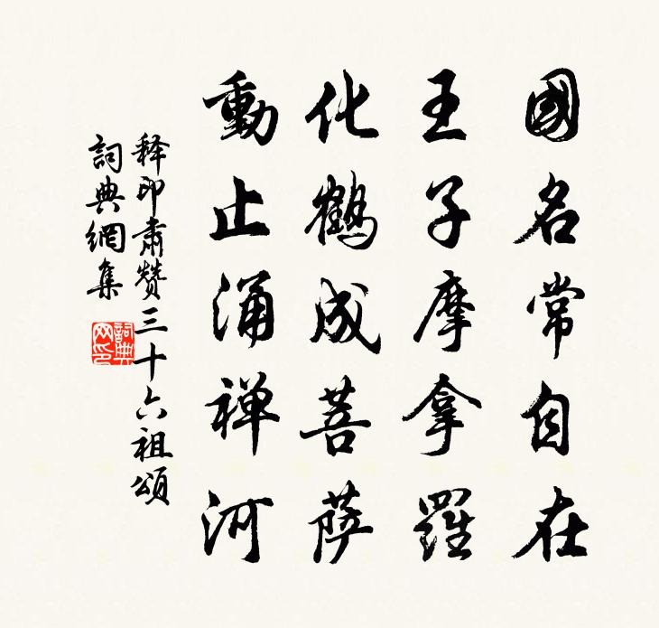 詩詞名句歷史字典書法欣賞書法字典國語詞典說文解字康熙字典古漢語字典標 題 作 者 詩 句 贊三十六祖頌作者:釋印肅 朝代:宋代贊三十六祖頌原文國名常自在,王子摩拿羅。化鶴成菩薩,動止涌禪河。詩詞問答問:贊三十六祖頌的作者是誰?答:釋印肅問:贊三十六祖頌寫於哪個朝代?答:宋代釋印肅贊三十六祖頌書法欣賞贊三十六祖頌書法作品詩詞推薦楚甸江頭望雪晴二首馮時行〔宋代〕歲暮風欺客,天開日解圍。雪消無奈白,雲細不禁飛。目盡江無盡,吾歸雁亦歸。曉來清徹骨,塵物污人衣。雜題陸游〔宋代〕松肪釀酒石根醉,槲葉作衣雲外行。指點人間一長嘆,秋風又到洛陽城。樊將軍廟汪遵〔唐代〕玉輦曾經陷楚營,漢皇心怯擬休兵。當時不得將軍力,日月須分一半明。題興善寺僧道深院張喬〔唐代〕江峰峰頂人,受法老西秦。法本無前業,禪非為後身。院栽他國樹,堂展祖師真。甚願依宗旨,求閒未有因。江城秋思夏竦〔宋代〕澤國迢迢枕海涯,眼前歸思亂如麻。清秋泉石無多地,殘日樓台有幾家。兩岸早霜紅橘柚,半汀殘雨老蒹葭。明時游鼓山鄭應開〔宋代〕兩峰峻上半天開,一水爭奔急雪來。眺遠直疑滄海近,洞靈曲坳湧泉回。慨思南北江山異,更陟嵯峨宇宙恢。眇眇減字木蘭花陳瓘〔宋代〕華胥月色。萬水千山同一白。南北相望。獨醉香山舊草堂。淮岑妙境。十載醺酣猶未醒。一腹便便。也讀春秋也愛贈王正己潘若沖〔宋代〕兩捧歌詩寄,化余即展開。無時惟北望,何日逐南來。夢裡得芳草,笛中聞落梅。終朝一攜手,江上有樓台。次韻虞退夫除夕七絕句魏了翁〔宋代〕雲外銜山日半環,傳杯共惜片雲懽。莫疑來日是來歲,萬古光陰只么看。次韻子瞻自普照入山獨游二庵蘇轍〔宋代〕披榛入山山路細,鐘聲出寺門將閉。石苔冉冉上芒鞋,草露漙漙著衣袂。野人茅茨苫竹屋,終身侷促無生計。天公甘州(題戚五云云山圖)張炎〔宋代〕過千岩萬壑古蓬萊,招隱竟忘還。想乾坤清氣,霏霏冉冉,卻在闌乾。洞戶來時不鎖,歸水映花關。只可自怡悅,和宇文正甫探梅張栻〔宋代〕天與孤清迥莫鄰,只砂空谷伴幽人。千林掃跡愁無那,一點橫梢眼便親。顧影莫驚身易老,喔詩尚覺句能新。幾多金國賀正旦使人到闕集英殿宴致語口號崔敦詩〔宋代〕殿頭清蹕起晴雷,萬歲聲中扇影開。曉日青旗明疑闕,春風黃傘傍瑤台。卿雲涌瑞扶天座,仙露流甘入御杯。要識冬晴行園中陸游〔宋代〕冬溫光景如春妍,暮年強健勝壯年。手推園門拂石坐,豈暇為客思無氈。殘蕪未死更鬱郁,晚菊欲槁猶鮮鮮。閒愁寄當塗趙少府炎李白〔唐代〕晚登高樓望,木落雙江清。寒山饒積翠,秀色連州城。目送楚雲盡,心悲胡雁聲。相思不可見,回首故人情。滕公徐鈞〔宋代〕日奉車音語易親,朱奴立受再生恩。淮陰元是公全活,末著何妨更一言。訪梅張道洽〔宋代〕梅花欲放繞溪行,隔水香來分外清。拄杖過橋尋欲遍,竹林疎處數花明。依韻和齊少卿龍興寺鴨腳樹梅堯臣〔宋代〕百戰蟠根地,雙陰淨梵居。凌雲枝已密,似蹼葉非疏。影落鄰僧院,風搖上客裾。何當避煩暑,蕭灑蓋庭除。題大安池亭雍陶〔唐代〕幽島曲池相隱映,小橋虛閣半高低。好風好月無人宿,夜夜水禽船上棲。風定過垂虹亭楊萬里〔宋代〕松江未過不勝愁,過了垂虹百不憂。忽見石湖山上塔,定知塔背是蘇州。名句推薦但遠山長,雲山亂,曉山青。蘇軾《行香子·過七里瀨》 日夕北風緊,寒林噤暮鴉。大須《暮雪》 萬樹寒無色,南枝獨有花。道源《早梅》 盡日空濛無所見,雁行斜去字聯聯。韋莊《登鹹陽縣樓望雨》 志不可不高,志不高,則同流合污,無足有為矣王永彬《圍爐夜話·第三十則》 勝法之務莫急於去奸,去奸之本莫深於嚴刑。商鞅《商君書·開塞》 兒童急走追黃蝶,飛入菜花無處尋。楊萬里《宿新市徐公店》 柳條百尺拂銀塘,且莫深青只淺黃。楊萬里《新柳》 芳菲歇去何須恨,夏木陰陰正可人。秦觀《三月晦日偶題》 猿鳥猶疑畏簡書,風雲常為護儲胥。李商隱《籌筆驛》