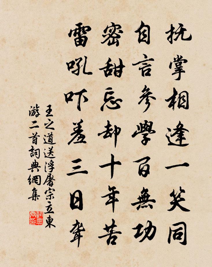 詩詞名句歷史字典書法欣賞書法字典國語詞典說文解字康熙字典古漢語字典標 題 作 者 詩 句 送浮屠宗立東遊二首作者:王之道 朝代:宋代送浮屠宗立東遊二首原文撫掌相逢一笑同,自言參學百無功。密甜忘卻十年苦,雷吼嚇羞三日聾。詩詞問答問:送浮屠宗立東遊二首的作者是誰?答:王之道問:送浮屠宗立東遊二首寫於哪個朝代?答:宋代王之道送浮屠宗立東遊二首書法欣賞送浮屠宗立東遊二首書法作品詩詞推薦端硯六絕陳宓〔宋代〕昔我高皇渡江日,擬將文治復輿圖。炎方不敢珍韶石,來獻君王寫禹謨。霜日許月卿〔宋代〕霜日步行遲,雲山復歷長。蘆花相遜揖,松樹自宮商,竹動鳴珂里,桃成衣錦鄉。水邊籬落好,一夜玉為堂。謝惠楮衾艾性夫〔宋代〕厚於布被擁公孫,清似荷衣伴屈原。卷送春雲香入夢,剪成秋水淡無痕。五更葭琯噓寒谷,一榻梅花近雪村。直作漁父詞薛師石〔宋代〕鄰家船上小姑兒,相問如何是別離,雙墮髻,一彎眉,愛看紅鱗比目魚。次韻酬答陳席慶伯見貽二首趙蕃〔宋代〕詩成每輒肺肝愁,那與人充耳目謀。敢謂老懷千里志,故憐飢作四方游。若人尚隱南山霧,老我合從春水鷗。舊契夢藤驛陸游〔宋代〕倦馬投孤驛,一峰青壓門。蕭條秋浦路,荒陋夜郎村。地瘴霜常薄,林深日易昏。百年常作客,排悶近清樽。初冬快晴陪宣卿叔夏遊石頭庵過三生藏窮深極胡寅〔宋代〕鞭笞鸞鳳地行仙,變化鵾鵬背負天。他日寓言真二九,只今功行已三千。送崔子淵秘丞出守小益二首李流謙〔宋代〕晉安幕府總豪英,末至非才愧長卿。已去化爐金尚躍,更分客袂涕空橫。早催劍棧迎千騎,更借湖山勸一觥。水自頌古二十九首釋師體〔宋代〕甘贄設白粥,南泉費鹽醋。彼此落便宜,至今斷來路。題鳳凰台劉過〔宋代〕公子飄然有俊才,此台翻覺在塵埃。江淮浩渺洲渚沒,鳳鳥寂寥鴻雁來。時事不言惟拄笏,書生無用且銜杯。生平次韻胡梅瀧許月卿六〔宋代〕對梅花每恨匆匆,竟日望斷胡梅瀧。欲往從之秋水隔,參橫月落夢渠儂。丞相大資葉公輓詞喻良能〔宋代〕雙谿鍾地讖,一相破天荒。道至黃扉重,勛由紫府昌。堤成歡百辟,台坼泣群方。盛烈銘鐘鼎,千秋耿不忘。別朱子大蘇名叟趙汝唫〔宋代〕薄宦塵埃易滿襟,問盟猶喜盍朋簪。只今風月一杯酒,他日雲山{千右下加一點}里心。楊柳陰疎秋館靜,芙蓉香燈鄭谷〔唐代〕雨向莎階滴未休,冷光孤恨兩悠悠。船中聞雁洞庭宿,床下有蛩長信秋。背照翠簾新灑別,不挑紅燼正含愁。蕭騷和路樞四首胡寅〔宋代〕圖書雖是舊生涯,翰墨那能剡國華。戲彩便甘甜五馬,退朝猶想覆千花。先民事業高三代,將聖春秋自一家。他日雨中寄元宗簡張籍〔唐代〕秋堂羸病起,盥漱風雨朝。竹影冷疏澀,榆葉暗飄蕭。街徑多墜果,牆隅有蛻蜩。延瞻游步阻,獨坐閒思饒。君居曉出曾鞏〔宋代〕曉出城南羅卒乘,皂纛朱旗密相映。貔貅距躍良家子,鵝鸛彌縫司馬令。奪標一一飛步疾,盤槊兩兩翻身勁。霸上宗壇秋夕褚環中〔宋代〕疏綺平雲徹夜開,月明峰頂見樓台。璚璈聲里天燈近,知是三真謁帝回。達觀亭蔡襄〔宋代〕峭峻釣龍石,飛亭壓其端。曠徹四無際,因之名達觀。扳雲躋大庭,仙路何紆盤。秋明澄遠綠,晚霽凝新寒。城郭戊申年七夕五絕楊億〔宋代〕明河左界鵲南飛,漢苑高樓正曝衣。一夕匆匆停弄杼,誰將錦石暫支機。名句推薦儒有博學而不窮,篤行而不倦戴聖《禮記·儒行》 一枕新愁,殘夜花香月滿樓。項鴻祚《減字木蘭花·春夜聞隔牆歌吹聲》 夫子循循然善誘人孔子弟子《論語·子罕篇》 後其身而身先,外其身而身存。老子《老子·道經·第七章》 君自故鄉來,應知故鄉事。王維《雜詩三首·其二》 道私者亂,道法者治。韓非及後人《韓非子·詭使》 一字無題外,落葉都愁。張炎《八聲甘州·記玉關踏雪事清游》 天子,兵強馬壯者當為之,寧有種耶!薛居正《舊五代史·後晉·列傳十三》 滿月飛明鏡,歸心折大刀。杜甫《八月十五夜月二首》 燕子不知人去也,飛認闌乾。韓疁《浪淘沙·莫上玉樓看》