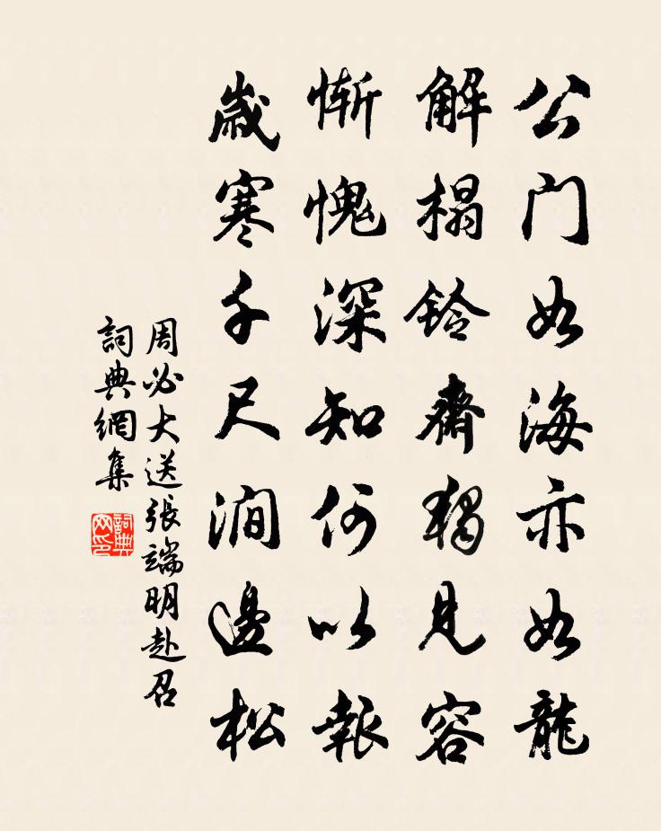 詩詞名句歷史字典書法欣賞書法字典國語詞典說文解字康熙字典古漢語字典標 題 作 者 詩 句 送張端明赴召作者:周必大 朝代:宋代送張端明赴召原文公門如海亦如龍,解榻鈴齋獨見容。慚愧深知何以報,歲寒千尺澗邊松。詩詞問答問:送張端明赴召的作者是誰?答:周必大問:送張端明赴召寫於哪個朝代?答:宋代周必大送張端明赴召書法欣賞送張端明赴召書法作品詩詞推薦張德夫園亭八詠山椒王炎〔宋代〕百尺雲根老,斑斑長綠苔。幽尋穿窈眺步崔嵬。地脈元無此,人心亦巧哉。千年湖底石,幻作小飛來。句晏殊〔宋代〕一年為客未歸去,笑殺城東桃李花。寓居南軒朱槔〔宋代〕雲氣披猖月意孤,冬青倒影上庭隅。燈橫老薺蛾方法,書掩新芸蠹已無。一世盡知關魯酒,十年不擬嘆齊竽。支頤廣中二首王阮〔宋代〕黑金不肯化青金,奉命來催膽水淋。山骨舊疑天鑿透,溝流唯待雨來深。丹無九轉如方士,政有三官出上林。卻謝雨夜宿龍門曉登靈光台禮佛眼塔釋正覺〔宋代〕一躍龍門適舊懷,稜稜浪級向人開。洗塵雲陣澆華雨,借力天衢破蟄雷。略彴駕溪桃水滿,浮屠瘞骨玉山頹。欲知少年游陳師道〔宋代〕御園果子壓枝繁。看看分摘無緣。團沙弄雪,勞心費手,不肯暫時圓。賽神舊願心兒有,終了待、幾時還。芍藥梢當塗趙炎少府粉圖山水歌李白〔唐代〕峨眉高出西極天,羅浮直與南溟連。名公繹思揮彩筆,驅山走海置眼前。滿堂空翠如可掃,赤城霞氣蒼梧煙。洞庭和張文紀詠雪二首王之道〔宋代〕萬境沉沉夜氣嚴,廣寒初下水晶簾。三杯強沃澆腸酒,一捻聊分暖硯鹽。已恨梅梢遭挫折,可堪風物為般添。才高十二時/憶少年佚名〔宋代〕炎圖景運正延鴻。文思坐深宮。慈寧大養,樂事時奏宸聰。皇齡永,恩霈下,遍寰中。君王乘彩服,嬪御上瑤鍾。句向郎中〔宋代〕惟洪一都會,控帶荊與甌。水調歌頭(清明嚴瀨)韓淲〔宋代〕今古釣台下,行客系扁舟。扁舟何似,雲山千疊亦東遊。我欲停橈一醉,與寫平生幽憤,橫管更清謳。小上客星閣蝶戀花陸游〔宋代〕水漾萍根風卷絮。倩笑嬌顰,忍記逢迎處。只有夢魂能再遇。堪嗟夢不由人做。夢若由人何處去。短帽輕衫,夜夜送思齊上人之宣城林逋〔宋代〕林嶺藹春暉,程程入翠微。泉聲落坐石,花氣上行衣。詩正情懷澹,禪高論語稀。蕭閒水西寺,駐錫莫忘歸。舟中偶書陸游〔宋代〕老子西遊萬里回,江行長夏亦佳哉!晝眠初起報茶熟,宿酒半醒聞雨來。漢口船開催疊鼓,淮南帆落亞高桅。四方初夏登北山衛宗武〔宋代〕推篷數峰出,野色弄新晴。雷復陽初長,雪消山更青。嶺坳孤塔露,木杪片雲生。何日塵緣了,來尋猿鶴盟。菊花十二首史鑄〔宋代〕籬菊含風暗度香,栽多不為待重陽。愈風明目須真物,夢寐宜人入枕囊。鷓鴣天(荊州別同官)張孝祥〔宋代〕又向荊州住半年。西風催放五湖船。來時露菊團金顆,去日池荷疊綠錢。斟別酒,扣離弦。一時賓從最多賢。今宵回文絕句黃公度〔宋代〕歌闋一尊清晝長,曲池小景晚風涼。波微動處見魚戲,荷半開時過雨香。送夢石歸妙峰德雲庵釋慧空〔宋代〕紹興五年戊寅冬,王母吞卻嘉州像。覺來捫腹喜且驚,一朝生出這和尚。銳頭長身碧兩瞳,眾聚說法聲如鍾。少年驟寒鄭獬〔宋代〕四擁蒼雲拂浪驚,北風飛下海濤聲。水搖冰骨凍未得,雨作雪花開不成。玉匣寶力鋒欲折,鐵衣戰騎力還生。杏梢名句推薦好風朧月清明夜,碧砌紅軒刺史家。白居易《清明夜》 林花著雨胭脂濕,水荇牽風翠帶長。杜甫《曲江對雨》 卻嫌脂粉污顏色,淡掃蛾眉朝至尊。張祜《集靈台·其二》 將軍玉帳貂鼠衣,手持酒杯看雪飛。劉基《北風行》 離愁漸遠漸無窮,迢迢不斷如春水。歐陽修《踏莎行·候館梅殘》 今年海角天涯。蕭蕭兩鬢生華。李清照《清平樂·年年雪裡》 紅酥手,黃縢酒,滿城春色宮牆柳。陸游《釵頭鳳·紅酥手》 懷春情不斷,猶帶相思舊子。吳文英《丁香結·夷則商秋日海棠》 楊柳散和風,青山澹吾慮。韋應物《東郊》 知者樂水,仁者樂山。孔子弟子《論語·雍也篇》