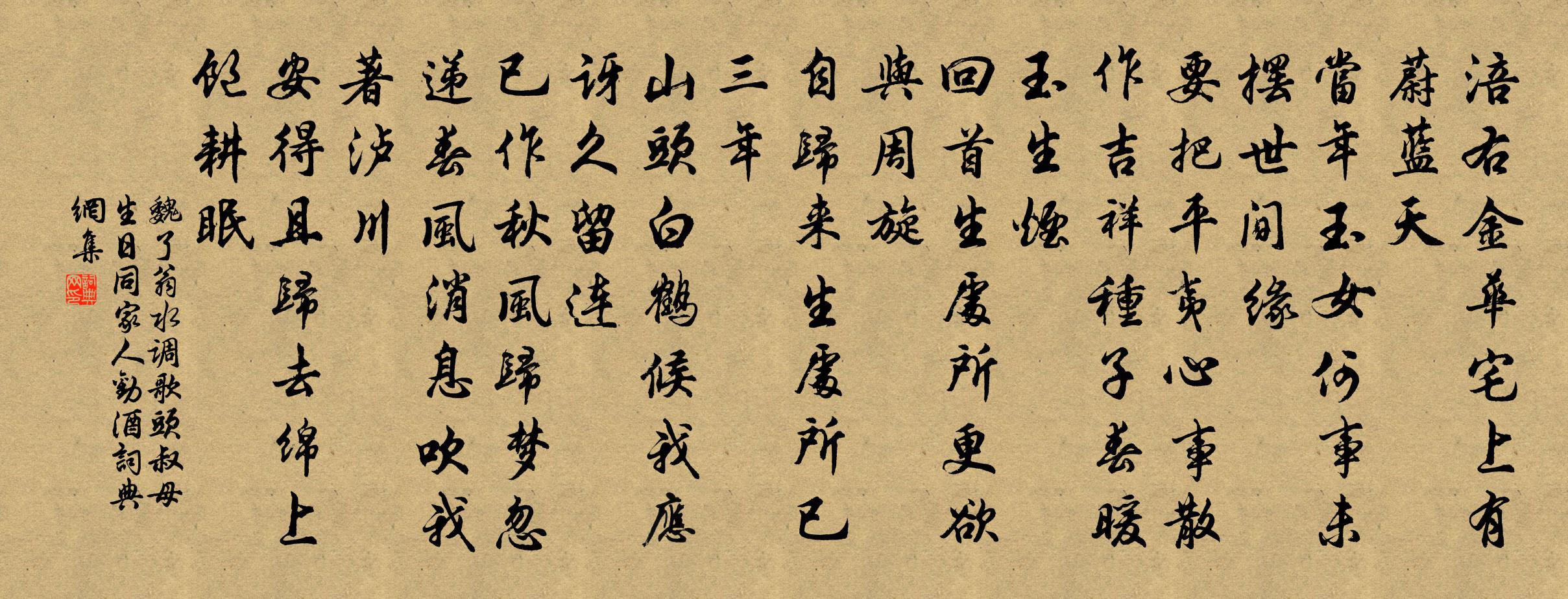 詩詞名句歷史字典書法欣賞書法字典國語詞典說文解字康熙字典古漢語字典標 題 作 者 詩 句 水調歌頭(叔母生日同家人勸酒)作者:魏了翁 朝代:宋代原文涪右金華宅,上有蔚藍天。當年玉女何事,未擺世間緣。要把平夷心事,散作吉祥種子,春暖玉生煙。回首生處所,更欲與周旋。自歸來,生處所,已三年。山頭白鶴候我,應訝久留連。已作秋風歸夢,忽遞春風訊息,吹我著瀘川。安得且歸去,綿上飽耕眠。詩詞問答問:《水調歌頭(叔母生日同家人勸酒)》的作者是誰?答:魏了翁問:該詩寫於哪個朝代?答:宋代問:該詩是什麼體裁?答:詞書法欣賞水調歌頭(叔母生日同家人勸酒)書法作品詩詞推薦郴江百詠並序醽醁泉阮閱〔宋代〕玉為麴櫱石為壚,萬榼千壺汲未枯。山下家家有醇酒,釀時皆用此泉無。呈公擇二首趙蕃〔宋代〕此地無此客,若人吾故人。論文皆意到,出語見情真。未議作輕別,且當留浹旬。畦蔬飽春雨,小摘未妨頻。題菊鄉亭陳杰〔宋代〕晉朝徵士種菊處,滿地蒼雲無古今。漫喜孤亭初結構,每懷高節此登臨。南山日入輸佳氣,北闕天長馳寸心。瞻眺次韻酬朱昌叔五首王安石〔宋代〕樂世閒身豈易求,岩居川觀更何憂。放懷自事如初服,買宅相招亦本謀。名譽子真矜谷口,事功新息困壺頭。知君山中戲問韋侍御白居易〔唐代〕我抱棲雲志,君懷濟世才。常吟反招隱,那得入山來?詠蚊范仲淹〔宋代〕飽去櫻桃重,飢來柳絮輕。但知離此去,不用問前程。漁父吳鎮〔元代〕紅葉村西夕照餘。黃蘆灘畔月痕初。輕撥棹,且歸歟。掛起漁竿不釣和葉徵君見寄二首曹勛〔宋代〕誠心接物定吾曹,藹藹風期意甚高。每謂交梨同火棗,何殊兔角與龜毛。道真不契君宜問,來日無多我豈沈。但喜和長溪葉潘投贈韻劉克莊〔宋代〕脯麟炮鳳飲鯨吞,肯學寒儒齧菜根。琴古無階登舜殿,詩窮作崇客羌村。可憐書畫科俱廢,誰謂文章技未尊。世上高士詠黔婁先生吳筠〔唐代〕黔婁蘊雅操,守約遺代華。淡然常有怡,與物固無瑕。哲妻配明德,既沒辯正邪。辭祿乃余貴,表謚良可嘉。沁園春劉克莊〔宋代〕華發布蕭蕭,歸布碧雞坊,出金馬門。把一枝色筆,擲還郭璞,些兒殘錦,回乞天孫。永免朝參,更無宣鎖,送老田舍二首劉克莊〔宋代〕源里人家太古時,爭為雞黍款漁師。下山莫向城中說,第一休教太守知。訴衷情張掄〔宋代〕閒中一首醉時歌。此樂信無過。陽春自來寡和,誰與樂和。言不盡,意何多。且蹉跎。功名莫問,富貴休言,到底參議李郎中見和次韻奉酬喻良能〔宋代〕頃歲題名曲江院,及肩曾許亞宮牆。胸中闊貯雲夢澤,筆下濃薰班馬香。省直舊沾衾半白,除書行見紙新黃。和篇徑坂左司使君惠和近詩為親而喜合天理之公得趙汝騰〔宋代〕扶杖來觀遍老農,清朝新禮采芝翁。德尊韋布封員外,恩重牙緋視治中。言悟千秋逢主聖,躬行萬石耀臣工。求與過鑑湖陳著〔宋代〕越城勝境素來夸,才入東關分外嘉。八百頃荷西子態,幾千餘寺賀君家。畫屏山色饒煙水,麗錦天光落晚霞。惜景江郎峰李處權〔宋代〕壯此江郎峰,何年儼而峙。融結自太古,造化鍾一氣。屹然居獨尊,群峰俱不至。如冠劍大臥,廷諍而出位。大哉哭護國上人張謂〔唐代〕昔喜三身淨,今悲萬劫長。不應歸北斗,應是向西方。舍利眾生得,袈裟弟子將。鼠行殘藥碗,蟲網舊繩床。別起赴巴南書情寄故人劉長卿〔唐代〕南過三湘去,巴人此路偏。謫居秋瘴里,歸處夕陽邊。直道天何在,愁容鏡亦憐。裁書欲誰訴,無淚可潸然。賢者之孝二百四十首崔道固林同〔宋代〕是誰迫我母,持炙致諸賓。驚起自接取,雲賓此老親。名句推薦月傍苑樓燈影暗,風傳閣道馬蹄回。王守仁《元夕二首》 秋風吹地百草乾,華容碧影生晚寒。李賀《開愁歌》 古戍三秋雁,高台萬木風。屈大均《魯連台》 風蕭蕭兮易水寒,壯士一去兮不復還。佚名《荊軻歌 / 渡易水歌》 聞誅一夫紂矣,未聞弒君也。孟子《孟子·梁惠王章句下·第八節》 謙尊而光,卑而不可逾,君子之終也。佚名《易傳·彖傳上·謙》 人學始知道,不學亦徒然。佚名《增廣賢文·上集》 梧桐葉上,點點露珠零。尹鶚《臨江仙·深秋寒夜銀河靜》 有花堪折直須折,莫待無花空折枝。無名氏《雜詩》 昨日春如,十三女兒學繡。辛棄疾《粉蝶兒·和趙晉臣敷文賦落花》