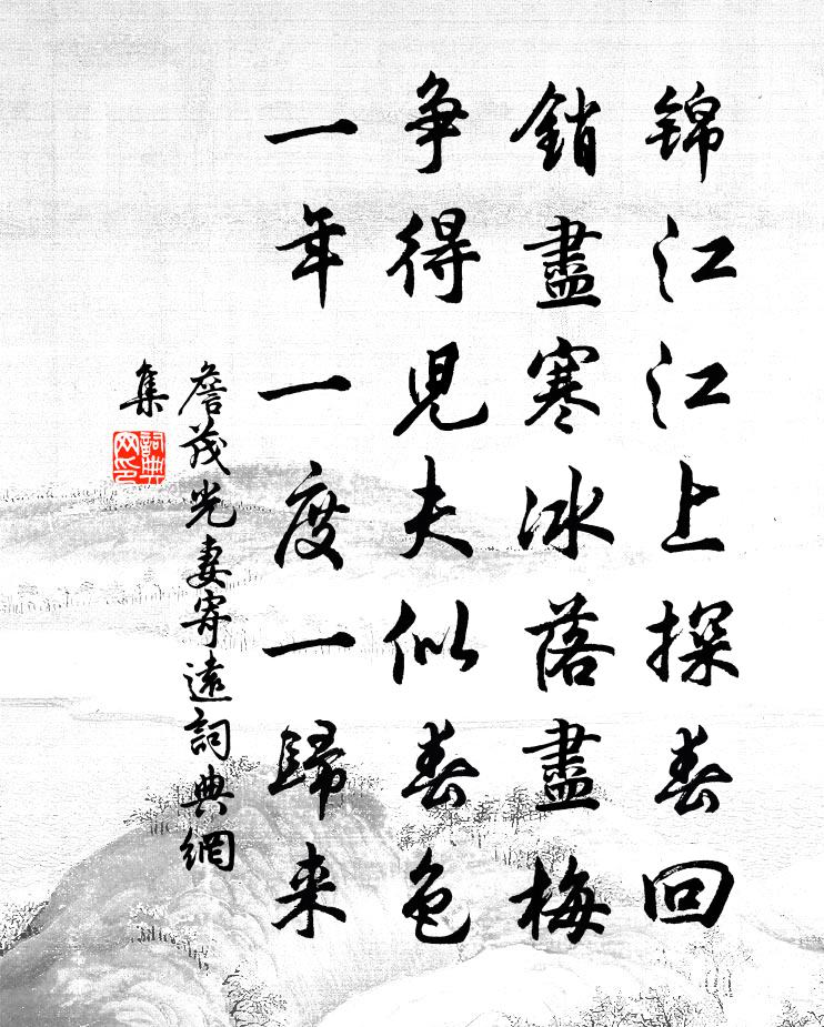 詩詞名句歷史字典書法欣賞書法字典國語詞典說文解字康熙字典古漢語字典標 題 作 者 詩 句 寄遠作者:詹茂光妻 朝代:宋代寄遠原文錦江江上探春回,銷盡寒冰落盡梅。爭得兒夫似春色,一年一度一歸來。詩詞問答問:寄遠的作者是誰?答:詹茂光妻問:寄遠寫於哪個朝代?答:宋代詹茂光妻寄遠書法欣賞寄遠書法作品詩詞推薦稻花桑花舒岳祥〔宋代〕稻花花中王,桑花花中後。余花畢嬪妃,以色媚左右。稻花吹早香。風露千萬畝。上以奉玉食,粢盛及醴酒。下以雜述林泳〔宋代〕關令著黃帝曰,柱史稱聖人云。俗學謾夸臆說,仙書猶述舊聞。題嶽麓道鄉台范成大〔宋代〕山外江水黃,江外滿城綠。城外杳無際,天低到平陸。長煙貫楚尾,遠勢帶吳蜀。故園東北望,遊子闌乾曲。小敷谷龍潭祠作王昌齡〔唐代〕崖谷噴疾流,地中有雷集。百泉勢相盪,巨石皆卻立。跳波沸崢嶸,深處不可挹。昏為蛟龍怒,清見雲雨入。靈怪玉樓春(文縝、倪巨濟、王元衷、蘇叔黨宴張子實家。侍人賀全真妙絕一時)向子諲〔宋代〕雲窗霧閣春風透。蝶繞蜂圍花氣漏。惱人風味恰如梅,倚醉腰肢全是柳。細傳一曲情偏厚。淡掃兩山緣底皺。歸時又和六首劉克莊〔宋代〕鄉縣俱叨析爵封,弟兄麾節愧慆悰。腐紅有兆寬枵腹,新淥無端照醜容。青草池荒休去蟈,黃梅雨歇近分龍。即今和王立之蠟梅二首晃沖之〔宋代〕茅簾竹塢兩幽奇,岸幘尋花醉亦知。崖蜜已成蜂去盡,夜寒惟有露房生。次韻李曼朝散得郡西歸留別二首蘇轍〔宋代〕風波定後得西歸,烏鵲喧呼里巷知。未熟黃粱驚破夢,相看白髮信乘危。豚肩尚有冬深味,蠶器應逢市合時。父老襄陽蹋蹄歌 二蕭衍〔南北朝〕草樹非一香。花葉百種色。寄語故情人。知我心相憶。次韻伯父茶花蘇籀〔宋代〕烏咮傾藍雨春霽,瓊芳入眼霧冬昏。一枝膚雪壺中曜,靜幾低窗養晏溫。送僧休復之京師林逋〔宋代〕金錫指歸鴻,田衣獵曉風。春江片席遠,松月一房空。新句別離後,舊山魂夢中。到京當袖刺,館閣盡名公。賀新郎曾晞顏〔宋代〕富貴人間有。就如今,秤量陰德,還公最厚。一郡鶻崙全似舊,春滿霜疇稻畝。近帳外、干將夜吼。直指禾川弄霆天光觀句士良〔宋代〕古殿千年屋,高松百尺陰。真人不可問,時有鶴遺音。鴟鴞佚名〔先秦〕鴟鴞鴟鴞,既取我子,無毀我室。恩斯勤斯,鬻子之閔斯。迨天之未陰雨,徹彼桑土,綢繆牖戶。今女下民,或敢次韻臨安趙丞讀紹運圖洪咨夔〔宋代〕燧農以前疑傳疑,理耶亂耶難盡知。唐虞三代號極治,說著已是令人悲。古來神器付有德,人心天命何容私。使朱漫興十一首趙蕃〔宋代〕望極平湖不得山,水長山遠畫圖間。賦詩不似王摩詰,湖北湖南空往還。過紫嵩菴宋庠〔宋代〕新結禪菴當小齋,見山何必上高台。嵩岩更似知音賞,雨罷先供翠色來。和監丞去歲賦岩桂王洋〔宋代〕南方火老不告疲,秋物過半新涼時。嫦娥剪花趙時節,新月借色天風吹。平生仰望婆娑影,一日坐對連蜷枝。異時雜詩四首黃庭堅〔宋代〕佛子身歸樂國遙,至人神會碧天寥。劫灰沈盡還生妄,但向平沙看海潮。送周密學真定安扶使司馬光〔宋代〕玉帳前芭舉,銅魚左契舂。平生公望著,期月政聲聞。陌上壺漿隘,潭邊花氣曛。遙知待新將,民物兩欣欣。名句推薦春草細還生,春雛養漸成。揭傒斯《畫鴨》 時見幽人獨往來,縹緲孤鴻影。蘇軾《卜運算元·黃州定慧院寓居作》 相呼相應湘江闊,苦竹叢深日向西。鄭谷《鷓鴣》 臣下之勸勞灼見,生民之疾苦周知。宋濂、王褘《元史·列傳·卷一》 君不見,黃河之水天上來,奔流到海不復回。李白《將進酒》 黃師塔前江水東,春光懶困倚微風。杜甫《江畔獨步尋花·其五》 分不盡,半涼天。可憐閒剩此嬋娟。吳文英《思佳客·閏中秋》 安民可與為義,而危民易與為非賈誼《過秦論》 長風破浪會有時,直掛雲帆濟滄海。李白《行路難·其一》 誰念文園病客?夜色沉沉,獨抱一天岑寂。張埜《奪錦標·七夕》