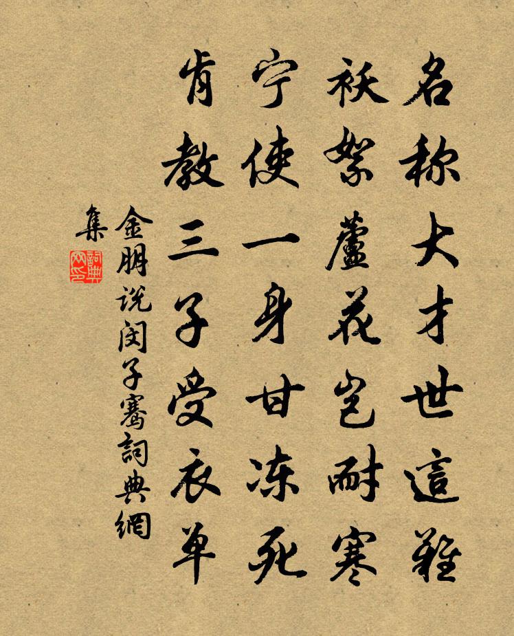 詩詞名句歷史字典書法欣賞書法字典國語詞典說文解字康熙字典古漢語字典標 題 作 者 詩 句 閔子騫作者:金朋說 朝代:宋代閔子騫原文名稱大才世這難,襖絮蘆花豈耐寒。寧使一身甘凍死,肯教三子受衣單。詩詞問答問:閔子騫的作者是誰?答:金朋說問:閔子騫寫於哪個朝代?答:宋代金朋說閔子騫書法欣賞閔子騫書法作品詩詞推薦生查子(簡子似)辛棄疾〔宋代〕高人千丈崖,千古儲冰雪。六月火雲時,一見森毛髮。俗人如盜泉,照眼多昏濁。高處掛吾瓢,不飲吾寧渴。挽張元常葬母夫人二首宋祁〔宋代〕嬰病曾無苦,期頤未滿年。風酸吹棘地,露泣采蘭天。庀具藏分澤,張琴委暗絃。江流終不竭,懿範此俱傳。挽蕭知縣二首陳淳〔宋代〕資稟於人異,天鍾自粹夷。懷才無表襮,制行絕瑕疵。孝比王祥篤,知機下惠遺。鄉閭稱厚德,已矣但長噫。□□長老住寧國光孝寺並題雪磯三絕劉克莊〔宋代〕昔把釣竿垂,今拈拂子揮。磯邊漚鳥問,師出幾時歸。桐柏崇道觀張無夢〔宋代〕桐柏觀周匝,千峰累翠螺。地高陰氣少,天近日光多。三井雲雷起,一壇鸞鶴過。誰言紫微後,無客繼仙科。春盡日游後湖贈劉起居(劉時方燒藥)徐鉉〔唐代〕今朝湖上送春歸,萬頃澄波照白髭。笑折殘花勸君酒,金凡成熟是何時。碧桃春/阮郎歸丁持正〔宋代〕幾年辛苦搗元霜。一朝瓊粉香。雲英縹渺曳仙裳。相將騎鳳凰。鍧帝樂,酌天漿。千年顏色芳。從茲歸去白雲鄉。踏莎行晏幾道〔宋代〕綠徑穿花,紅樓壓水。尋芳誤到蓬萊地。玉顏人是蕊珠仙,相逢展盡雙蛾翠。夢草閒眠,流觴淺醉。一春總見瀛洲次李參政所和五絕句韻因以為詩魏了翁〔宋代〕漠漠煙塵連北道,幽幽草樹蔽南山。照人明月長無寐,繞遍清風五百間。賀張十八秘書得裴司空馬(或作酬張秘書因騎馬贈詩)韓愈〔唐代〕司空遠寄養初成,毛色桃花眼鏡明。落日已曾交轡語,春風還擬並鞍行。長令奴僕知饑渴,須著賢良待性情。旦夕哀馬梅堯臣〔宋代〕瘠彼單于馬,贈我信都侯。信都惡頑惡,不使服車輈。我從南土歸,涉河假扁舟。將趨未央朝,無乘誰可求。信都送周思道再知漢州三首范祖禹〔宋代〕千山行盡見平川,雞犬相聞俗晏然。父 * 知仁聖意,十年重借使君賢。自敘杜建徽〔唐代〕中劍斫耳缺,被箭射胛過。為將須有膽,有膽即無賈。扇子詩李石〔宋代〕親風廬山面目來,翻經台上月輪開。山間長物渾無用,多斫雲根入蜀栽。安城即事三首陶弼〔宋代〕金鼓聲闌劍戟收,使君回上雅歌樓。樽前一節清商曲,銷盡窮邊萬里愁。謁岱祠即事晁補之〔宋代〕澤南三百里,極望橫天雲。雲端色凝黛,諦視初可分。崢嶸介丘像,澒洞元氣屯。頃刻有變化,慘澹殊明昏。天行衢州近城果園楊萬里〔宋代〕未到衢州五里時,果林一望蔽江湄。黃柑綠橘深紅柿,樹樹無風縋脫枝。八月二十九日宿懷趙嘏〔唐代〕秋天睛日菊還香,獨坐書齋思已長。無奈風光易流轉,強須傾酒一杯觴。擬古閨怨三首王炎〔宋代〕良人久在外,想像裁香羅。放下金粟尺,無言顰翠蛾。題思婦陳杰〔宋代〕碧天無過雁,芳草靜遊人。深院綠雲曉,滿階紅雨春。釵鸞慷照影,簫鳳暗棲塵。鄰女焉知事,終朝學美矉。名句推薦居移氣,養移體。孟子《孟子·盡心章句上·第三十六節》 好一似食盡鳥投林,落了片白茫茫大地真乾淨。曹雪芹《紅樓夢·第五回》 今朝北客思歸去,回入紇那披綠羅。劉禹錫《竹枝詞二首·其二》 歡言得所憩,美酒聊共揮。李白《下終南山過斛斯山人宿置酒》 三月休聽夜雨,如今不是催花。張炎《清平樂·采芳人杳》 夜喧山門店,獨宿不安席。韋應物《聽嘉陵江水聲寄深上人》 數人世相逢,百年歡笑,能得幾回又。何夢桂《摸魚兒·記年時人人何處》 審定有無與其實虛,隨其嗜欲以見其志意。王詡《鬼谷子·捭闔》 君在陰兮影不見,君依光兮妾所願。傅玄《車遙遙篇》 大風起兮雲飛揚。威加海內兮歸故鄉。劉邦《大風歌》