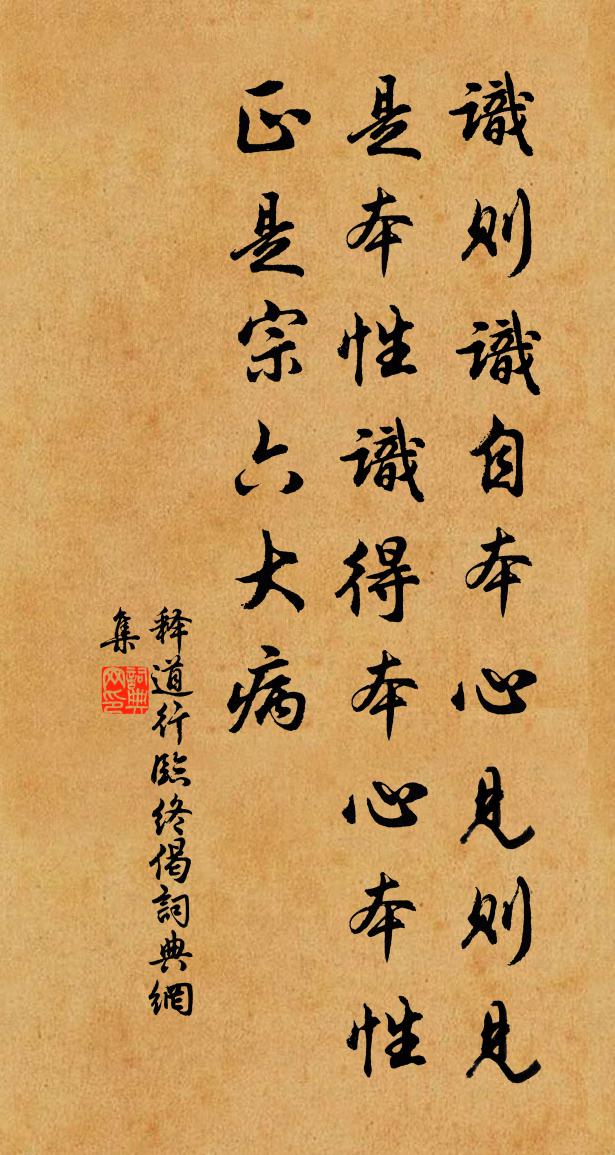 詩詞名句歷史字典書法欣賞書法字典國語詞典說文解字康熙字典古漢語字典標 題 作 者 詩 句 臨終偈作者:釋道行 朝代:宋代臨終偈原文識則識自本心,見則見是本性。識得本心本性,正是宗六大病。詩詞問答問:臨終偈的作者是誰?答:釋道行問:臨終偈寫於哪個朝代?答:宋代釋道行臨終偈書法欣賞臨終偈書法作品詩詞推薦小舟航湖夜歸書觸目陸游〔宋代〕電掣半空雲黯黮,船浮積水浪憑陵。茫然不辨身何處,猶喜東南見塔燈。歲暮雜感十首曾國藩〔清代〕擬學坡公饋歲詩,花箋何處寄相思?陽和未老貂先敝,暖氣初回鳥竟知。遊子情懷隨地遠,天家雨露及時施。小儒西歸七首次韻和泗州十五叔父五晁補之〔宋代〕驅馬馬走山,回車車漸水,塗窮我何適,慟哭盈襟淚,巢居識風聲,穴藏知雨意,救斗曾得傷,纓冠亦可已,駱駝橋袁說友〔宋代〕家住水雲窟,路分苕霅溪。天高橫蝃蝀,水闊跨鯨鯢。卷浪去還卻,行人東望西。帆檣驚歲月,橋柱幾人題。臨江仙(十一月二十六日,雪霽,行武陵道中,江山瑩徹,不類人世)管鑒〔宋代〕昨日武陵溪上雪,今朝特地開晴。故留佳景付行人。瓊田千頃熟,琪樹萬株春。好是長松飄墜屑,天花時下繽紛。和周明瞻秋香五首吳芾〔宋代〕月窟仙人冷淡妝,鵝黃衫子翠羅裳。雖無妖艷夸塵俗,別是人家一種香。減字木蘭花倪偁〔宋代〕超然遠覽。是我輩人方俱眼。默想江湖。何處山川略得如。涼秋最勝。萬頃芙蕖蓋明鏡。更乞清詩。要見胸中一吐崇禧給事同年馬兄輓辭二首王安石〔宋代〕藏室亡三篋,得之公最多。露曦當晚景,川逝作前波。惠寄輿人誦。悲傳挽者歌。竹西攜手處,清淚邈山河。書懷二首趙蕃〔宋代〕要令多病也身輕,安得晨風永晝清。瑟瑟泉流沿澗響,疏疏鬆吹轉空鳴。生平舊隱蘚蹤合,老至危途蓬鬢生。松柏漁家傲侯善淵〔元代〕日照陽魂空中煉。璇璣運斡天網轉。咫尺眼前人不見。通一線。爐開鼎裂天光現。瑞散瓊花飛片片。香風暗拂靈雯龜山道中吳則禮〔宋代〕久著南冠殊未痴,長淮水暖鱭魚肥。更無一點蔫紅在,只有楊花作陣飛。五里三灘文同〔宋代〕群石壅水成哀湍,五里之地凡三灘。船如走丸勢不住,力適萬弩雲濤盤。門窗掩塞怕飛浪,已倒床座翻杯槃。長年國語引諺先秦無名〔先秦〕獸惡其綱。民惡其上。眾心成城。眾口鑠金。從善如登。從惡如崩。黍稷無成。不能為榮。黍不為黍。稷不為稷。冬日野望寄李贊府於良史〔唐代〕地際朝陽滿,天邊宿霧收。風兼殘雪起,河帶斷冰流。北闕馳心極,南圖尚旅遊。登臨思不已,何處得銷愁。劉郎詩蘇泂〔宋代〕白髮劉郎意自悲,桃山還是欲花時。一生漂轉成何事,留得玄都數首詩。秋懷十首陳師道〔宋代〕昨日山中雲,今朝山下雨。牛羊沒禾黍,蟋蟀促機杼。磨刀洗盆瓮,社臘不勝數。豈無聚歛吏,觸手丞相怒。趙叔垕山堂安下其家適有喪事戴復古〔宋代〕一徑沿溪入,數椽松竹間。豈知人事變,自覺客身閒。採菊出尋酒,移床臥看山。蒼頭無可作,把釣過西灣。門前柳崔珏〔唐代〕門前蜀柳□知春,風淡暖煙愁 * 。將謂只栽郡樓下,不知迤邐連南津。南津柳色連南市,南市戎州三百里。夷陬句徐似道〔宋代〕北風萬籟自宮徵,南日一軒真袴襦。清平樂劉敞〔宋代〕小山叢桂。最有留人意。拂葉攀花無限思。雨濕濃香滿袂。別來過了秋光。翠簾昨夜新霜。多少月宮閒地,姮娥與名句推薦乘我大宛馬,撫我繁弱弓。張華《壯士篇》 君是南山遺愛守,我為劍外思歸客。蘇軾《滿江紅·江漢西來》 落花狼藉酒闌珊,笙歌醉夢間。李煜《阮郎歸·呈鄭王十二弟》 人老去西風白髮,蝶愁來明日黃花。張可久《折桂令·九日》 自古驕兵多致敗,從來輕敵少成功。羅貫中《三國演義·第六十九回》 曾苦傷春不忍聽,鳳城何處有花枝李商隱《流鶯》 庫無備兵,雖有義,不能征無義。墨子《墨子·05章 七患》 便縱有千種風情,更與何人說?柳永《雨霖鈴·寒蟬淒切》 池上憑闌愁無侶。奈此個、單棲情緒。柳永《甘草子·秋暮》 辭之待骨,如體之樹骸;情之含風,猶形之包氣。劉勰《文心雕龍·風骨》
