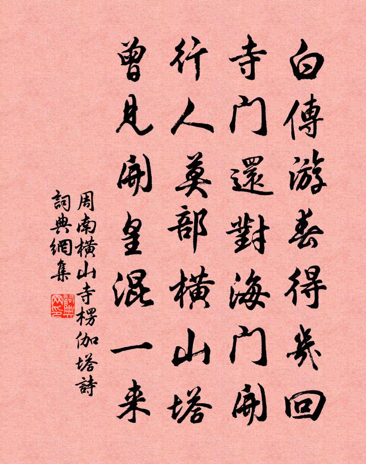 詩詞名句歷史字典書法欣賞書法字典國語詞典說文解字康熙字典古漢語字典標 題 作 者 詩 句 橫山寺楞伽塔詩作者:周南 朝代:宋代橫山寺楞伽塔詩原文白傳遊春得幾回,寺門還對海門開。行人莫部橫山塔,曾見開皇混一來。詩詞問答問:橫山寺楞伽塔詩的作者是誰?答:周南問:橫山寺楞伽塔詩寫於哪個朝代?答:宋代周南橫山寺楞伽塔詩書法欣賞橫山寺楞伽塔詩書法作品詩詞推薦薛嚴州輓詞葉適〔宋代〕瘴雨蠻煙盡掃清,釣台方軌淨無藤。堪憐獨立滄江上,不許朱轓更一登。題惠山園八景 尋詩徑乾隆〔清代〕岩壑有奇趣,煙雲無盡藏。石欄遮曲徑,春水漾方塘。新會忽於此,幽尋每異常。自然成迥句,底用錦為囊?夏商方回〔宋代〕牛下悲哀寧戚謳,捐湯置禹此何由。父初傳子風差薄,臣至乾君德轉輶。歸啟舊家猶幾在,升陑從旅已相仇。何人和眉山楊清龍淵小舫四絕句程公許〔宋代〕嬋娟倚市為誰好,膏火置身空自煎。何以濯纓歌一曲,秋江淼淼碧如天。又真止堂一首劉克莊〔宋代〕作堂肯以止為名,出處遙知講已精。縱使胸中橫綠野,未應度外置蒼生。波頹公獨能山立,漏盡人方喜夜行。千載送虔州通判周茂叔對移永州程師孟〔宋代〕移官遠過耒陽西,好景重重合盡題。永水自然勝灨水,浯溪應不讓濂溪。沙頭候吏瞻旗腳,境上鄉人待馬蹄。會是踏雲行馬鈺〔元代〕六出飄,萬峰聳翠。瓊花隕地風吹起。穿簾透幕逞逍遙,人前故要呈祥瑞。漁父莎披,子猷興至。高陽酒價重增江神子(建安懸戲趙德莊)韓元吉〔宋代〕十年此地看花時。醉題詩。夜彈棋。湖海相逢,曾共惜芳菲。前度劉郎今度客,嗟老矣,鬢成絲。江梅吹盡柳橋西中秋月廖凝〔唐代〕九十日秋色,今宵已半分。孤光含列宿,四面絕纖雲。眾木排疏影,寒流疊細紋。遙遙望丹桂,心緒正紛紛。金縷曲/賀新郎劉辰翁〔宋代〕問何年種植。獨成蹊、穠花爛漫,錦開千步。花下老人猶記我,不似那回賞處。並吹卻、道邊謝墅。黃四娘家今何偈六十九首釋道寧〔宋代〕選得幽居愜野情,終年無送復無迎。有時直上孤峰頂,月下披雲嘯一聲。古樂府文天祥〔宋代〕珊瑚香點胭脂雪,芙蓉帳壓春雲熱。明朝早弄燈前月,瀲灩九霞碧藕折。璇杓高聳婺女明,金波漾曉輝郎星。赤瓊啄木鳥李廌〔宋代〕小蟲蠹堅木,自意吻頰剛。蟠身宅幽竇,心期千歲藏。爾非虎而翼,何乃巧取將。剝啄繞樹腹,捲舌利鉤芒。一身夏夜陸游〔宋代〕散發荒池上,秋聲滿綠蒲。磷飛乘月暗,梟語似人呼。學問無新得,功名負壯圖。拾薪炊麥飯,隨事且枝梧。華亭吳江道中偶作十絕朱長文〔唐代〕賢哲多為貴勢拘,人人空道愛江湖。誰將五鼎盈前食,肯換秋風一箸鱸。再和謝朱叔止機宜投贈獎及南海集之句楊萬里〔宋代〕重陽風雨不全篇,春草池塘豈滿編。好句誰言較多少,古人信手斸方圓。自慚下下中中語,只合休休莫莫傅。珍重送趙普宋太宗〔宋代〕忠勤王室展宏謨,政事朝堂賴秉扶。解職暫酬卿所志,休教一念遠皇都。頌古三十六首釋惟一〔宋代〕老倒趙州無本據,翻手為雲覆手雨,覿面當機不覆藏,往往少人知落處。知落處,是甚閒家具。白狗峽范成大〔宋代〕江紋圓復破,樹色昏還明。連灘竹節稠,洶怒奔夷陵。石磯鐵色頑,相望如奸朋。踞岸意不佳,當流勢尤獰。山回岳市勝業寺禹柏戴復古〔宋代〕三千年老柏,怪怪復奇奇。剖彼一枯腹,離為九折枝。蟠根半生死,閱世幾興衰。神禹所栽植,山靈常護持。名句推薦可惜一溪風月,莫教踏碎瓊瑤。蘇軾《西江月·頃在黃州》 垂釣板橋東,雪壓蓑衣冷。釋敬安《題寒江釣雪圖》 陌上深深,依舊年時轍。王國維《蝶戀花·滿地霜華濃似雪》 藕花珠綴,猶似汗凝妝。閻選《臨江仙·雨停荷芰逗濃香》 拱木不生危,松柏不生埤。左丘明《國語·晉語·醫和視平公疾》 今夕不登樓,一年空過秋。高觀國《菩薩蠻·何須急管吹雲暝》 少婦今春意,良人昨夜情。沈佺期《雜詩三首·其三》 老來情味減,對別酒,怯流年。辛棄疾《木蘭花慢·滁州送范倅》 人生不滿百,常懷千歲憂。佚名《增廣賢文·上集》 鴻羽難憑芳信短,長安猶近歸期遠。盧祖皋《倦尋芳·香泥壘燕》