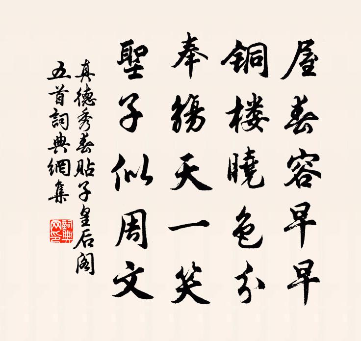 詩詞名句歷史字典書法欣賞書法字典國語詞典說文解字康熙字典古漢語字典標 題 作 者 詩 句 春貼子皇后閣五首作者:真德秀 朝代:宋代春貼子皇后閣五首原文屋春容早早,銅樓曉色分。奉觴天一笑,聖子似周文。詩詞問答問:春貼子皇后閣五首的作者是誰?答:真德秀問:春貼子皇后閣五首寫於哪個朝代?答:宋代真德秀春貼子皇后閣五首書法欣賞春貼子皇后閣五首書法作品詩詞推薦偈頌六十五首釋普濟〔宋代〕翳盡還明極,家鄉萬八千。懸崖重撒手,古劍髑髏前。哭孔戡白居易〔唐代〕洛陽誰不死,戡死聞長安。我是知戡者,聞之涕泫然。戡佐山東軍,非義不可乾。拂衣向西來,其道直如弦。從事與劉令食枸杞朱翌〔宋代〕周黨過仲叔,菽水無菜茹。我盤有枸杞,與子同一箸。若比閔縣令,已作方丈富。但令齒頰香,差免腥膻污。我壽金蓮出玉花 繼酒同監韻聯珠馬鈺〔元代〕心數歲。久休心成妙最。好心磨。琢心開疾似梭。飛玉性。上無瑕真自淨。有何愁。惱吾官心不休。知府孫學士見示和終南監宮太保道懷五首因以范仲淹〔宋代〕漢陂高興自飄飄,何必天台渡石橋。潭上藥靈多餌菊,林間詩逸半書蕉。勤歌蘭佩招逋隱,懶事塵纓逐采僚。客有緱山子晉祠以下陪太尉錢相公游嵩山七章其七梅堯臣〔宋代〕險絕稱漢關,晨躋瞻一室。盤紆石路回,迤邐雲峰出。古壁掛青蒼,天風起蕭瑟。洛城西首時,望望平煙密。芍藥·香清粉澹怨張泌〔唐代〕香清粉澹怨殘春,蝶翅蜂須戀蕊塵。閒倚晚風生悵望,靜留遲日學因循。休將薜荔為青瑣,好與玫瑰作近鄰。零落春晚課摘茶陳著〔宋代〕玉川子後是吾生,自課園中拾晚榮。攙雨金芒排世好,飽春香瓣見天成。不煩鉦鼓騰山噉,剩有旗槍戰酒兵。鳳舞早春十絕呈石湖陳造〔宋代〕虎丘僧宇瞰坡陀,幾許香軿載酒過。遊子花驄煙外駐,麗人塵襪水邊多。和放翁社日四首社日雨方岳〔宋代〕今茲淫春霖,曾不避甲子。荷鋤做秧田,歲欠三寸水。社戊占豐登,不以此故已。徑起觳觫公,鳴蓑共於耜。旅次銅山途中先寄溫州韓使君陳陶〔唐代〕亂山滄海曲,中有橫陽道。束馬過銅梁,苕華坐堪老。鳩鳴高崖裂,熊斗深樹倒。絕壑無坤維,重林失蒼昊。躋攀吾家二首於石〔宋代〕明月成三友,青山結四鄰。家貧猿執爨,林靜鳥司晨。好竹能醫俗,幽花不媚人。盤餐何所有,春韭與秋蓴。休日登城楊萬里〔宋代〕愛他休日更新晴,忍欲春寒上古城。廢壘荒蘆無一好春,來微徑總堪行。六和塔寺館三宿和秀江亭詩牌韻程公許〔宋代〕鯨呿鰲擲三神山,幻境起滅指顧間。東西帆穡來復去,得似上方僧獨間。看山看水知多少,詩債償殊未字了,膠膠雜詩四首王中立〔宋代〕獨跨蒼虬下太清,春風萬里月華明。因君感激為君說,鑿破天機我也驚。長春花鄭剛中〔宋代〕小蕊頻頻包碎綺,嫩紅日日醉朝霞。氣溫已是如三月,更向亭前堆落花。與蘇州守十詩以兵衛森畫戟燕寢凝清香為韻周麟之〔宋代〕青衫飄泊江海生,十年篷底載我行。每逢勝地一長望,江山舉目難為情。登樓幾作仲宣賦,在野猶帶倪寬經。邇來次韻石秀才淮上偶作鄭獬〔宋代〕出汴忽如魚脫網,長淮萬里斷煩囂。白雲已抱日光轉,碧浪更和天面搖。自此乘槎須犯斗,誰能鞭石解為橋。玉京蚤秋文天祥〔宋代〕寒魄澹玄河,商飆慓明發。羈人坐環堵,壯士衣穿褐。晉陵誰復新,秦陵尚雲秣。夫君百世心,患不在饑渴。八聲甘州 近里有妄男子,為妻所後,遂忿而梁寅〔元代〕獨守無妄,既歷十五年,夫竟旅困羞歸,而妻能潔以自守,獨理其家,因記年時波盪兩鴛鴦,雌雄各分流。恨郎情名句推薦荒城臨古渡,落日滿秋山。王維《歸嵩山作》 落絮無聲春墮淚,行雲有影月含羞。吳文英《浣溪沙·門隔花深夢舊遊》 兩岸人家微雨後,收紅豆,樹底纖纖抬素手。歐陽炯《南鄉子·路入南中》 江山故宅空文藻,雲雨荒台豈夢思。杜甫《詠懷古蹟五首·其二》 國破山河在,城春草木深。杜甫《春望》 何處它年寄此生,山中江上總關情。虞集《院中獨坐》 只因一著錯,滿盤俱是空。馮夢龍《醒世恆言·卷八》 暗柳啼鴉,單衣佇立,小簾朱戶。周邦彥《瑣窗寒·寒食》 人孰無親,罪人慎察其宗。來俊臣《羅織經·固榮卷第六》 溪深古雪在,石斷寒泉流。李白《尋高鳳石門山中元丹丘》