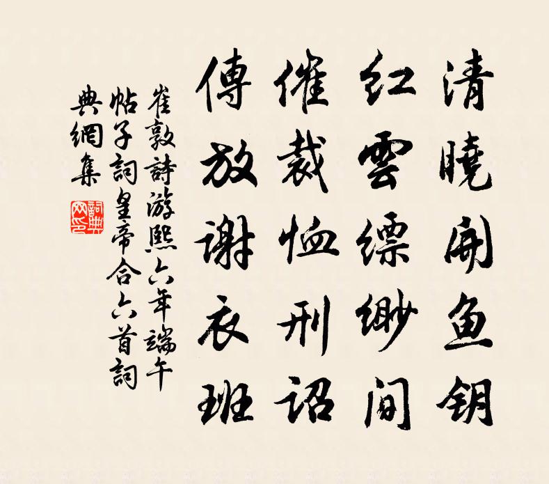 詩詞名句歷史字典書法欣賞書法字典國語詞典說文解字康熙字典古漢語字典標 題 作 者 詩 句 游熙六年端午帖子詞皇帝合六首作者:崔敦詩 朝代:宋代原文清曉開魚鑰,紅雲縹緲間。催裁恤刑詔,傳放謝衣班。詩詞問答問:《游熙六年端午帖子詞皇帝合六首》的作者是誰?答:崔敦詩問:該詩寫於哪個朝代?答:宋代書法欣賞游熙六年端午帖子詞皇帝合六首書法作品詩詞推薦寒山贊釋智朋〔宋代〕五字忍飢吟,十年忘歸路。著不著大笑,一場吐不出。相似底句,是真文殊。無二文殊,蘇盧{左口右悉}唎,{送契公自桂陽赴南海無可〔唐代〕南行登嶺首,與俗洗煩埃。磬罷孤舟發,禪移積瘴開。中餐湘鳥下,朝講海人來。莫便將經卷,炎方去不回。六代祖師贊釋文禮〔宋代〕咄咄胡僧,齒缺面黑。滿口鄉談,無人譯得。只知結果自然成,不知滿地花狼藉。越來溪楊備〔宋代〕臨流何必吊前非,且說吳宮得意時。夾岸桃花煙水綠,畫船安穩載西施。和《思歸樂》白居易〔唐代〕山中不棲鳥,夜半聲嚶嚶。似道思歸樂,行人掩泣聽。皆疑此山路,遷客多南征。憂憤氣不散,結化為精靈。我謂懷歸杜牧〔唐代〕塵埃終日滿窗前,水態雲容思浩然。爭得便歸湘浦去,卻持竿上釣魚船。賦新繁周表權如詔亭陳昂〔明代〕封典寵岩穴,褒言華日星。其誰盡如詔,何暇更名亭。公昔善教子,家傳惟治經。當年雲榜揭,今日璽書形。籍已五月齋戒罷宴徹樂聞韋賓客皇甫郎中飲會亦稀…長句呈謝白居易〔唐代〕妓房匣鏡滿紅埃,酒庫封瓶生綠苔。居士爾時緣護戒,車公何事亦停杯。散齋香火今朝散,開素盤筵後日開。隨意憶皎然上人李端〔唐代〕未得從師去,人間萬事勞。雲門不可見,山木已應高。向日開柴戶,驚秋問敝袍。何由宿峰頂,窗里望波濤。明朝是歲除胡仲弓〔宋代〕明朝是歲聊,萍梗身如寄。年光馬行疾,時事令人醉。直語顯官嗔,上書明主棄。但作送窮文,慎勿言災異。野望趙汝鐩〔宋代〕一天秋色遠,千里病眸寬。野曠牛羊小,樓高風露寒。掃愁嫌酒薄,少事欲心安。溪友門前過,留魚薦晚餐。過杭州故宮謝翱〔宋代〕禾黍何人為守閽,落花台殿暗銷魂。朝元閣下歸來燕,不見前頭鸚鵡言。頌古一百二十一首釋宗杲〔宋代〕昧卻當陽個一著,牽來拽去互施呈。不知除卻王維手,更有何人畫得成。持國遺食梅堯臣〔宋代〕乞食非為貧,妻病妾且死。晨爨不暖釜,朝飯亦輟匕。遺我我所恤,食我我所恥。我恥曾我求,我恤寧我止。應乏李邦直見邀終日對臥南城亭上二首蘇轍〔宋代〕一徑坡陀草木間,孤亭勝絕俯川原。青天圖畫四山合,白晝雷霆百步喧。煙柳蕭條漁市遠,汀洲蒼莽白鷗翻。客舟南溪上種芙蓉楊萬里〔宋代〕夾水芙蓉密密栽,緣溪斜立照溪開。放教十里紅將去,不盡溪流不要回。和麴典設扈從東郊憶弟使往安西冬至日恨不得同申拜慶李嶠〔唐代〕玉關方叱馭,桂苑正陪輿。桓嶺嗟分翼,姜川限饋魚。雪花含□晚,雲葉帶荊舒。重此西流詠,彌傷南至初。十月九日與客飲忽記去年此時自錦屏歸山南道陸游〔宋代〕去年縱獵韓壇側,玉鞭自探南山雪。今年痛飲蜀江邊,金杯卻吸峨眉月。竹枝歌舞新教成,悽怨傳得三巴聲。城頭蘇武洲氈房夜坐汪元量〔宋代〕明發啟帳房,冷氣迸將入。飢鷹傍人飛,瘦馬對人立。禦寒挾貂裘,蒙頭帽氈笠。悽然絕火煙,陰雲壓身濕。賴有呈唐德輿兼寄呈可久三首趙蕃〔宋代〕白頭四海客,青眼幾何人。況復平生舊,端殊數面親。文聲雖益振,仕簿亦何屯。好在章江水,聊堪濯世塵。名句推薦遇沉沉不語之士,且莫輸心;見悻悻自好之人,應須防口。洪應明《菜根譚·概論》 今日重來訪,不見知音人。馮夢龍《警世通言·卷一》 上者驕,安其心以順。來俊臣《羅織經·事上卷第二》 少年辛苦終身事,莫向光陰惰寸功。杜荀鶴《題弟侄書堂》 堤上遊人逐畫船,拍堤春水四垂天。歐陽修《浣溪沙·堤上遊人逐畫船》 事莫明於有效,論莫定於有證王充《論衡·卷二十三·薄葬篇》 幽人歸獨臥,滯慮洗孤清。張九齡《感遇十二首》 梅須遜雪三分白,雪卻輸梅一段香。盧鉞《雪梅·其一》 滿腹詩書漫古今,頻年流落易傷心。宇文虛中《在金日作·選二》 寒食不多時,牡丹初賣。晁沖之《感皇恩·寒食不多時》