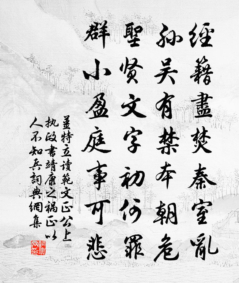 詩詞名句歷史字典書法欣賞書法字典國語詞典說文解字康熙字典古漢語字典標 題 作 者 詩 句 讀范文正公上執政書靖康之禍正以人不知兵作者:姜特立 朝代:宋代原文經籍盡焚秦室亂,孫吳有禁本朝危。聖賢文字初何罪,群小盈庭事可悲。詩詞問答問:《讀范文正公上執政書靖康之禍正以人不知兵》的作者是誰?答:姜特立問:該詩寫於哪個朝代?答:宋代書法欣賞讀范文正公上執政書靖康之禍正以人不知兵書法作品詩詞推薦轆轤體周文璞〔宋代〕野人無事時,常誦極玄時。寫遍千山寺,吟行九曲溪。誰為補天手,同是決雲兒。欲去無人問,今霄醉似泥。名姝詠梁鍠鍠〔唐代〕阿嬌年未多,弱體性能和。怕重愁拈鏡,憐輕喜曳羅。臨津雙洛浦,對月兩嫦娥。獨有荊王殿,時時暮雨過。秋宿長安韋主簿廳李洞〔唐代〕水木清涼夜直廳,愁人樓上唱寒更。坐勞同步簾前月,鼠動床頭印鎖聲。光宗皇帝輓詩二首周必大〔宋代〕仁愛周華夏,英聰貫古今。知人符日照,裕物稱天臨。閒退親傳子,憂勞舊損心。景光昭百世,昧谷謾西沉。禪人並化主寫真求贊釋正覺〔宋代〕太行盤紆,黃河泄舒。肝膽明潔,胸膺廓虛。清風未生齒頰,白雪已上眉須。少林之默無他說,黃梅之舂不識書。聞山中步虛聲施肩吾〔唐代〕何人步虛南峰頂,鶴唳九天霜月冷。仙詞偶逐東風來,誤飄數聲落塵境。多虞鄭谷〔唐代〕多虞難住人稀處,近耗渾無戰罷棋。向闕歸山俱未得,且沽春酒且吟詩。清平樂吳則禮〔宋代〕晨暉初轉。拜舞金鑾殿。想見對揚符睿春,天語丁寧見晚。雍容玉筍班聊,功名早上凌煙。金鼎刀圭莫惜,願隨雞和陶讀山海經十三首韻送機簡堂自景星岩再住吳芾〔宋代〕我與師來往,歲月雖未長。相看成二老,風流亦異常。既宴坐岩上,我方為聚糧。儻師能早歸,此樂猶示央。送彭子山提刑郎中赴召二首楊萬里〔宋代〕瓊樹初瞻二紀中,玉京再別一星終。我隨病鶴欹黃帽,公駕雲鴻上碧穹。寄徑絲綸紫薇閣,押班冠劍大明宮。錦園陸機宅楊備〔宋代〕陸家兄弟頗能文,入洛仍將筆硯焚。舊宅荊榛狐兔窟,機雲無復有昆雲。松竹堂釋文珦〔宋代〕玉立諸君子,蒼髯十八公。有此歲寒質,胡能媚東風。勿墮長房術,勿受秦皇封。深期老此堂,長與幽人同。冬至二首劉克莊〔宋代〕慈顏幽翳幾星霜,猶記斑衣共舉觴。老弟頗憐伯仁短,小孫突過阿宜長。親朋不至諳時態,兒女無知競曉妝。老退補樂府十篇帝有虞氏樂歌曹勛〔宋代〕草木繁蕪兮陰雨膏之,百穀豐衍兮寒暑成之。萬物護理兮元凱馴之,顧否德之弗類兮敢不允躬以承之。離南平晁公溯〔宋代〕晨光慘慘雜微霄,寒水濺濺更斷橋。風隕栗房開紫玉,煙蒙蘿幄疊青綃。官曹已畢三年考,客路深嗟萬里遙。從此擎山持杵釋印肅〔宋代〕擎山抱岳疾如風,持杵拈槌解脫空。世間有相非身大,須彌總納一塵中。至真州第五十九文天祥〔宋代〕萬里長江邊,去國同目粲。青山意不盡,皇天照嗟嘆。古意三首張耒〔宋代〕金鋪銀屈膝,動處有人挨。棋盤作十字,中心為子來。三月三日詩陸機〔魏晉〕遲遲暮春日。天氣柔且嘉。元吉隆初巳。濯穢游黃河。榕村田家趙文〔宋代〕門外蕭疏竹數行,小池聊可浴滄浪。木床留向竹陰下,兒踏田歸話晚涼。名句推薦花落家童未掃,鶯啼山客猶眠。王維《田園樂七首·其六》 貧賤之知不可忘,糟糠之妻不下堂。范曄《後漢書·列傳·伏侯宋蔡馮趙牟韋列傳》 淥水明秋月,南湖采白蘋。李白《淥水曲》 功名富貴逐世轉移,而氣節千載一時。洪應明《菜根譚·概論》 奔車之上無仲尼,覆舟之下無伯夷。韓非及後人《韓非子·安危》 千里馬常有,而伯樂不常有。韓愈《馬說》 自知者不怨人,知命者不怨天。荀子《荀子·榮辱》 三年羈旅客,今日又南冠。夏完淳《別雲間》 四百年來成一夢,堪愁。王安石《南鄉子·自古帝王州》 飲酒莫辭醉,醉多適不愁。高適《淇上送韋司倉往滑台》