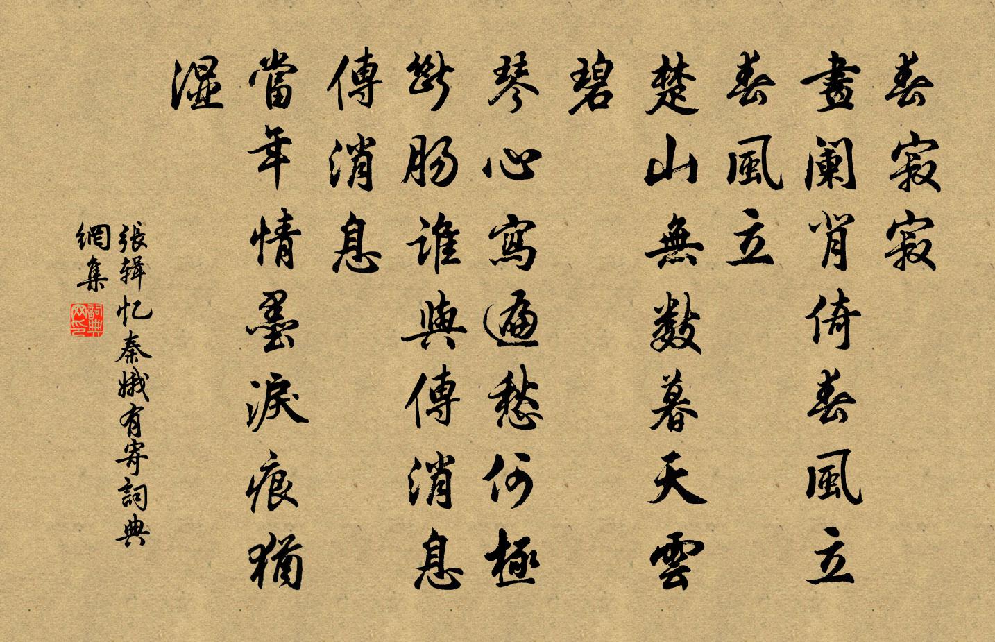 詩詞名句歷史字典書法欣賞書法字典國語詞典說文解字康熙字典古漢語字典標 題 作 者 詩 句 憶秦娥(有寄)作者:張輯 朝代:宋代憶秦娥(有寄)原文春寂寂。畫闌背倚春風立。春風立。楚山無數,暮天雲碧。琴心寫遍愁何極。斷腸誰與傳訊息。傳訊息。當年情墨,淚痕猶濕。詩詞問答問:憶秦娥(有寄)的作者是誰?答:張輯問:憶秦娥(有寄)寫於哪個朝代?答:宋代問:憶秦娥(有寄)是什麼體裁?答:詞張輯憶秦娥(有寄)書法欣賞憶秦娥(有寄)書法作品詩詞推薦正月六日雪霽曾鞏〔宋代〕雪消山水見精神,滿眼東風送早春。明日杏園應爛熳,但須期約看花人。南歌子佚名〔宋代〕禁苑沈沈靜,春波漾漾行。仙姿才韻兩相併。葉上題詩、千古得佳名。牆外分明見,花間隱約聲。銀鉤擲處眼雙明如夢令石孝友〔宋代〕折寄隴頭春信。香淺綠柔紅嫩。插向鬢雲邊,添得幾多風韻。但問。但問。管與玉容相稱。張七及辛大見尋南亭醉作(一作張七及辛大見訪)孟浩然〔唐代〕山公能飲酒,居士好彈箏。世外交初得,林中契已並。納涼風颯至,逃暑日將傾。便就南亭里,餘尊惜解酲。沁園春(問杜鵑)陳人傑〔宋代〕為問杜鵑,抵死催歸,汝胡不歸。似遼東白鶴,尚尋華表,海中玄鳥,猶記烏衣。吳蜀非遙,羽毛自好,合趁東風十一月十八日蒙恩再領沖佑鄰里來賀謝以長句陸游〔宋代〕綠章封事徹虛皇,黃紙除書降野堂。海上春常探先到,壺中日已不勝長。冰銜再署仙班貴,鶴料重支玉粒香。便掛送洛陽韓丞東遊韋應物〔唐代〕仙鳥遊戲何飄颻,遊戲綠衣翠為遊戲襟。顧我差池羽,咬咬懷好音。徘徊洛陽中,遊戲清川潯。神交不在結,歡愛十一月奉教作李嶠〔唐代〕凝陰結暮序,嚴氣肅長飆。霜犯狐裘夕,寒侵獸火朝。冰深遙架浦,雪凍近封條。平原已從獵,日暮整還鑣。郊廟歌辭。五郊樂章。肅和魏徵〔唐代〕眇眇方輿,蒼蒼圜蓋。至哉樞紐,宅中圖大。氣調四序,風和萬籟。祚我明德,時雍道泰。梅葉茵〔宋代〕溪橋一樹玉精神,香色中間集大成。疏影逼真前處士,群花推重老先生。春回隴首人千里,月到窗前夢五更。甚欲餞行省郎中王君祥王義山〔宋代〕以儒飾吏號通材,忽報曹裝打疊回。個樣歸舟惟載月,若為送客只將梅。雲凝春樹何堪別,晝永甘棠待再來。無限與寶覺宿精舍王安石〔宋代〕擾擾復翩翩,秋床燭屢昏。真為說萬物,豈止挾三言。問義曹溪室,捐書闕里門。若知同二妄,目擊道逾存。偈頌十八首釋道璨〔宋代〕天高地厚,日盈月昃。全提半提,天地懸隔。雨寒戲作陸游〔宋代〕掃園收槲葉,掊地甃塼爐。幸有藜烹粥,何慚紙作襦。婁忠簡公輓詞樓鑰〔宋代〕壯歲志先定,耆年氣不衰。治高為縣日,名重佐州時。雅望登朝著,忠言徹帝墀。亨途日千里,闊步不容遲。寄萬齊融李頎〔唐代〕名高不擇仕,委世隨虛舟。小邑常嘆屈,故鄉行可游。青楓半村戶,香稻盈田疇。為政日清淨,何人同海鷗。搖巾再賦漁舍姜特立〔宋代〕皆言漁者樂,不知漁者憂。方其未得魚,蓑雨立寒流。正可入圖畫,屋壁供王侯。呂尚與子陵,工釣漢與周。初不子進昆仲俱和寄懷三詩複次韻趙蕃〔宋代〕吉途荊棘少人行,制禮難招魯二生。世上兒曹俱覆輸,公家伯仲自爭衡。一年欲盡見松秀,眾水莫污知渭清。保此品令(族姑慶八十,來索俳語)辛棄疾〔宋代〕更休說。便是個、住世觀音菩薩。甚今年、容貌八十歲,見底道、才十八。莫獻壽星香燭。莫祝靈龜椿鶴。只消得和人見贈四首曹勛〔宋代〕新詩璀璨來蓬蓽,徑寸光搖白玉盤。二鹿已知煩細剪,一樽無乃輟餘歡。名句推薦仁者愛萬物而智者備禍於未形,不仁不智,何以為國?司馬遷《史記·趙世家》 願得此身長報國,何鬚生入玉門關。戴叔倫《塞上曲二首·其二》 治國者,必以奉法為重。羅貫中《三國演義·第九十六回》 夫因兵死守蓬茅,麻薴衣衫鬢髮焦。杜荀鶴《山中寡婦 / 時世行》 水色淥且明,令人思鏡湖。李白《登單父陶少府半月台》 福善之門莫美於和睦,患咎之首莫大於內離。班固《漢書·傳·宣元六王傳》 舊曲梅花唱,新正柏酒傳。孟浩然《歲除夜會樂城張少府宅》 秋色到空閨,夜掃梧桐葉。夏完淳《卜運算元·秋色到空閨》 謙謙君子,卑以自牧佚名《易傳·象傳上·謙》 燕子飛來窺畫棟,玉鉤垂下簾旌。歐陽修《臨江仙·柳外輕雷池上雨》