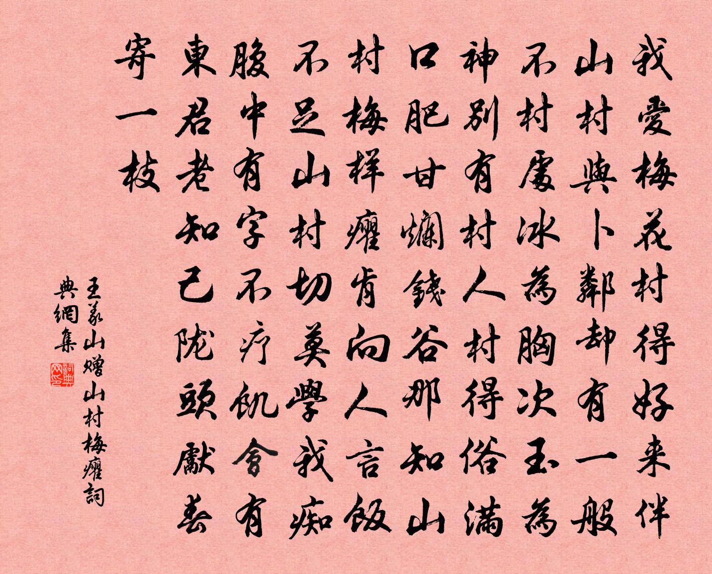 詩詞名句歷史字典書法欣賞書法字典國語詞典說文解字康熙字典古漢語字典標 題 作 者 詩 句 贈山村梅癯作者:王義山 朝代:宋代贈山村梅癯原文我愛梅花村得好,來伴山村與卜鄰。卻有一般不村處,冰為胸次玉為神。別有村人村得俗,滿口肥甘爛錢穀。那知山村梅樣癯,肯向人言飯不足。山村切莫學我痴,腹中有字不療飢。會有東君老知己,隴頭先春寄一枝。詩詞問答問:贈山村梅癯的作者是誰?答:王義山問:贈山村梅癯寫於哪個朝代?答:宋代王義山贈山村梅癯書法欣賞贈山村梅癯書法作品詩詞推薦連日休務過鄰幾韓維〔宋代〕廣文自古無羈束,況復三逢著令休。縱酒不防官長罵,驅車聊過故人游。閒中日月隨方罫,遠外風雲入小舟。準擬送尊禪者王之道〔宋代〕阿遵我輩人,相從十年舊。么肥形愈瘠,身貧道常富。厥初為天衣,持缽化淮右。袖攜維衛錄,訪我過蓬陋。若言太原送許侍御出幕歸東都耿湋〔唐代〕昔隨劉越石,今日獨歸時。汾水風煙冷,并州花木遲。荒庭增別夢,野雨失行期。莫向山陽過,鄰人夜笛悲。聞雪方岳〔宋代〕黃塵沒馬長安道,殘酒初醒雪打窗。客子慣眠蘆葦岸,夢成孤漿泊寒江。宿江上王鎡〔宋代〕茫茫海樹遠生煙,推過篷窗對月眠。半夜櫓聲搖夢醒,趁潮多有渡江船。紇乾狐尾佚名〔〕并州有紇乾者,好戲劇。邑傳言有狐魅,人心惶。一日,紇幹得一狐尾,綴於衣後,至妻旁,側坐露之。其妻疑為湖山十詠王希呂〔宋代〕山南山北異陰晴,雨腳垂垂日腳明。落盡桃花春事退,柔桑深處一鳩鳴。榮上人發心知羅漢堂辦茶油事乞頌釋正覺〔宋代〕這開夢覺底因緣,佛佛心同亡後先。一點靈明三世外,十分妙淨萬機前。琢磨自得叢林下,遊戲何妨百草顛。塵剎送元遂上人歸吳中許棠〔唐代〕落髮在王畿,承恩著紫衣。印心誰受請,講疏自攜歸。泛浦龍驚錫,禪雲虎繞扉。吳中知久別,庵樹想成圍。偈頌一百零二首釋紹曇〔宋代〕古檜吟風,寒鴉布陳。不落見聞,幾人錯認。不錯認人,道士擎拳,闍梨問訊。寒江暮泊寄左偃李中〔唐代〕維舟蘆荻岸,離恨若為寬。煙火人家遠,汀洲暮雨寒。天涯孤夢去,篷底一燈殘。不是憑騷雅,相思寫亦難。扈從南出雀鼠谷張說〔唐代〕豫動三靈贊,時巡四海威。陝關凌曙出,平路半春歸。霍鎮迎雲罕,汾河送羽旂。山南柳半密,谷北草全稀。遲日七月十五日書方回〔宋代〕家貧難辦素食,事忙不及草書。今日果然如此,古人可信非歟。六代祖師畫像贊三祖監智禪師釋正覺〔宋代〕道無揀擇,宗非促延。死生外著,清白家傳。覓罪性空,廓然大同。妙盡亡能境,機回卻借功。虛明自照靡心識,昌英知縣叔作歲坐上,賦瓶里梅花,時坐上九楊萬里〔宋代〕梅香不是不寒清,參遍橫枝酒未醒。夢入西湖疏影里,覺來失卻冷泉亭。依韻和張叔毅讀柳先生文強至〔宋代〕先生蕭瑟半塗休,一跌青雲不再收。名壓班行來眾毀,筆鑱造化起天讎。王韋黨破誰為地,柳播風殊願易州。廟食至岳寺即大通大照禪塔上溫上人儲光羲〔唐代〕秋山下映宮,宮色宜朝陽。迢遞在半嶺,參差非一行。燕息雲滿門,出遊花隱房。二尊此成道,禪宇遙相望。鳳鐸頌古四十五首釋如珙〔宋代〕設粥殷勤請念誦,白槌各為念摩訶。上來或德要圓滿,復去廚頭打破鍋。春雪東方虬〔唐代〕春雪滿空來,觸處似花開。不知園裡樹,若個是真梅。仲春有懷張栻〔宋代〕想見城南春水深,春來夜夜動歸心。隔牆季子應無恙,為托飛鴻寄好音。名句推薦天無二日,人無二理。吳承恩《西遊記·第七十八回》 寵柳嬌花寒食近,種種惱人天氣。李清照《念奴嬌·春情》 穠艷一枝細看取,芳心千重似束。蘇軾《賀新郎·夏景》 憶昔西池池上飲,年年多少歡娛。晁沖之《臨江仙·憶昔西池池上飲》 風雨如晦,雞鳴不已。佚名《風雨》 人心險于山川,難於知天。莊子《莊子·雜篇·列禦寇》 南浦春來綠一川,石橋朱塔兩依然。范成大《橫塘·南浦春來綠一川》 桂魄飛來光射處,冷浸一天秋碧。蘇軾《念奴嬌·中秋》 人之敵,非奸亦奸;人之友,其奸亦忠。來俊臣《羅織經·察奸卷第八》 雞聲茅店月,人跡板橋霜。溫庭筠《商山早行》