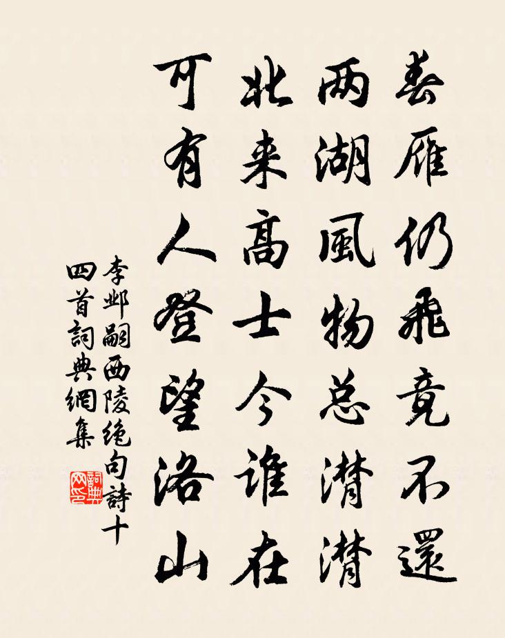 詩詞名句歷史字典書法欣賞書法字典國語詞典說文解字康熙字典古漢語字典標 題 作 者 詩 句 西陵絕句詩十四首作者:李鄴嗣 朝代:清代西陵絕句詩十四首原文春雁仍飛竟不還,兩湖風物總潸潸。北來高士今誰在,可有人登望洛山。詩詞問答問:西陵絕句詩十四首的作者是誰?答:李鄴嗣問:西陵絕句詩十四首寫於哪個朝代?答:清代問:西陵絕句詩十四首是什麼體裁?答:七絕李鄴嗣西陵絕句詩十四首書法欣賞西陵絕句詩十四首書法作品詩詞推薦題楊凝式書安鴻漸〔唐代〕端州石硯宣城管,王屋松煙紫兔毫。更得孤卿老書札,人間無此五般高。相士陳邦彥覓詩張鎡〔宋代〕眼力知君已絕倫,奉傳一法更通神。看渠天爵高人爵,方是人間富貴人。少年游晏殊〔宋代〕霜華滿樹,蘭凋蕙慘,秋艷入芙蓉。胭脂嫩臉,金黃輕蕊,猶自怨西風。前歡往事,當歌對酒,無限到心中。更憑王原慶新遷居南堂以古風求寫恕齋二大字並石樓鑰〔宋代〕三槐諸孫有奇士,才高特未遇時爾。作詩尤能備眾體,短章大篇仍雜擬。解紛使掉三寸舌,隨陸蘇張何足比。鵰鶚新歲書懷四首戴復古〔宋代〕七十九歲叟,時吟感寓詩。年高胡不死,身健欲何為。細柳綠垂地,小桃紅滿枝。春風不到處,枯蔓掛疏籬。演雅十章張至龍〔宋代〕蠶飽辦絲課,蜂忙供蜜工。役役為人勞,衣食還自空。寄弋陽王學士宋祁〔宋代〕新年給札漢家台,愛伏枚皋受詔才。偃蹇不隨虞弁進,棲遲翻逐阮麾來。倡優技拙飛觴淺,寒具盤空秘畫開。早暮和谹父問訊吉父王洋〔宋代〕北園依梵庋,東郭據梧桐。鶴並千年骨,詩傳一祖風。有愁添鬢白,無藥駐顏紅。台上秋期句,思君類渴虹。題招提院靜照堂鄭獬〔宋代〕招提去山遠,還似在山家。晚日惟歸鳥,春風自落花。空談銷劍火,醉墨灑天葩。更欲拿舟去,清溪月正華。贈剡縣過頊秘丞陳襄〔宋代〕賢哉過縣尹,德政是吾師。萬事無鋒穎,一惦惟孝慈。家貧因客冗,發白為民飢。誰刻前山石,令人去後思。至鄂期年以饟事不給於詩己亥夏五廿有八日始岳珂〔宋代〕離歌已盡沙頭玉,夕照初翻浪底金。自是晴鷗無六月,半江雪片涌波心。頌古十一首釋智鑒〔宋代〕青山是父白雲兒,雲散青山總不知。玉兔晝眠雲母地,金烏夜宿不萌枝。鳳凰台汪元量〔宋代〕草沒高台鳳不游,大江日夜自東流。齊梁地廢鴉千樹,王謝家空蟻一丘。騎馬僧爭淮口渡,捕魚人據石頭洲。玉簫辛酉大雪戲成二詩以千山鳥飛絕萬逕人蹤滅為周麟之〔宋代〕北風夜捲地,凍雲曉黏天。黃竹歌未終,飛霰集我前。森羅崑山璧,零亂淮夷蠙。縛賊懸瓠城,安得兵三千。長平懷古孫沖〔宋代〕邯鄲無策信馮亭,上黨須貪澤起兵。趙括母言猶不聽,當時誰肯計長平。述九頌紀生程公許〔宋代〕一之日兮周正,建子他良辰。黃鐘兮起律,魯台兮望雲。氣機兮翕闢,往來兮不停。皇揆予兮初度,秉幼志兮潔貞夜坐燒香台樓鑰〔宋代〕長晝苦炎熱,夜分涼始生。電中千嶂立,琴外一蛩鳴。急雨催詩思,遙空答鼓聲。誰知一府地,得此意淒清。庚寅秋病得語不復詮次名曰感懷黎廷瑞〔宋代〕祖龍制八極,法令如亂麻。儒冠委秋山,王燄明朝霞。所以武陵人,入山種桃花。如何東陵侯,苟此旦暮華。堂堂句周世昌〔宋代〕畫鼓雷奔天不雨,彩旗雲聳地生風。雜詩程岫〔清代〕木棉初種時,其子皆露天。意在衣被人,不肯為人憐。我行忽見之,三嘆心惕然。感此復再拜,草中有大賢。丈夫名句推薦天入平湖晴不風,夕帆和雁正浮空。陳與義《登岳陽樓》 盡教春思亂如雲,莫管世情輕似絮晏幾道《玉樓春·雕鞍好為鶯花住》 今日清明節,園林勝事偏。賈島《清明日園林寄友人》 鶯花猶怕春光老,豈可教人枉度春?佚名《增廣賢文·上集》 勝概日相與,思君心鬱陶。岑參《鞏北秋興寄崔明允》 南去北來徒自老,故人稀。賀鑄《釣船歸·綠淨春深好染衣》 黃河曲里沙為岸,白馬津邊柳向城。高適《夜別韋司士》 請君看取東流水,方識人間別意長。嚴仁《鷓鴣天·惜別》 蓋世的功勞,當不得一個矜字;彌天的罪過,當不得一個悔字。洪應明《菜根譚·概論》 蛾眉淡了教誰畫?瘦岩岩羞戴石榴花。關漢卿《大德歌·夏》