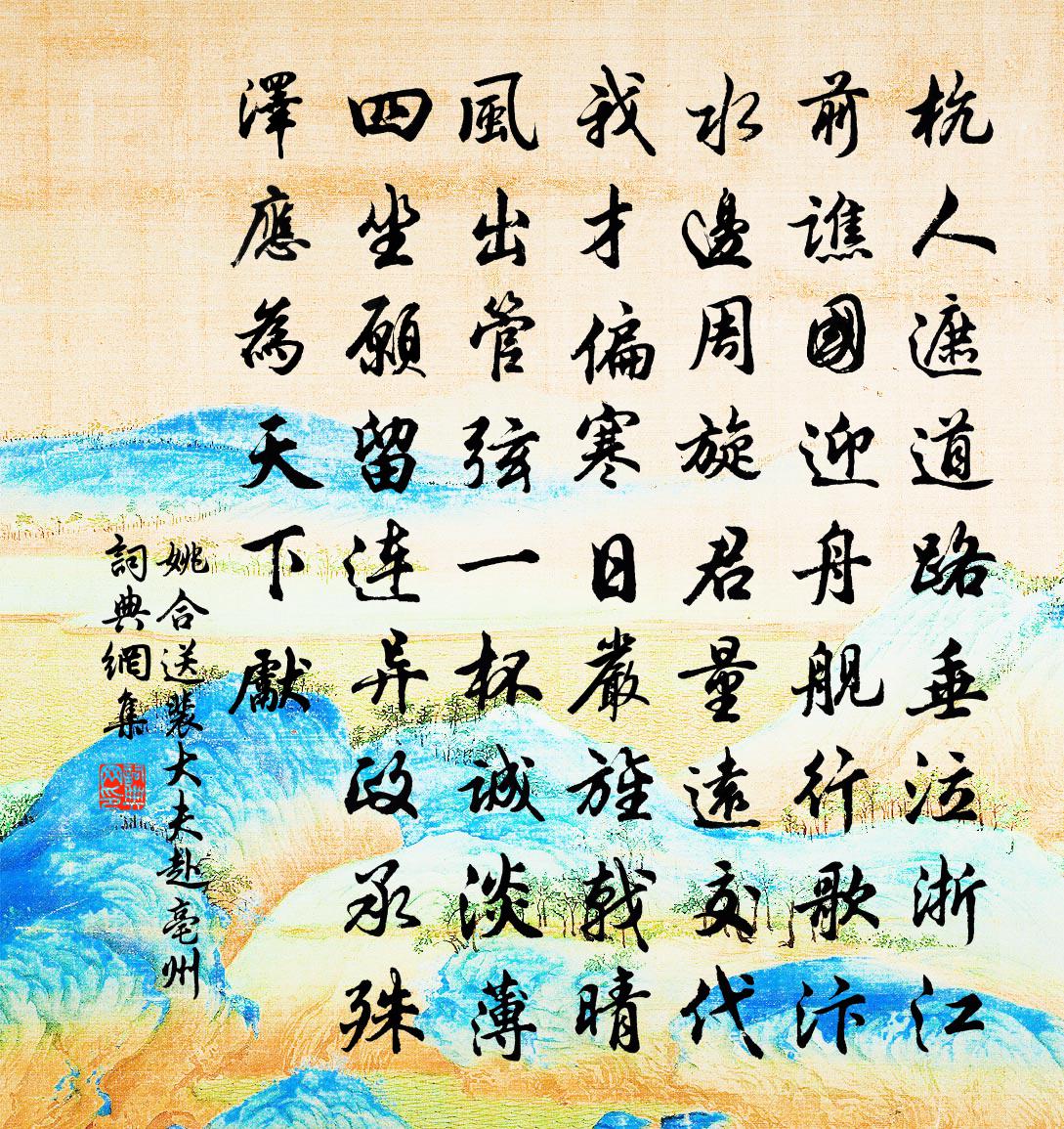 詩詞名句歷史字典書法欣賞書法字典國語詞典說文解字康熙字典古漢語字典標 題 作 者 詩 句 送裴大夫赴亳州作者:姚合 朝代:唐代送裴大夫赴亳州原文杭人遮道路,垂泣浙江前。譙國迎舟艦,行歌汴水邊。周旋君量遠,交代我才偏。寒日嚴旌戟,晴風出管弦。一杯誠淡薄,四坐願留連。異政承殊澤,應為天下先。詩詞問答問:送裴大夫赴亳州的作者是誰?答:姚合問:送裴大夫赴亳州寫於哪個朝代?答:唐代問:送裴大夫赴亳州是什麼體裁?答:五排姚合送裴大夫赴亳州書法欣賞送裴大夫赴亳州書法作品注釋全唐詩:卷496-6詩詞推薦戚氏蘇軾〔宋代〕 * 山。東皇靈媲統群仙。絳闕岧嶢,翠房深迥,倚霏煙。幽閒。志蕭然。金城千里鎖嬋娟。當時穆滿巡狩。翠華相和歌辭採蓮曲儲光羲〔唐代〕淺渚荷花繁,深塘菱葉疏。獨往方自得,恥邀淇上姝。廣江無術阡,大澤絕方隅。浪中海童語,流下鮫人居。春雁送錢太虛同年李流謙〔宋代〕不隔同年面,真情本弟兄。人能純白備,交自始終成。測管才窺豹,傾江試吸鯨。吾言蓍蔡驗,決矣看飛鳴。將行示遠父秉文四八弟趙蕃〔宋代〕雞啼午方停,蟬噪暑未秋。寓居雖市近,適意如林投。可人誰能來,王徐真勝流。王居近官道,樹林間田疇。徐居和李相公勉晦日蓬池游宴(同字)戴叔倫〔唐代〕高會吹台中,新年月桂空。貂蟬臨野水,旌旆引春風。細草縈斜岸,纖條出故叢。微文復看獵,寧與解神同。憩竇園因題池亭釋紹嵩〔宋代〕午枕藜床夢忽驚,竇家園裹有鶯聲。半生客路逢佳節,萬瓦腳跟開化城。鸂鶒刷毛花蕩漾,蒲萄上架月縱橫。誰教禪人並化主寫真求贊釋正覺〔宋代〕松老有骨,竹癯無肉。雪發覆顛,霜眉映目。須菩提坐空而談,維摩詰卷辨而默。拈來何處不相逢,日面佛兮月面次張節推山字韻詩留其行陳造〔宋代〕紅塵嘆我賓士久,空谷逢君夢寐間。政使公榮可無飲,風江驚浪涌銀山。偈頌一百零二首釋慧遠〔宋代〕而來與一杓鹹鹽酸醋,北來與一杓苦菜淡虀。吃則因邪打正,不吃則東自西。慈竹樂史〔宋代〕蜀中何物靈,有竹慈為名。一叢闊婁處,森森數十莖。長莖復短莖,枝葉不崢嶸。去年筍已長,今年筍又生。高低過筰橋道中龍祠小留陸游〔宋代〕江邊龍廟何年作,白浪花中插朱閣。朝暾漸上宿霧收,春氣已動晨霜薄。私來倚欄一悵然,蘆花滿空如柳綿。安得曉行巴峽王維〔唐代〕際曉投巴峽,餘春憶帝京。晴江一女浣,朝日眾雞鳴。水國舟中市,山橋樹杪行。登高萬井出,眺迥二流明。人作山中和韻文天祥〔宋代〕白扇揮殘暑,青鞋踏嫩晴。花床尋小隱,石鼎引長鳴。紗帽有時去,酒壺惟意傾。山僧痴與坐,閒卻瘦彌明。和孫廷平坦嵩山十首孤竹苹韓維〔宋代〕春山夜多雨,點苹生水涘。誰與賞幽芳,惟有岩中子。抱琴沙上立,日暮清風起。春日和盧使君幼平開元寺聽妙奘上人講皎然〔唐代〕仁聖垂文在,虛空日月懸。陵遲追哲匠,宗旨發幽詮。法受諸侯請,心教四子傳。春生雪山草,香下棘林天。顧我賞牡丹王建〔唐代〕此花名價別,開艷益皇都。香遍苓菱死,紅燒躑躅枯。軟光籠細脈,妖色暖鮮膚。滿蕊攢黃粉,含棱縷絳蘇。好和寄并州張給事楊億〔宋代〕山河表里絕狼煙,幕府朝朝醉玳筵。合樂中軍雄鼓吹,傳杯四座艷花鈿。行春好駐桑郊騎,卜夜誰談雪賓禪。梁苑欒城遇風效韓孟聯句體歐陽修〔宋代〕歲暮氛霾惡,冬餘氣候爭。吹噓回暖律,號令發新正。遠響來猶漸,狂奔勢益橫。頹城鏖戰鼓,掠野過陰兵。掃蕩送吳盬丞季行知簡州楊萬里〔宋代〕勛烈涪陽異姓王,手扶西極漢天長。有孫文武千人傑,透紙風騷萬字香。小涉移中公事筆,又懷劍外史君章。同朝宮詞一百首岳珂〔宋代〕五色雲煙覆帝城,御溝流水接金明。曉來珂繖沙堤鬧,萬歲聲中賀太平。名句推薦獨倚危欄,神遊無際,天地猶嫌隘。朱栴《念奴嬌·雪霽夜月中登樓望賀蘭山作》 風煙俱淨,天山共色。吳均《與朱元思書》 若非群玉山頭見,會向瑤台月下逢李白《清平調·其一》 鳥下綠蕪秦苑夕,蟬鳴黃葉漢宮秋。許渾《鹹陽城東樓 / 鹹陽城西樓晚眺 / 西門》 無有定法如來可說。鳩摩羅什譯《金剛經·無得無說》 以力服人者,非心服也,力不贍也;以德服人者,中心悅而誠服也。孟子《孟子·公孫丑章句上·第三節》 風雨梨花寒食過,幾家墳上子孫來?高啟《送陳秀才還沙上省墓》 獨憐幽草澗邊生,上有黃鸝深樹鳴。韋應物《滁州西澗》 令必行,禁必止。韓非及後人《韓非子·飾邪》 善刪者字去而意留,善敷者辭殊而義顯。劉勰《文心雕龍·熔裁》