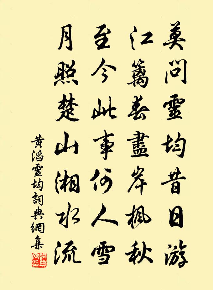 詩詞名句歷史字典書法欣賞書法字典國語詞典說文解字康熙字典古漢語字典標 題 作 者 詩 句 靈均作者:黃滔 朝代:唐代靈均原文莫問靈均昔日游,江籬春盡岸楓秋。至今此事何人雪,月照楚山湘水流。詩詞問答問:靈均的作者是誰?答:黃滔問:靈均寫於哪個朝代?答:唐代問:靈均是什麼體裁?答:七絕黃滔靈均書法欣賞靈均書法作品注釋全唐詩:卷706-41詩詞推薦春晚寄微之白居易〔唐代〕三月江水闊,悠悠桃花波。年芳與心事,此地共蹉跎。南國方譴謫,中原正兵戈。眼前故人少,頭上白髮多。通州行香子王吉昌〔元代〕震乙情柔,酷愛庚金。角商和、律應清音。木人鼓掌,石女調琴。顯巧施仁,勤行義,道情深。二物相融,互動浮入朝感舊宋庠〔宋代〕二紀便番冒主恩,歸來榮感兩驚魂。昌辰盡見群龍出,急景俱隨駭駟奔。史冊褒賢空汗竹,山丘餘泣已陳根。此身宣城哭蔣征君華李白〔唐代〕敬亭埋玉樹,知是蔣征君。安得相如草,空餘封禪文。池台空有月,詞賦舊凌雲。獨掛延陵劍,千秋在古墳。卜運算元 漫興辛棄疾〔宋代〕珠玉作泥沙,山谷量牛馬。試上累累丘壠看,誰是強梁者。水浸淺深檐,山壓高低瓦。山水朝來笑問人,翁早歸來次韻禮之淮上吟強至〔宋代〕泗上風宜舊罕傳,邦人誰說貢鱗鮮。隔淮小市若古畫,接楚遠山疑宿煙。民舍卑窪多困水,農疇磽瘠少逢年。顧予上陳文惠楊朴〔宋代〕昨夜西風爛漫秋,今朝東岸獨垂鉤。紫袍不識衰衣客,曾對君王十二旒。偈頌七十八首釋正覺〔宋代〕丙丁童子來求火,南海波斯鼻孔大。鋯獠舌頭會者難,直下而今照得破。照得破,沒功過。知你被底穿,曾與同床八聲甘州葉夢得〔宋代〕問浮家泛宅,自玄真、去後有誰來。漫煙波千頃,雲峰倒影,空翠成堆。可是溪山無主,佳處卻徘徊。暮雨卷晴野坐客有談狄魚眼眶之美者感嘆而作陸游〔宋代〕黃雀頭顱羞五鼎,狄魚眼眶參雋永。兩螫何皋蟹喪軀,一臠可憐牛斷領。霜刀斫膾幾許痛,公子方夸醉魂醒。物生寄良人汪氏〔宋代〕旅食京華歲月多,聖賢事業竟如何。明年佇聽泥金報,閒把關雎獨自歌。候潮錢塘渡曾豐〔宋代〕眼厭紛華久,身離闤闠初。市聲方較少,春色況猶余。海沸如中熱,山浮若內虛。坐窮訊息理,萬事付乘除。偈三首釋慧方〔宋代〕達磨祖師在腳底,踏不著兮提不起。子細當頭放下看,病在當時誰手裡。張公會看脈,李公會使藥,兩個競頭醫,馬上有見李茂復〔唐代〕行盡疏林見小橋,綠楊深處有紅蕉。無端眼界無分別,安置心頭不肯銷。早夏郡樓宴集姚合〔唐代〕官散有閒情,登樓步稍輕。窗雲帶雨氣,林鳥雜人聲。曉日襟前度,微風酒上生。城中會難得,掃壁各書名。鄱陽湯仲材以其家息庵存齋東澗三大老鄂州黃方回〔宋代〕息存東澗三湯老,文我平生盡見之。身到黃龍山幾度,卻慚欠讀惠璋碑。和子遠春江用老杜韻王之道〔宋代〕欲去未成去,朔風鳴怒濤。片帆洲外舉,列岫霧中高。竹屋雨沾被,紙窗寒透袍。遙應望歸艇,向夕走兒曹。貽曦上人方乾〔唐代〕四十年來多少人,一分零落九成塵。與師猶得重相見,亦是枯株勉強春。陪留宰游灌溪回飲縣圃六絕王炎〔宋代〕東風桃花可招客,吏事塵埃能困人。蘸甲一杯留我醉,知公胸次有陽春。過達磨泉緬懷東坡曾豐〔宋代〕分野秦南海,城池漢尉佗。功名徒自苦,寒暑暗相磨。破寺容僧少,枯松閱士多。我來空想像,百世一東坡。名句推薦見素抱樸,少私寡慾,絕學無憂。老子《老子·道經·第十九章》 風緊雁行高,無邊落木蕭蕭。納蘭性德《河瀆神·風緊雁行高》 村北村南,穀雨才耕遍。秀麥連岡桑葉賤。范成大《蝶戀花·春漲一篙添水面》 柳下桃蹊,亂分春色到人家。秦觀《望海潮·洛陽懷古》 眼前直下三千字,胸次全無一點塵。于謙《觀書》 路出寒雲外,人歸暮雪時。盧綸《李端公 / 送李端》 日出入安窮?時世不與人同。佚名《日出入》 未收天子河湟地,不擬回頭望故鄉。令狐楚《少年行四首·其三》 垂下簾櫳。雙燕歸來細雨中。歐陽修《採桑子·群芳過後西湖好》 為容不在貌,獨抱孤潔。張炎《疏影·梅影》