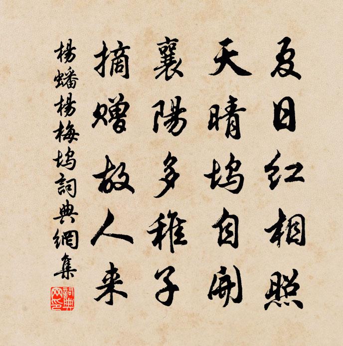 詩詞名句歷史字典書法欣賞書法字典國語詞典說文解字康熙字典古漢語字典標 題 作 者 詩 句 楊梅塢作者:楊蟠 朝代:宋代楊梅塢原文夏日紅相照,天晴塢自開。襄陽多稚子,摘贈故人來。詩詞問答問:楊梅塢的作者是誰?答:楊蟠問:楊梅塢寫於哪個朝代?答:宋代楊蟠楊梅塢書法欣賞楊梅塢書法作品詩詞推薦次韻朱通判嚴上舍陳造〔宋代〕萬手抄詩遍洛城,老懷可但向來傾。采菱白雪方迭奏,蜚雨曉風相與清。價重欲輸和氏璧,令嚴誰犯伏波營。即今南浦 會波村,在松江城北三十里。其西九山陶宗儀〔元代〕水兼九山南過村外,以入于海。而溝塍畎澮,隱翳竹樹間。春時桃花盛開,難犬之聲相聞,殊有武陵風概,隱者停答邊信(一作代答邊信同心結)長孫佐輔〔唐代〕征人去年戍遼水,夜得邊書字盈紙。揮刀就燭裁紅綺,結作同心答千里。君寄邊書書莫絕,妾答同心心自結。同心示王侑翁二首陳著〔宋代〕垂髫已解吟,仿佛學何陰。暗動梅窗喜,遙傳桂種心。染聲毋市井,近拙要山林。耄矣不成句,中閒意自深。寄范郎中洪皓〔宋代〕相門有相未多年,德行雙全亞子騫。匪晚南歸施有政,也應示辱用蒲鞭。相逢梅堯臣〔宋代〕晚日南城歸,橋邊見郎去。遠遠逐郎回,羅衣汗微污。不惜污羅衣,要與郎相顧。留連芳苑中,肯謝花夭嫭。傍欄老嘆一首劉克莊〔宋代〕少豪扛鼎復搴旗,倏忽才情已竭衰。今無百斤金買賦,古有九千縑作碑。毛錐盡禿難藏老,麈尾高懸合授誰。他日崇聖院陳岩〔宋代〕山形四抱水來前,中有金蓮 * 天。清磬一聲僧定起,松間靈鶴舞蹁躚。新濰見桃杏書事孫應時〔宋代〕今晨明客眼,桃杏照江紅。鳥哢蒼山曲,人聲翠竹中。獨游空遠思,一笑負春風。便想荊州道,簪花醉渚宮。題鹿苑寺壁間記魯簡肅公羅漢見夢事吳思齊〔宋代〕是法本平等,無怠亦無敬。如何證無生,卻來見參政。好溪山張輯〔宋代〕孤鴻遙下夕陽寒。秋清懷抱寬。籬根香滿菊金團。客中邀客看。呼濁酒,共清歡。五弦隨意彈。西窗仍見好溪山。絳都春(別張子儀)趙彥端〔宋代〕平生相遇。算未有、笑語閩山佳處。舊日文章,如今風味渾如許。眼前都是蓬萊路。但莫道、有人曾住。異時天上到瓊州和李參政胡銓〔宋代〕落網從前一念斜,崖州前定復何嗟。萬山行盡逢黎母,雙井渾疑似若邪。行止非人十年夢,廢興有命一浮家。此行代柬寄王去非劉宰〔宋代〕聞隨使使過江東,想見旌旗十里紅。多少蒼生在寒谷,早吹鄒律轉春風。送陸澧倉曹西上劉長卿〔唐代〕長安此去欲何依,先達誰當薦陸機。日下鳳翔雙闕迥,雪中人去二陵稀。舟從故里難移棹,家住寒塘獨掩扉。臨水沈朝議之淵輓詩蔡戡〔宋代〕早擅雲間譽,唯公伯仲賢。諫篇余祖烈,經學自家傳。出處無餘恨,哀榮得兩全。善人今已矣,埋玉向新阡。挽陳判官劉克莊〔宋代〕偶然傾蓋欣初識,驀地分襟惜久暌。太末謾稱三語掾,上林未借一枝棲。空煩樗叟招魂些,賴有薇郎積善題。他日答和呂侍讀歐陽修〔宋代〕昔日題輿媿屈賢,今來還見擁朱轓。笑談二紀思如昨,名望三朝老更尊。野徑冷香 * 秀,平湖斜照白鷗翻。此中感舊絕句陸游〔宋代〕十月新霜兔正肥,佳人駿馬去如飛。纖腰嫋嫋戎衣窄,學射山前看打圍。鷓鴣天佚名〔宋代〕軒轅起置號齊雲。社祖西川妙道君。□□親自裁成就,萬古流傳作玩珍。江湖客,聽原因。今朝出獄見其真。來到名句推薦其進銳者,其退速。孟子《孟子·盡心章句上·第四十四節》 勿言草卉賤,幸宅天池中沈約《詠新荷應詔》 私行勝,則少公功。韓非及後人《韓非子·外儲說左下》 文章本天成,妙手偶得之。陸游《文章》 若是前生未有緣,待重結、來生願。樂婉《卜運算元·答施》 知而弗為,莫如勿知;親而弗信,莫如勿親。佚名《孔子家語·子路初見》 更傾寒食淚,欲漲冶城潮。王安石《壬辰寒食》 一聲已動物皆靜,四座無言星欲稀。李頎《琴歌》 迢遞路回清野,人語漸無聞,空帶愁歸周邦彥《夜飛鵲·河橋送人處》 清風徐來,水波不興。蘇軾《前赤壁賦》