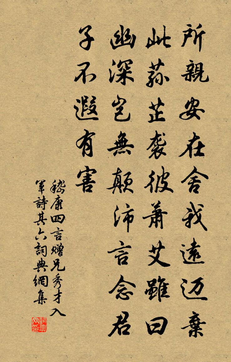 詩詞名句歷史字典書法欣賞書法字典國語詞典說文解字康熙字典古漢語字典標 題 作 者 詩 句 四言贈兄秀才入軍詩 其六作者:嵇康 朝代:兩漢四言贈兄秀才入軍詩 其六原文所親安在。舍我遠邁。棄此蓀芷。襲彼蕭艾。雖曰幽深。豈無顛沛。言念君子。不遐有害。詩詞問答問:四言贈兄秀才入軍詩 其六的作者是誰?答:嵇康問:四言贈兄秀才入軍詩 其六寫於哪個朝代?答:兩漢嵇康四言贈兄秀才入軍詩 其六書法欣賞四言贈兄秀才入軍詩 其六書法作品詩詞推薦諫堂山陳岩〔宋代〕茸茸莎草褭風長,二百年前一諫堂。舊地幾番新地主,諫堂名字愈輝光。送治楊司直袁燮〔宋代〕岷蜀古多士,聲名爭頡頏。近代推三蘇,奮發眉之陽。君侯亦眉人,源委故深長。少日隨遊宦,中年擅詞場。笑談次韻酬郭承禧廖行之〔宋代〕黃鐘大呂非常器,清廟陳之乃其地。胡為小用噎寸莛,猶遣鹹韶有遺事。君才棲枳今何時,天意似欲昌吾語。西山初入太行路白居易〔唐代〕天冷日不光,太行峰蒼莽[上聲]。嘗聞此中險,今我方獨往。馬蹄凍且滑,羊腸不可上。若比世路難,猶自平於聽僧彈琴貫休〔唐代〕家近吳王古戰城,海風終日打牆聲。今朝鄉思渾堆積,琴上聞師大蟹行。鷓鴣天(次韻寶溪探梅未放)楊冠卿〔宋代〕歲月如馳烏免飛。情懷著酒強支持。經年不見宮妝面,穠碧誰斟悲翠卮。江路晚,夕陽低。奚奴空負錦囊歸。欲憑雪九首傅察〔宋代〕墨雲埋日車,厚雪鎮坤軸。行路勿匆匆,包藏恐深谷。甘露歌王安石〔宋代〕盡日含毫難比興。都無色可並。萬里晴天何處來。真是屑瓊瑰。夜坐舒邦佐〔宋代〕霜蟾照戶鼓三更,獨坐 * 一盞燈。名利此時都踏破,分明一個在家僧。和陶雜詩十一首蘇軾〔宋代〕博大古真人,老聃關尹喜。獨立萬物表,長生乃餘事。稚川差可近,倘有接物意。我頃登羅浮,物色恐相值。徘徊【雙調】對玉環佚名〔元代〕歌舞嬋娟,風流勝玉仙。拆散姻緣,柳青忒愛錢。佳人驀上船,書生緣分淺。幾句新詩,金山古寺邊。一曲琵琶,春色滿皇州裴夷直〔唐代〕寒銷山水地,春遍帝王州。北闕晴光動,南山喜氣浮。夭紅妝暖樹,急綠走陰溝。思婦開香閣,王孫上玉樓。氛氳行次潁州值雨留駐數日因貽郡守秘閣刁公楊億〔宋代〕夢想蒼龍闕,盤桓汝水濱。郡侯偏愛客。秋雨更留人。饌盛嘗鱸膾,樽空倒角巾。羈愁不能遣,唯恐二毛新。八月十五夜對月方回〔宋代〕散發披襟一再窺,未甘兀兀守書痴。且圓照盡天圓處,秋半涼當夜半時。人世無燈方作夢,山翁有酒更能詩。此心宴邊將張喬〔唐代〕一曲梁州金石清,邊風蕭颯動江城。座中有老沙場客,橫笛休吹塞上聲。尋春姜特立〔宋代〕選勝尋春莫預期,風和日暖即佳時。行庖草草何妨事,明日陰晴特未知。石巴山買舟王邁〔宋代〕年來機事付沙鷗,湖海萍蓬覺倦遊。千裏白雲關我恨,一江流水替人愁。快聞飛槳健於馬,底問前灘吼似牛。枕藉絕句蔡沈〔宋代〕積雨添泉脈,寒來送兩山。南風北窗下,午夢聽潺湲。次韻永興王宰游鍾成觀二首白玉蟾〔宋代〕萬斛蒼煙戀釣磯,一川秋綠漾清暉。空明隱映流光薄,翻憶當年蘇紫微。贈無方叔張嵲〔宋代〕吾叔超世士,筆力回狂瀾。作詩到合處,未謝春草篇。罷官守環堵,冷屋風蕭然。操尚非矯世,靜退真所安。慷慨名句推薦燕子不曾來,小院陰陰雨。蔣春霖《卜運算元·燕子不曾來》 氣軟來風易,枝繁度鳥遲。李爽《芳樹》 見一葉落,而知歲之將暮劉安及其門客《淮南子·說山訓》 煙籠寒水月籠沙,夜泊秦淮近酒家。杜牧《泊秦淮》 為有書來與我期,便從蘭杜惹相思。莊棫《定風波·為有書來與我期》 己所不欲,勿施於人。孔子弟子《論語·顏淵篇》 東風有恨致玄都,吹破枝頭玉,夜月梨花也相妒。周文質《小桃紅·詠桃》 憐君片雲思,一棹去瀟湘。杜牧《送薛種游湖南》 美女渭橋東,春還事蠶作。李白《陌上桑》 雁過孤峰曉,猿啼一樹霜。賈島《送天台僧》