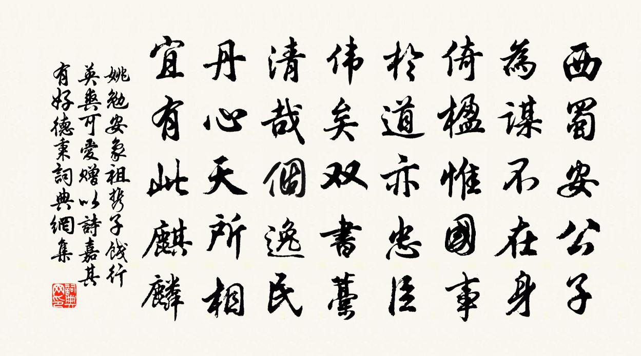 詩詞名句歷史字典書法欣賞書法字典國語詞典說文解字康熙字典古漢語字典標 題 作 者 詩 句 安象祖攜子餞行英爽可愛贈以詩嘉其有好德秉作者:姚勉 朝代:宋代原文西蜀安公子,為謀不在身。倚楹惟國事,於道亦忠臣。偉矣雙書藁,清哉個逸民。丹心天所相,宜有此麒麟。詩詞問答問:《安象祖攜子餞行英爽可愛贈以詩嘉其有好德秉》的作者是誰?答:姚勉問:該詩寫於哪個朝代?答:宋代書法欣賞安象祖攜子餞行英爽可愛贈以詩嘉其有好德秉書法作品詩文賞析【原題】:安象祖攜子餞行英爽可愛贈以詩嘉其有好德秉彝之天必能世其家詩詞推薦句高似孫〔宋代〕雁愁奔舊菊,解健敵新醪。妙寂院訪梅陳宓〔宋代〕山寒盡日少人知,調鼎風流卻在茲。但得此君為益友,不嫌青女妒妍姿。應愁我輩來何晚,豈共春風別有私。不忍霜天曉角(霜夜小酌)趙長卿〔宋代〕合兒幽靜處,圍爐面小窗。好是鬥頭兒坐,梅煙炷、返魂香。對火怯夜冷,猛飲消漏長。飲罷且收拾睡,斜月照、西澗種柳韋應物〔唐代〕宰邑乖所願,黽勉愧昔人。聊將休暇日,種柳西澗濱。置鍤息微倦,臨流睇歸雲。封壤自人力,生條在陽春。成陰出遊陸游〔宋代〕莫笑衰殘百不能,一枝筇杖捷飛騰。山空野火焚秦篆,日澹煙蕪遍禹陵。小浦漲潮迎釣艇,疏鍾出谷送行僧。踟躕上陸鹽生辰五首黃公度〔宋代〕名家詩禮有諸郎,飛入南宮鴻雁行。不向人前稱閥閱,要須仙桂五枝芳。次韻韓康公對雨即事有懷五弟蘇頌〔宋代〕燕間誰伴泛金焦,注想鴒原望泬寥。接客後堂聊造適,偃藩臨汝正逍遙。齊名孟季須爰立,一致夷聃異反招。筆札蕭照鄰參政大資輓詩二首楊萬里〔宋代〕東府辭金印,南園伴赤松。門闌無薏苡,泉石自從容。忽作丁威鶴,雲亡老子龍。一哀緣殄瘁,不是涕無從。過麻子湖遇逆風有作姚勉〔宋代〕自喜扁舟載月明,涉湖底事不宜輕。象痕深沒風仍順,今日天公亦世情。西江月(賀人女晬)劉澗谷〔宋代〕淑質生當良月,晬辰喜遇今朝。掌心托個儒人苗。早晚夫人爭叫。阿母神仙苗裔,阿爺宰相丰標。阿兄氣宇更飄飄郡中西園(一作許渾詩)姚合〔唐代〕西園春欲盡,芳草徑難分。靜語唯幽鳥,閒眠獨使君。密林生雨氣,古石帶潮文。雖去清秋遠,朝朝見白雲。山村日暮釋永頤〔宋代〕犢背斜陽暖,茅蔣石樹穿。行人識岡路,飢鵲噪沙田。遠浦生微月,荒皋起暝煙。群烏飛散盡,寒水漾漁船。大觀祀社稷九首佚名〔宋代〕崇崇廣壇,嚴恭祀事。威德孔時,周旋進止。鏘若環佩,誠通於幽。相於農植,邦其鹹休。虞忠肅萬里帖贊岳珂〔宋代〕方長鯨之乾誅,駭百川這騰浪。撼坤軸其欲裂,有雍公之忠壯。策數船之奇勳,射天狼於北向。既旄頭之夜殞,窘明堂慶成歐陽修〔宋代〕辰火天文次,◇門路寢閎。奉親昭孝德,惟帝饗精誠。禮以三年講,時因萬物成。九筵嚴太室,六變導和聲。象魏楊花吳錫疇〔宋代〕為見春風不久歸,顛狂上下弄晴暉。只饒天與無拘束,入幕穿簾任意飛。園中偶題陸游〔宋代〕憶向彭州取牡丹,蠟封馳騎露初乾。如今歷盡人間事,縱有姚黃亦嬾看。寄贈集虛孟高士方回〔宋代〕天地春藏凍核中,時來蜂蝶哄東風。萬端變化根無極,一寸靈明裹太空。妙處千江分明月,飄然六合點飛鴻。守玄北風陳藻〔宋代〕田園移主只丘墳,他邑浮家每斷魂。又向隣州為客久,北風終夜夢柴門。乙巳邵武建寧夜坐書呈諸公陳普〔宋代〕一合乾坤貯鬼神,入虛何敢謂無人。暗中射鮒誰知見,繞市青衣說與人。名句推薦待小人不難於嚴,而難於不惡;待君子不難於恭,而難於有禮。洪應明《菜根譚·概論》 庭院深深深幾許,楊柳堆煙,簾幕無重數。歐陽修《蝶戀花·庭院深深深幾許》 驟雨過,珍珠亂撒,打遍新荷。元好問《驟雨打新荷》 貴富而不知道,適足以為患,不如貧賤。呂不韋《呂氏春秋·紀·孟春紀》 稱是秦時避世人,勸酒相歡不知老。李白《山人勸酒》 日暮平沙秋草亂,一雙白鳥避人飛。袁宏道《感事·湘山晴色遠微微》 照野瀰瀰淺浪,橫空隱隱層霄。蘇軾《西江月·頃在黃州》 德者事業之基,未有基不固而棟宇堅久者洪應明《菜根譚·概論》 雨余溪水掠堤平,閒看村童謝晚晴。陸游《觀村童戲溪上》 岸邊兩兩三三,浣沙游女。柳永《夜半樂·凍雲黯淡天氣》