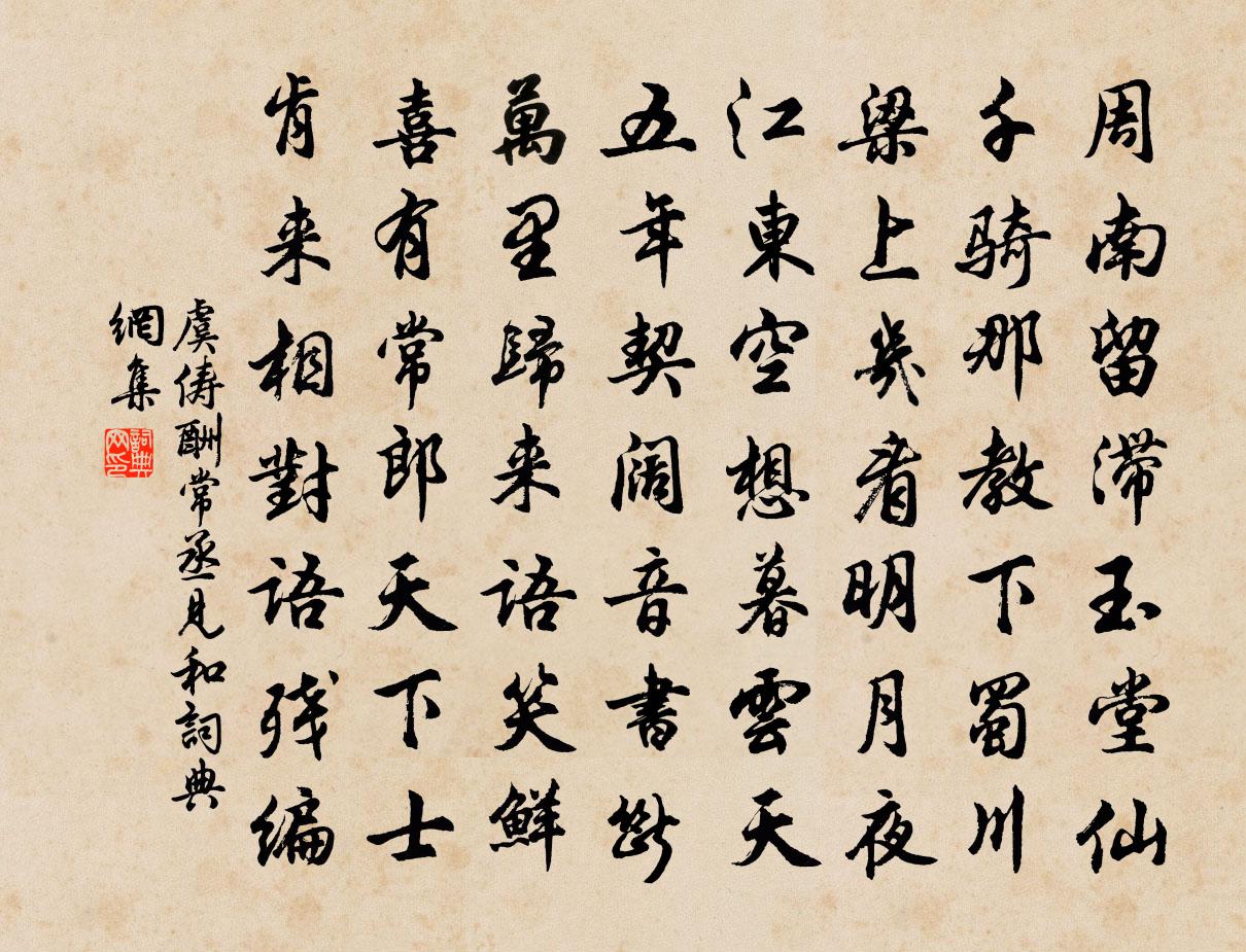 詩詞名句歷史字典書法欣賞書法字典國語詞典說文解字康熙字典古漢語字典標 題 作 者 詩 句 酬常丞見和作者:虞儔 朝代:宋代酬常丞見和原文周南留滯玉堂仙,千騎那教下蜀川。樑上幾看明月夜,江東空想暮雲天。五年契闊音書斷,萬里歸來語笑鮮。喜有常郎天下士,肯來相對語殘編。詩詞問答問:酬常丞見和的作者是誰?答:虞儔問:酬常丞見和寫於哪個朝代?答:宋代虞儔酬常丞見和書法欣賞酬常丞見和書法作品詩詞推薦戲題牡丹范成大〔宋代〕主人細意惜芳春,寶帳籠階護紫雲。風日等閒猶不到,外邊蜂蝶莫紛紛。直玉堂和李參政絕句洪咨夔〔宋代〕曲折宮牆日影方,堂深人靜似山樑。斲櫚葉底梅花老,次第風光到海棠。武三思徐鈞〔宋代〕群賢逐去在朝空,宮禁潛歸掌握中。若使當時誅不早,崇恩廟貌又興隆。春夢王鎡〔宋代〕東風敲碎玉闌乾,蝴蝶紛飛夢欲殘。翠被壓床銀燭暗,夜深誰問海棠寒。立春後十二日命駕至郊外戲書觸目陸游〔宋代〕宮雲縹渺漏聲遲,夢裡華胥卻自疑。春淺風光先盎盎,時平節物共熙熙。畫簾不捲聞人語,玉勒徐行避酒旗。閱盡送王嘉叟侍郎使虜仍用其韻胡銓〔宋代〕蘇張姓字炳如丹,遍歷遐荒覺世寬。龍勒殊勛標絕域,麟宮奇節障狂瀾。二千里外河源遠,十九年間海上寒。二子寒食日早出城東羅隱〔唐代〕青門欲曙天,車馬已喧闐。禁柳疏風雨,牆花拆露鮮。向誰誇麗景,只是嘆流年。不得高飛便,回頭望紙鳶。代上時相生辰陳棣〔宋代〕春光先向隴梅歸,正值崧神降岳時。孕秀直疑天地相,輸忠唯許冕旒知。八珍錫燕宮廚送,百兩傳宣使驛馳。盛事偈頌一百六十首釋宗杲〔宋代〕今朝七月五,打鼓普請看。萬里無片雲,猶欠一大半。五月一日紫宸候對時屬禁直穿內而行因書六韻鄭畋〔唐代〕朱夏五更後,步廊三里餘。有人從翰苑,穿入內中書。漏響飄銀箭,燈光照玉除。禁扉猶鎖鑰,宮妓已妝梳。紫府柵堰二嘆方回〔宋代〕船行三五日,不得不思家。索米開橋柵,徵錢運堰車。於官何所補,為客自堪嗟。況復饑荒後,群偷沸似麻。戲書圓覺經後辛棄疾〔宋代〕圓覺十二菩薩問,吾取一二餘鄙哉。若是如來真實語,眾生卻自勝如來。漫成呈文潛五首晁補之〔宋代〕花如怨人不近眼,深院一枝春得知。東風不是不愛惜,剛為花愁真是誰。偈傾一百三十三首釋法薰〔宋代〕乳源言中藏劍戟,這僧奸裹放痴憨。西來的的意,斫額望扶桑。生查子李處全〔宋代〕庭戶小光中,簾幕秋光里。曲沼綺疏橫,幾處新妝洗。紅臉露輕勻,翠袖風頻倚。鸞鑑不須開,自有窗前水。和叔豹詠家園姜特立〔宋代〕小園繚繞瞰滄灣,搜抉天藏不放閒。愧我筆端無錦繡,羨君胸次有江山。規模未出經營外,物象先歸賦詠間。何日天宮幽居即事邵雍〔宋代〕人若天津遠,來須特特來。閒餘知道泰,靜久覺神開。悟易觀棋局,談詩捻酒杯。世情千萬狀,都不與裝懷。贈趙公旦張嵲〔宋代〕少年意氣隘九州,遠別不為兒女愁。只今摧頹落異縣,跬步信宿生離憂。況今送子又千里,使我別緒何能休。憶昔江州琵琶亭夏竦〔宋代〕年光過眼如車轂,職事羈人似馬銜。若遇琵琶應大笑,何須涕泣滿青衫。東軒琴示兒子沂姚孝錫〔宋代〕古人無復見,但有東軒琴。一鼓高山操,因窺古人心。正聲久沈埋,俚耳喧哇淫。正可自怡悅,不須求賞音。名句推薦六曲闌乾偎碧樹,楊柳風輕,展盡黃金縷。馮延巳《鵲踏枝·清明》 水際輕煙,沙邊微雨。荷花芳草垂楊渡。劉將孫《踏莎行·閒遊》 塞上長城空自許,鏡中衰鬢已先斑。陸游《書憤五首·其一》 紅淚偷垂,滿眼春風百事非。納蘭性德《採桑子·當時錯》 粉色全無飢色加,豈知人世有榮華。杜荀鶴《蠶婦》 從善如登,從惡如崩司馬光《資治通鑑·魏紀·魏紀三》 捐軀赴國難,視死忽如歸!曹植《白馬篇》 千里搭長棚,沒有個不散的筵席曹雪芹《紅樓夢·第二十六回》 他人有心,予忖度之。佚名《巧言》 落日無人松徑里,鬼火高低明滅。薩都剌《念奴嬌·登石頭城次東坡韻》