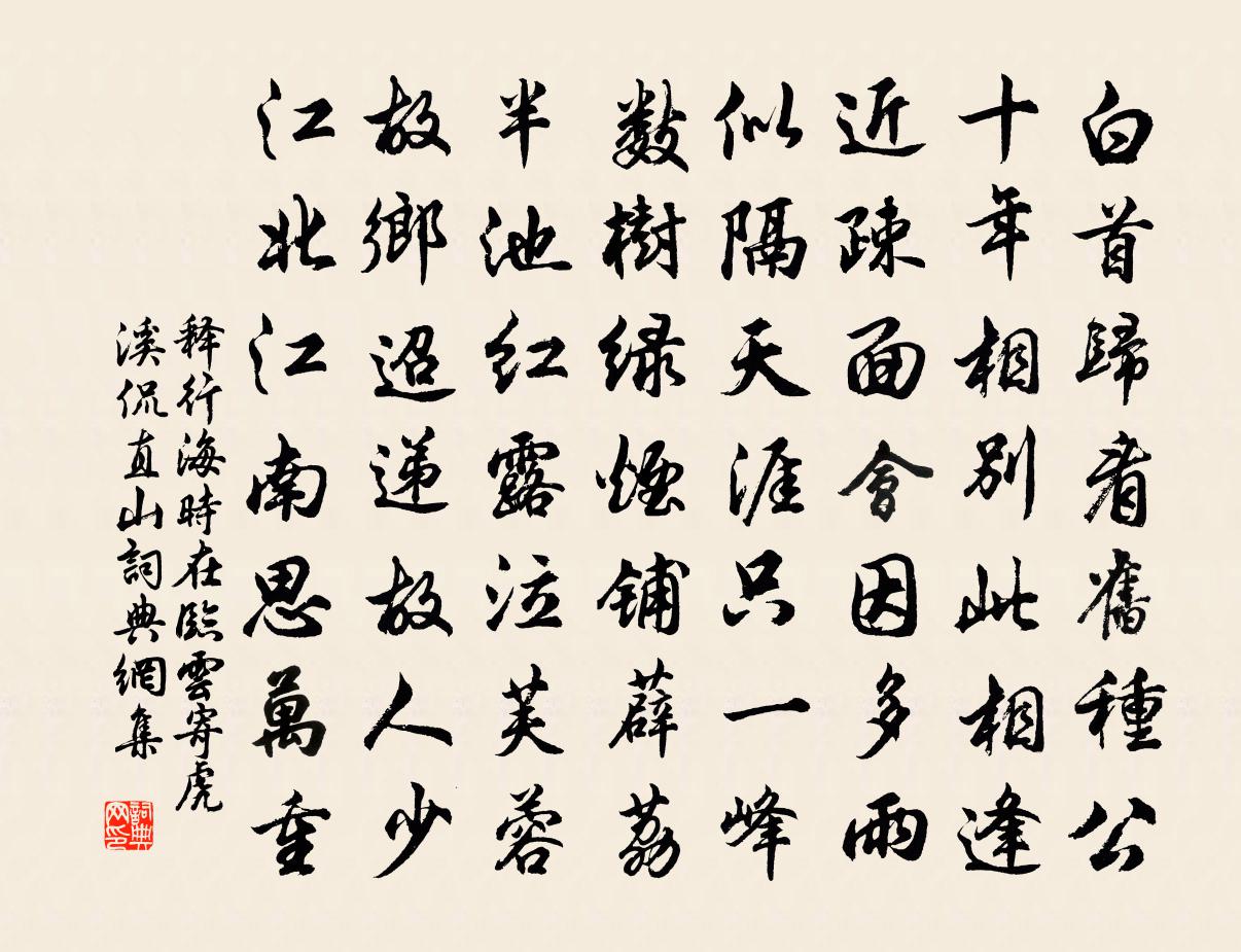 詩詞名句歷史字典書法欣賞書法字典國語詞典說文解字康熙字典古漢語字典標 題 作 者 詩 句 時在臨雲寄虎溪侃直山作者:釋行海 朝代:宋代時在臨雲寄虎溪侃直山原文白首歸看舊種公,十年相別此相逢。近疎面會因多雨,似隔天涯只一峰。數樹綠煙鋪薜荔,半池紅露泣芙蓉。故鄉迢遞故人少,江北江南思萬重。詩詞問答問:時在臨雲寄虎溪侃直山的作者是誰?答:釋行海問:時在臨雲寄虎溪侃直山寫於哪個朝代?答:宋代釋行海時在臨雲寄虎溪侃直山書法欣賞時在臨雲寄虎溪侃直山書法作品詩詞推薦題黃庭經後白玉蟾〔宋代〕琴心玉文洞玄玄,金鈕朱錦乃汝傳。子能得之可長年,黃素鎮贗完且堅。橫理如發約兩邊,從有赤道如朱弦。文居河傳(二之一)賀鑄〔宋代〕華堂張燕。向尊前妙選,舞裙歌扇。彼美個人,的的風流心眼。恨尋芳來晚。曲街燈火香塵散。猶約晨妝,一覘春和沈正卿諸公西湖賞梅仲並〔宋代〕一笑相逢水一涯,近檐猶記舊相知。似矜冰玉非凡骨,終倚雪霜開好枝。新綠成陰無幾日,微酸著子亦同時。諸公離蕪湖至觀頭橋梅堯臣〔宋代〕江口泊來久,菰蒲長舊苗。爭雛洲鵲斗,遺子浦魚跳。宿岸欣逢戍,歸船競趁潮。時時望鄉樹,已恨白雲遙。送張伯修省乾歸省重慶府一首度正〔宋代〕我昔赴英英,涪陵見尊公。尊公一世豪,一飲能千鍾。君時年尚少,已有尊公風。舉動如成人,吐語非凡童。別去癸未御前帖子三首曹勛〔宋代〕中原久已困膻腥,攻守知惟斷乃成。便有戎酋歸聖化,甘泉應得慰皇情。多景樓張蘊〔宋代〕假日此登臨,淒涼北望心。戍烽孤障杳,塔影一江深。黠虜投鞭想,將軍誓楫吟。所嗟人事異,天險古猶今。和出省歐陽修〔宋代〕僮奴襆被莫相催,待報霜台御史來。晴陌便當聯騎去,春風任放百花開。文章紙貴爭馳譽,朝野人言慶得才。共向竇朗州見示與澧州元郎中早秋贈答命同作劉禹錫〔唐代〕鄰境諸侯同舍郎,芷江蘭浦恨無梁。秋風門外旌旗動,曉露庭中橘柚香。玉簟微涼宜白晝,金笳入暮應清商,騷人頌古十七首釋大觀〔宋代〕自是兵家貴伐謀,鏖鋒擒敵未為優。沈沈刁斗三更月,玉帳威行紫塞秋。贈江西瑞上人至南海袖詩相過曾豐〔宋代〕六祖求衣從嶺出,六祖得衣從嶺入。半夜抽身不露機,凹頭解擔猶留跡。上人家住江之西,僕僕而南休所覓。雅意五日江亭即事陳杰〔宋代〕五日江城因遼望,畫橈不動美哉洋。人間昌歜誰同嗜,地下離騷只自香。折得玉蕖冰照坐,飛來鷗鳥雪為裳。一番建安寺西院喜王郎中遘恩命初至聯句皎然〔唐代〕跡就空門退,官從畫省遷。住持良有願,朝謁穴無緣。 ——王遘身淨金繩內,心馳玉扆前。 ——皎然榮添一兩論淡青色賈似道〔宋代〕頭紫葡萄項摻青,正身厚闊似鴉明。殼紋淡薄輕銀翅,鬭著交鋒速便贏。貧甚戲作絕句陸游〔宋代〕讀書但覺慚輪扁,補吏非能去箭張。白髮歸為林下叟,固應飢下饜糟糠。偈頌一百四十一首釋師範〔宋代〕錦包特石,鐵裹泥團。現成活計,格外鄉談。明眼衲僧會不得,月移梅影上欄乾。首尾吟邵雍〔宋代〕堯夫非是愛吟詩,詩是堯夫不強時。事到強為須涉跡,人能知止是先機。面前自有好田地,天下豈無平路坡。省力漫述黃庚〔宋代〕青春易過不多日,白書得間能幾人。有限光陰空役役,堆錢難買百年身。和危府教劉過〔宋代〕先生場屋文之虎,氣懾狐狸自不知。老去莫嫌官尚冷,灞橋風朋要新詩。十月初夢寄良嗣詩三句雲相思一載餘身共遠夢鄭剛中〔宋代〕武昌分別處,江岸倚籃輿。對飲三杯後,相思一載餘。身隨雲共遠,夢與汝同居。何日秋風夜,燈窗聽讀書。名句推薦少小雖非投筆吏,論功還欲請長纓。祖詠《望薊門》 遙想江口依然,鳥啼花謝,今日誰為主。王瀾《念奴嬌·避地溢江書於新亭》 風日薄、度牆啼鳥聲亂。盧祖皋《宴清都·初春》 百年成之不足,一旦壞之有餘。佚名《增廣賢文·上集》 村北村南布穀忙,村前村後稻花香。方向《詠儋耳二首》 西宮南內多秋草,落葉滿階紅不掃。白居易《長恨歌》 燒痕慘澹帶昏鴉,數盡寒梅未見花。陳孚《詠永州》 未知鹿死誰手房玄齡《晉書·載記·第五章》 弓背霞明劍照霜,秋風走馬出鹹陽。令狐楚《少年行四首·其三》 忠臣不借人以力,貞女不假人以色。劉向《列女傳·貞順傳·楚白貞姬》