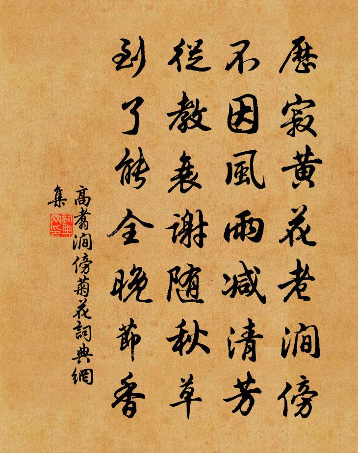 詩詞名句歷史字典書法欣賞書法字典國語詞典說文解字康熙字典古漢語字典標 題 作 者 詩 句 澗傍菊花作者:高翥 朝代:宋代澗傍菊花原文歷寂黃花老澗傍,不因風雨減清芳。從教衰謝隨秋草,到了能全晚節香。詩詞問答問:澗傍菊花的作者是誰?答:高翥問:澗傍菊花寫於哪個朝代?答:宋代高翥澗傍菊花書法欣賞澗傍菊花書法作品詩詞推薦上行杯孫光憲〔唐代〕草草離亭鞍馬,從遠道、此地分襟。燕宋秦吳千萬里,無辭一醉。野棠開,江草濕,佇立,沾泣,征騎駸駸。離棹上張丞相十首張元乾〔宋代〕賤子居閭里,明公總帥權。姓名誰比數,禮遇每周旋。老去無三窟,閒中有二天。知音何日報,願見中興年。留題蘭皋亭蘇軾〔宋代〕雪後東風未肯和,扣門遷客夜經過。不知舊竹生新筍,但見清伊換濁河。無復往來乘下澤,聊同笑語說東坡。明年四月二十三日始設酒禁試東坡羹一本港春味敖陶孫〔宋代〕去夏苦多雨,勢若無炎官,今晨迫重午,香黍仍膠槃。天機杳難測,人言亦多端。祗今原田上,立苗未妨寒。但願臨安邸中即事且謝誠齋惠詩十二首袁說友〔宋代〕急雨斜風一夜狂,客衾愁枕五更長。問君個裡情懷惡,不聽鵑啼也斷腸。踏莎行 繡床凝思 復古詩集五王國器〔元代〕翠藻文鴛,交枝連理。金針停處渾如醉。楊花一點是春心,鵑聲啼到人千里。喚醒離魂,猶疑夢裡。此情恰似東流鎮江之戰第十八文天祥〔宋代〕海胡舶千艘,肉食三十萬。江平不肯流,到今有遺恨。不怕鬼 / 曹司農竹虛言紀昀〔清代〕曹司農竹虛言,其族兄自歙往揚州,途經友人家。時盛夏,延坐書屋,甚軒爽,暮欲下榻其中。友人曰:“是有魅滿庭芳 立門戶內持馬鈺〔元代〕全真門戶,清淨根源。住行坐臥歸元。日用時時擒捉,意馬心猿。常行無憎無愛,便施恩、先復讎冤。下手處,練漁父詞(其十一)趙構〔宋代〕誰雲漁父是愚翁。一葉浮家萬慮空。輕破浪,細迎風。睡起篷窗日正中。鄭寺正輓辭王柏〔宋代〕坦溪渺渺兮配流慶之深長,園林帶宅兮風月無疆。鷗鷺受盟兮舉清觴,胡不百年兮長徜徉。澡身更服兮愙氣安詳,齋中有獸皮茵偶成詠羊士諤〔唐代〕逸才豈凡獸,服猛愚人得。山澤生異姿,蒙戎蔚佳色。青氈持與藉,重錦裁為飾。臥閣幸相宜,溫然承宴息。和范景仁王景彝殿中雜題三十八首並次韻其八梅堯臣〔宋代〕前殿臨朝百辟回,後宮廷閣九重開。鳴梢已自金階出,黃屋初迎玉輦來。不問偷桃方朔飽,誰知載戟子云才。群官曲肱詩二十首白玉蟾〔宋代〕太乙 * 謁紫清,翠娥百萬擁雲軿。當時不合抬頭看,忽見天丁叱火鈴。頌古九首釋梵思〔宋代〕臘月二十五,雲門一曲新。一回聞舉著,笑殺洛陽人。減字木蘭花尹志平〔元代〕天堂豈遠。舉世迷人尋不見。地獄非親。無限眾生寒斷門。聰明上士。幸得為人勤發志。志在心平。片善無遺道自春寒一首劉克莊〔宋代〕撥盡寒灰轉凜然,拋書數息暖丹田。蛩吟近作勝前作,鯨吸今年減去年。薄粥聊糊魯公口,重裘猶聳孟生肩。幾時城東觀杏花虞集〔元代〕明日城東看杏花,丁寧兒子早將車。路從丹鳳樓前過,酒向金魚館裡賒。綠水滿溝生杜若,暖雲將雨少塵沙。絕勝紹興祀皇地祗十五首佚名〔宋代〕皇矣藝祖,九圃是式。至哉柔祗,萬彙允殖。保茲嘉邦,介我黍稷。酌本告虔,作配無極。聞開元寺開筍園寄章上人皮日休〔唐代〕園鎖開聲駭鹿群,滿林鮮籜水犀文。森森競泫林梢雨,木雙木雙爭穿石上雲。並出亦如鵝管合,各生還似犬牙分。名句推薦謂誰朝來不作意,狂風挽斷最長條。杜甫《絕句漫興九首·其一》 忠臣不借人以力,貞女不假人以色。劉向《列女傳·貞順傳·楚白貞姬》 碧窗斜月藹深暉,愁聽寒螿淚濕衣張仲素《秋閨思二首》 名實相生,利用相成,是非相明,去就相安也。王通《中說·卷五·問易篇》 侈而墮者貧,而力而儉者富。韓非及後人《韓非子·顯學》 海畔尖山似劍鋩,秋來處處割愁腸。柳宗元《與浩初上人同看山寄京華親故》 蓼岸荻花中,隱映竹籬茅舍。張昪《離亭燕·一帶江山如畫》 故園渺何處,歸思方悠哉。韋應物《聞雁》 曉霧將歇,猿鳥亂鳴;陶弘景《答謝中書書》 鳥向檐上飛,雲從窗里出。吳均《山中雜詩》