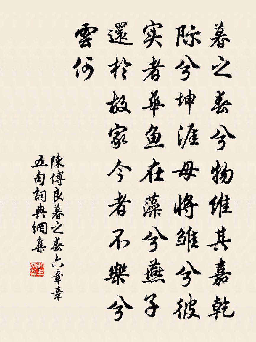 詩詞名句歷史字典書法欣賞書法字典國語詞典說文解字康熙字典古漢語字典標 題 作 者 詩 句 暮之春六章章五句作者:陳傅良 朝代:宋代暮之春六章章五句原文暮之春兮物維其嘉,乾際兮坤涯。母將雛兮彼實者華,魚在藻兮燕子還於故家,今者不樂兮云何。詩詞問答問:暮之春六章章五句的作者是誰?答:陳傅良問:暮之春六章章五句寫於哪個朝代?答:宋代陳傅良暮之春六章章五句書法欣賞暮之春六章章五句書法作品詩詞推薦清心鏡 詠長安馬鈺〔元代〕論長安,多美事。端的日有,三仙向市。滿城人、半做經商,半修煉真氣。壽長人,最多矣。因知罪福,早閒心地招文士飲孟郊〔唐代〕曹劉花不免死,花誰敢負年華。文士莫辭花,詩人命屬花。退之如放逐,李白自矜誇。萬古忽將似,一朝同嘆嗟。夏日山居好十首舒岳祥〔宋代〕夏日山居好,日長宜學文。金門堪避世,畝畝不忘君。林宿三冬雪,岩藏萬里雲。屈伸吾道在,何必雜人群。別高九萬劉克莊〔宋代〕花翁徒步悲詩境,菊磵舂糧哭復齋。眾客食魚彈鋏去,幾人白馬索車來。尋思舊事成三嘆,斷送諸賢入三哀。信矣過楊處士幽居姚合〔唐代〕引水穿風竹,幽聲勝遠溪。裁衣延野客,翦翅養山雞。酒熟聽琴酌,詩成削樹題。惟愁春氣暖,松下雪和泥。秋晚登樓望南江入始興郡路張九齡〔唐代〕潦收沙衍出,霜降天宇晶。伏檻一長眺,津途多遠情。思來江山外,望盡煙雲生。滔滔不自辨,役役且何成。我來論頭賈似道〔宋代〕大頭圓結菢,腦搭淺無多。絲路根根透,光明亮不摩。墨梅高吉〔宋代〕識破宮妝色是空,香魂分付與東風。黑雲潑眼催詩急,著我江頭春暗中。度門寺元稹〔唐代〕北祖三禪地,西山萬樹松。門臨溪一帶,橋映竹千重。翦鑿基階正,包藏景氣濃。諸岩分院宇,雙嶺抱垣墉。舍利故公子家葛秋崖〔宋代〕繡戶朱欄柳樹春,外間不識內間貧。白頭園子無支給,自種盆花賣與人。贈史坑冶二首袁燮〔宋代〕吾儒根本在修身,恬淡無為樂性真。此性本無塵可去,去塵猶是未離塵。上嚴廉訪十首熊禾〔宋代〕春秋得忠臣,炎紹猶有述。至今十七篇,末學或不識。乾淳有大儒,奏請非不力。一時欠良遇,志士重嗟惜。南堂五首蘇軾〔宋代〕暮年眼力嗟猶在,多病顛毛卻未華。故作明窗書小字,更開幽室養丹砂。久雨釋永頤〔宋代〕山房十日雨,仰棟持行蝸。筍暗風庭竹,萱凝晚砌花。罌紅留夕火,焙綠薦春芽。滴滴西窗下,清泉滿石窪。李郎中輓詞二首范成大〔宋代〕劇郡思賢牧,名曹失望郎。六參能幾日,兩鬢未全霜。霅水新阡遠,桐川舊隱荒。絕憐垂白母,淚身獨還鄉。新荷葉辛棄疾〔宋代〕物盛還衰,眼看 * 秋萁。貴賤交情,翟公門外人稀。酒酣耳熱,又何須、幽憤裁詩。茂林修竹,小園曲逕疏籬。陪元侍御春遊韋應物〔唐代〕何處 * ,長安西復東。不因俱罷職,豈得此時同。貰酒宣平里,尋芳下苑中。往來楊柳陌,猶避昔年驄。學無學頌一十五首釋印肅〔宋代〕戴起枯髏撞眼晴,燒香設拜甚精勤。一盲引眾誰人會,賺誤世間多少人。題盧十一所居(一作盧十)皇甫冉〔唐代〕春風來幾日,先入辟疆園。身外無餘事,閒吟晝閉門。喜遷鶯曹宰〔宋代〕梅含春信,冒北律嚴寒,南枝先暖。月上初弦,萱開九葉,嵩岳誕生英俊。冰玉丰姿瑩徹,錦繡文章煥爛。人歌贊名句推薦弓背霞明劍照霜,秋風走馬出鹹陽。令狐楚《少年行四首·其三》 留連光景惜朱顏,黃昏獨倚闌。李煜《阮郎歸·呈鄭王十二弟》 孤之有孔明,猶魚之有水也。陳壽《隆中對》 遙想獨游佳味少,無方騅馬但鳴嘶。蘇轍《懷澠池寄子瞻兄》 道人庭宇靜,苔色連深竹。柳宗元《晨詣超師院讀禪經》 長呼人,即代叫。人不在,己即到。李毓秀《弟子規·出則弟》 寄語東陽沽酒市,拼一醉,而今樂事他年淚。朱服《漁家傲·小雨纖纖風細細》 明妃留在兩眉愁,萬古春山顰不盡元好問《玉樓春·驚沙獵獵風成陣》 吳台直下,緗梅無限,未放野橋香度。吳文英《永遇樂·探梅次時齋韻》 東風灑雨露,會入天地春。李白《送郄昂謫巴中》