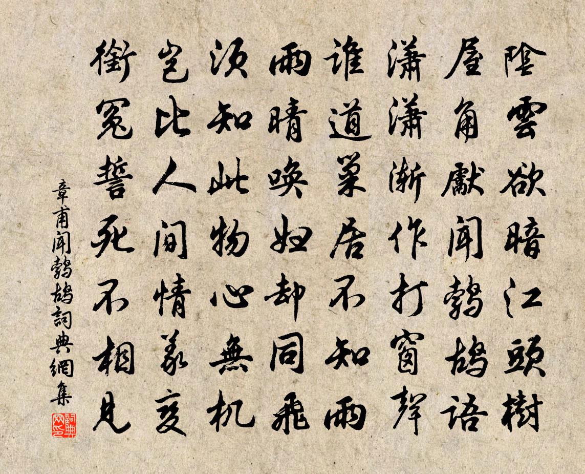 詩詞名句歷史字典書法欣賞書法字典國語詞典說文解字康熙字典古漢語字典標 題 作 者 詩 句 聞鵓鴣作者:章甫 朝代:宋代聞鵓鴣原文陰雲欲暗江頭樹,屋角先聞鵓鴣語。瀟瀟漸作打窗聲,誰道巢居不知雨。雨晴喚婦卻同飛,須知此物心無機。豈比人間情義變,銜冤誓死不相見。詩詞問答問:聞鵓鴣的作者是誰?答:章甫問:聞鵓鴣寫於哪個朝代?答:宋代章甫聞鵓鴣書法欣賞聞鵓鴣書法作品詩詞推薦胡旋女-戒近習也白居易〔唐代〕胡旋女,胡旋女。心應弦,手應鼓。弦鼓一聲雙袖舉,回雪飄颻轉蓬舞。左旋右轉不知疲,千匝萬周無已時。人間聞鹿生子吳芾〔宋代〕再上歸田疏,從違未可知。方憂鶴怨我,忽喜鹿生兒。六月事已驗,千年壽可期。我歸須汝健,正要汝相隨。和李校書沐川三絕魏了翁〔宋代〕靜看青山簇髻鬟,動觀碧水漱潺湲。若教此景來酆鄗,爭奮應成觸與蠻。華山尋隱者李頻〔唐代〕自入華山居,關東相見疏。瓢中誰寄酒,葉上我留書。巢鳥寒棲盡,潭泉暮凍余。長聞得藥力,此說又何如。學易陸游〔宋代〕卒歲勿多求,壼餐與褐裘。心安由自足,身貴為無求。易化千年鶴,難馴萬里鷗。閉門方學易,未暇揖浮丘。白髮傅夢得〔宋代〕勳業未能成,青銅照眼明。星霜驚入鬢,天地覺無情。才近半百歲,漸生三兩莖。兒童勸休鑷,浪得老成名。問遙山禪老皎然〔唐代〕天與松子壽,獨飲日月精。復令顏子賢,胡為夭其生。吾將尋河源,上天問天何不平?吾將詰仙老,大道無私誰強山中寄外龍輔〔宋代〕妾在山中來,郎在溪頭住。郎若泛舟尋,莫誤桃源路。定風波(大醉歸自葛園,家人有痛飲之戒,故書於壁)辛棄疾〔宋代〕昨夜山公倒載歸。兒童應笑醉如泥。試與扶頭渾未醒。休問。夢魂猶在葛家溪。千古醉鄉來往路。知處。溫柔東畔晚晴二首楊萬里〔宋代〕先生老態似枯禪,解後東風也欲顛。才雨便晴寒便暖,四時佳處是春天。感懷王冕〔元代〕客邸可言行路難,故園無便寄平安。夢回孤館燈火寂,吟到五更風雨寒。南國山川頻入夢,中原戎馬獨憑闌。田文示彌光禪人釋宗杲〔宋代〕龜毛牛得笑咍咍,一擊萬重關鎖開。慶快平生在今日,孰雲吉里賺吾來。滿庭芳 贈塗山於先生馬鈺〔元代〕閒閒搜獲,人家兒女。生前住在何處。有甚親親恩愛,與他相聚。生死不相替代,甚勞勞、為他辛苦。還省悟,便頌古十七首釋道行〔宋代〕堂堂白日上刀梯,任是崑崙眼亦迷。多謝門前案山子,春來秋去泄天機。抵豫章趙文〔宋代〕泊舟豫章城,黑潦滿道周。街衢未改昔,故舊罕所留。行投學子廬,假榻得小休。燈前作家書,豈為兒女謀。戒之到龍井寺鄭清之〔宋代〕竹門斜倚酒家簾,石路高低記水簾。炙背老農驚傴僂,乘肩痴女笑窺覘。數羝人立攀籬落,一蝶兒嬉掠繖檐。款約讀鄧魴詩白居易〔唐代〕塵架多文集,偶取一卷披。未及看姓名,疑是陶潛詩。看名知是君,惻惻令我悲。詩人多蹇厄,近日誠有之。京兆落花十絕馮時行〔宋代〕即看往往斗鮮妍,忽作漫天也可憐。隨雨隨風和有恨,恨無人著 * 錢。鄭德予同游桃花山次韻朱槔〔宋代〕春紅萬樹抱山斜,落落真源自一家。雲起坐中疑有雨,酒行杯麵恐飛花。塵緣未斷心雖勝,他日重來約尚賒。略倩直台元稹〔唐代〕麋入神羊隊,鳥驚海鷺眠。仍教百餘日,迎送直廳前。名句推薦靡蕪盈手泣斜暉,聞道鄰家夫婿歸。魚玄機《閨怨》 幸遇三杯酒好,況逢一朵花新。朱敦儒《西江月·世事短如春夢》 金陵子弟來相送,欲行不行各盡觴。李白《金陵酒肆留別》 活水源流隨處滿,東風花柳逐時新。于謙《觀書》 秋菊堪餐,春蘭可佩,留待先生手自栽。辛棄疾《沁園春·帶湖新居將成》 寒蟬淒切,對長亭晚,驟雨初歇。柳永《雨霖鈴·寒蟬淒切》 功名炊黍尋常夢,怪事書空感激人。王遜《西夏重陽》 滿目飛花萬點,回首故人千里,把酒沃愁腸。葛長庚《水調歌頭·江上春山遠》 白鳥明邊帆影直。隔江聞夜笛。周密《聞鵲喜·吳山觀濤》 春山碧樹秋重綠,人在武陵溪。劉基《眼兒媚·秋思》