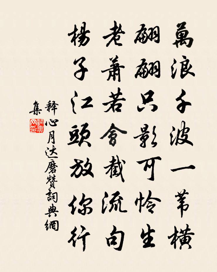 詩詞名句歷史字典書法欣賞書法字典國語詞典說文解字康熙字典古漢語字典標 題 作 者 詩 句 達磨贊作者:釋心月 朝代:宋代達磨贊原文萬浪千波一葦橫,翩翩隻影可憐生。老蕭若會截流句,楊子江頭放你行。詩詞問答問:達磨贊的作者是誰?答:釋心月問:達磨贊寫於哪個朝代?答:宋代釋心月達磨贊書法欣賞達磨贊書法作品詩詞推薦同金漢臣徐蜚英小飲傍溪寺二首方回〔宋代〕高憑無眺酒頻斟,誰識風前快飲心。州縣長官勝鄰境,秧疇水滿樹林陰。題所居西齋張耒〔宋代〕幽居不厭小,小院有深庭。一曲秋風地,低檐夕照明。脫條株有態,止水瑩含清。中有支離客,吟腰瘦沉卿。雜曲歌辭。入破第四佚名〔唐代〕行樂三陽早,芳菲二月春。閨中紅粉態,陌上看花人。郡齋讀經羊士諤〔唐代〕壯齡非濟物,柔翰誤為儒。及此齋心暇,翛然與道俱。散材誠獨善,正覺豈無徒。半偈蓮生水,幽香桂滿爐。息陰李公擇嘉裕帖贊岳珂〔宋代〕予登五老峰,其下蓋有山房焉。繚閣層廊,疏鬆秀篁,泉璆夜鳴,谷繡晨張。公方讀書其間,蓋已會此趣於胸中之春晚陸游〔宋代〕五十六翁身百憂,年來轉覺此生浮。山川信美故鄉遠,天地無情雙鬢秋。社後燕如歸客至,春殘花不為人留。一觴雪晴二首白玉蟾〔宋代〕早上新鶯語尚蠻,花無氣力倚雕欄。幸蒙殘雪回頭早,又遣東風薄倖寒。聞蛩陸游〔宋代〕稽首周公萬世師,小儒命薄不同時。秋蟲卻是生無憾,名在豳人七月詩。感皇恩沈端節〔宋代〕和氣靄微霄,黃雲飄轉。東閣觀梅負詩眼。滿斟綠酒,唱個曲兒親勸。願從今日去,長相見。寶幄歡濃,玉爐香軟石材廟題柱陳剛中〔宋代〕疏爵新剛應,論功舊石材。能形文母夢,還訝佞人來。海市為誰出,衡雲豈自開。乞靈如見告,逐客幾時回。送石賡歸寧王安石〔宋代〕虛名誤長者,邂逅肯經過。所操十餘篇,浩蕩決江河。側身朝市間,樂少悲慚多。文章舊所好,久已廢吟喔。開編郊壇齋宮七首任希夷〔宋代〕榮路輝輝日月依,雲霄奕奕孔鸞飛。輔臣對罷升金殿,日日絲絢侍袞衣。贈孔經甫賢良兼簡許少張狀元陳舜俞〔宋代〕晚泊帶姑孰浦,帶忽逢瀟湘帶人。口稱帶丹邱客,面帶湘江雲。此客骨不凡,九天之麒麟。新上紫煙頂,以頭觸天仗錫平老自都城回見訪索怡雲堂詩陸游〔宋代〕東華軟塵飛撲帽,黃金絡馬人看好。渠儂胸中誰得知,畏禍憂讒鬢先老。舉世輸與平元衡,青山白雲過一生;出門種藥梅堯臣〔宋代〕雲外陽翟山,實與嵩少接。山中採藥人,能自辨苗葉。當須斸其根,以遂素所愜。野籜包舊土,遠置風雨捷。故本憶西湖舊遊文同〔宋代〕西湖晴碧晚溶溶,與客常來坐好風。記得有人歌小玉,月明猶在畫船中。蓴菜二首徐似道〔宋代〕千里蓴絲未下鹽,北游誰復話江南。可憐一箸秋風味,錯被旁人苦未參。念良朋之難得嘆俗學之失真因成二絕胡宏〔宋代〕章句紛紛似世塵,一番空誤一番人。讀書不貴苟有說,離得語言才是真。和蓬萊老之兄卓宣教見遺釋寶曇〔宋代〕要結靈山未了緣,山中草木亦欣然。大江南北經年夢,明月東西一夜圓。龍象而今非故我,功名自古付華顛。相逢送延平張生歸南溪劉克莊〔宋代〕問訊南溪水,韓張泛幾回。侍郎何處在,司業有孫來。名句推薦君子不重則不威,學則不固。主忠信,無友不如己者,過,則勿憚改。孔子弟子《論語·學而篇》 天迥雲垂草,江空雪覆沙劉基《古戍》 憂勞可以興國,逸豫可以亡身歐陽修《伶官傳序》 翻被梨花冷看,人生苦戀天涯。張炎《朝中措·清明時節》 越人語天姥,雲霞明滅或可睹。李白《夢遊天姥吟留別 / 別東魯諸公》 禍褔無不自己求之者。孟子《孟子·公孫丑章句上·第四節》 峨眉山月半輪秋,影入平羌江水流。李白《峨眉山月歌》 射人先射馬,擒賊先擒王。杜甫《前出塞九首·其六》 暗相思,無處說,惆悵夜來煙月。韋莊《應天長·別來半歲音書絕》 嘆寄與路遙,夜雪初積。姜夔《暗香疏影》