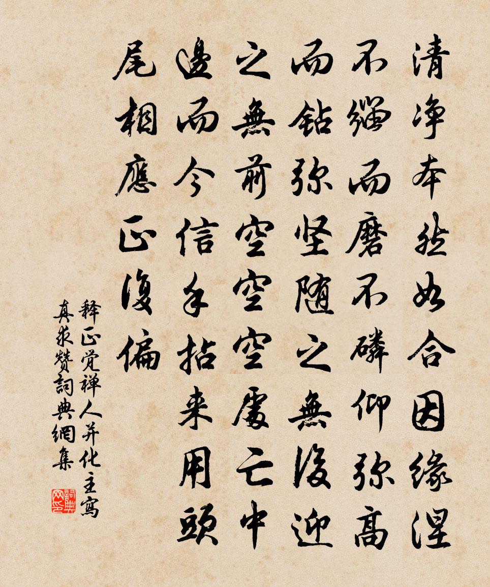 詩詞名句歷史字典書法欣賞書法字典國語詞典說文解字康熙字典古漢語字典標 題 作 者 詩 句 禪人並化主寫真求贊作者:釋正覺 朝代:宋代禪人並化主寫真求贊原文清淨本然,如合因緣。涅不緇而磨不磷,仰彌高而鑽彌堅。隨之無後,迎之無前,空空空處亡中邊。而今信手拈來用,頭尾相應正復偏。詩詞問答問:禪人並化主寫真求贊的作者是誰?答:釋正覺問:禪人並化主寫真求贊寫於哪個朝代?答:宋代釋正覺禪人並化主寫真求贊書法欣賞禪人並化主寫真求贊書法作品詩詞推薦和毛秀才江墅幽居好十首穆修〔宋代〕江墅幽居好,人間晚最孤。魚臨谿樹釣,鳥隔水煙呼。野竹掛薜荔,山花睡鷓鴣。畫工能狀出,羞殺輞川圖。丫頭岩徐元傑〔宋代〕丫頭不是女丫鬟,把作堅牢擔拄看。撐定東南天半壁,鎮教雙聳碧雲端。雨杜甫〔唐代〕峽雲行清曉,煙霧相裴回。風吹蒼江樹,雨灑石壁來。淒淒生餘寒,殷殷兼出雷。白谷變氣候,朱炎安在哉。高鳥題韋偃馬黃庭堅〔宋代〕韋侯常喜作群馬,杜陵詩中如見畫。忽開短卷六馬圖,想見詩老醉騎驢。龍眠作馬晚更妙,至今似覺韋偃少。一洗擬古蘇泂〔宋代〕自吾蜀中歸,稍拂衣上塵。古今名利場,誤殺多各市地人。歸囊課宿有,頗欲謀其身。買花郡庠東,結屋清鏡濱。蘇幕遮史佐堯〔宋代〕柳垂金,梅褪玉。昴宿呈祥,符應生公族。蓋世功名夸九牧。黼袞褒揚,慶閥輝南北。賜宮醪,分篤。天與長生酬朱適園訪見詩潘璵〔宋代〕曾同山友過江湄,何處清游晚未歸。沽酒□羊來好語,開籠放鶴在何時。雲方卷葉收春雨,柳未吹花點客衣。京洛蒙恩復畀明道祠寄呈趙克勤吏部三首劉克莊〔宋代〕雲台玉局舊曾諳,回首茅山亦再監。惟有毫祠尤久任,白頭三度入冰銜。贈督師曹將軍毛直方〔宋代〕泰階煌煌色已齊,祥飆為掃蚩尤旗。幅員浩蕩春台熙,不遺桴鼓驚鋤犁。羽林宿衛環三陲,居安節慮忘戰危。整暇上曹憲使五十韻程公許〔宋代〕驥不稱其力,文當與德兼。褊能多悻悻,小器成沾沾。行世吾誰與,窺公意自厭,秉心漫以格,植操靜而廉。信矣紹興二十八年祀圜丘學士院〔宋代〕肆類上帝,懷柔百神。槀秸既設,珪幣既陳。精誠潛交,已事而竣。佑我億載,基圖日新。次韻鄭僉判方岳〔宋代〕詩窮不易辦亭材,只恁荒寒處處苔。種秫便當終老去,愛花能有幾人來。生前尺足竹三逕,身外無窮水一杯。未必壽曾主管陳亮〔宋代〕累世名稱閥閱高,縉紳維復似英誼。寵才鹹許致千里,小試先觀夢四刀。方正寧容遷嶽麓,清明端可鑑絲毫。文章白髮吟杜荀鶴〔唐代〕一莖兩莖初似絲,不妨驚度少年時。幾人亂世得及此,今我滿頭何足悲。九轉靈丹那勝酒,五音清樂未如詩。家山道中二首宋祁〔宋代〕故歲南趨壽,今茲北向陳。淹留桂枝客,還入玉關人。鬢髮都成葆,纓瓖幸濯塵。心知來往數,不敢問迷津。題鶴鳴亭辛棄疾〔宋代〕林下蕭然一禿翁,斜陽扶杖對西風。功名此去心如水,富貴由來色是空。便好洗心依佛祖,不妨強笑伴兒童。客來鷓鴣天晏幾道〔宋代〕曉日迎長歲歲同,太平簫鼓間歌鐘。雲高未有前村雪,梅小初開昨夜風。羅幕翠,錦筵紅,釵頭羅勝寫宜冬。從今懷素上人草書歌佚名〔唐代〕吾觀文士多利用,筆精墨妙誠堪重。身上藝能無不通,就中草聖最天縱。有時興酣發神機,抽毫點墨縱橫揮。風聲嵩山十志十首樾館盧鴻一〔唐代〕紫岩隈兮青谿側,雲松煙蔦兮千古色。芳靃蘼兮蔭蒙蘢,幽人構館兮在其中。靃蘼蒙蘢兮開樾館,臥風霄兮坐霞旦慶餘思永冠游九言〔宋代〕今日□□仲,榮加首服新。從今棄幼志,當自勉成人。處事與接物,從兄以事親。聖賢有謨訓,盍亦謹書紳。名句推薦誤落塵網中,一去三十年。陶淵明《歸園田居·其一》 清風徐來,水波不興。蘇軾《前赤壁賦》 生平未報國,留作忠魂補。楊繼盛《就義詩》 居家戒爭訟,訟則終凶;處世戒多言,言多必失。朱柏廬《朱子家訓·全文》 遠村秋色如畫,紅樹間疏黃。晏殊《訴衷情·芙蓉金菊斗馨香》 還作一段相思,冷波葉舞愁紅,送人雙槳。吳文英《解蹀躞·醉雲又兼醒雨》 人心不足蛇吞象。馮夢龍《警世通言·卷二十五》 百囀千聲隨意移,山花紅紫樹高低。歐陽修《畫眉鳥》 青海長雲暗雪山,孤城遙望玉門關。王昌齡《從軍行七首·其四》 情人怨遙夜,竟夕起相思。張九齡《望月懷遠》