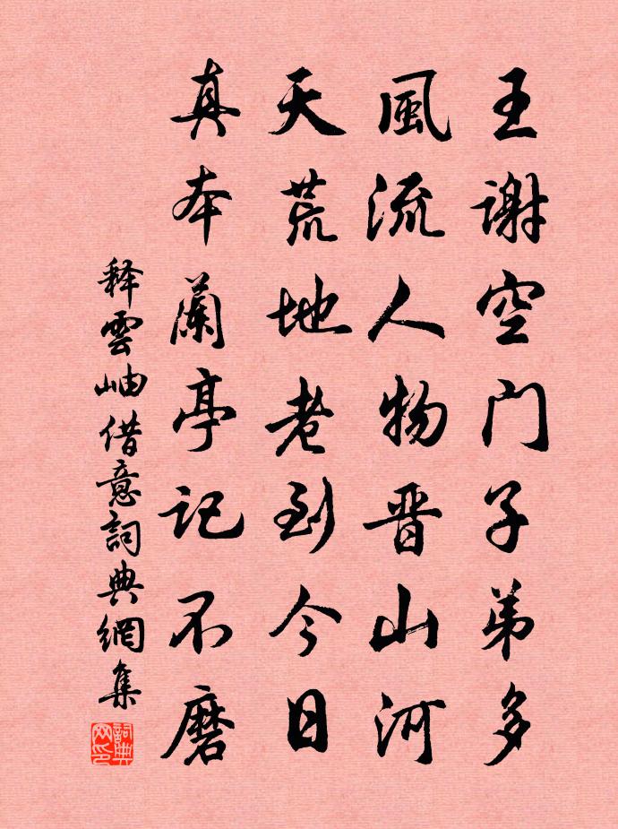 詩詞名句歷史字典書法欣賞書法字典國語詞典說文解字康熙字典古漢語字典標 題 作 者 詩 句 借意作者:釋雲岫 朝代:宋代借意原文王謝空門子弟多,風流人物晉山河。天荒地老到今日,真本蘭亭記不磨。詩詞問答問:借意的作者是誰?答:釋雲岫問:借意寫於哪個朝代?答:宋代釋雲岫借意書法欣賞借意書法作品詩詞推薦翠屏列畫蔣晉〔宋代〕青峰如屏高插天,懸崖積翠生雲煙。誰把王維舊墨跡,巍巍高掛安居前。勝景應知世稀有,妙學丹青乃縮手。嗟哉乾興御樓二首佚名〔宋代〕夾鍾紀月,初吉在辰。書靈流慶,布德推仁。采章震耀,典禮具陳。茂昭丕貺,永庇斯民。登太白峰李白〔唐代〕西上太白峰,夕陽窮登攀。太白與我語,為我開天關。願乘泠風去,直出浮雲間。舉手可近月,前行若無山。一別圓機寵以長句賀禱雪龍池輒次韻述謝晁說之〔宋代〕神州鐘鼓浹年豐,燈焰紅綿照景龍。況有玉楚榮廣內,不勞金甲老邊封。同雲出洞如人意,孤宦臨岐歛病容。何事擬孫權答曹操書蘇軾〔宋代〕權白孟德足下:辱書開示禍福,使之內殺子布,外擒劉備以自效。書辭勤款,若出至誠,雖三尺童子,亦曉然知利贈江南從事張侍郎陳陶〔唐代〕平南門館鳳凰毛,二十華軒立最高。幾處談天致雲雨,早時文海得鯨鰲。姻聯紫府蕭窗貴,職稱青錢繡服豪。江徼白衣人簡淨人呈度牒釋居簡〔宋代〕袖出天書喜動容,從來汗馬不言功。長鞭未舉追風去,回首相尋異類中。祝英台近辛棄疾〔宋代〕綠楊堤,青草渡。花片水流去。百舌聲中,喚起海棠睡。斷腸幾點愁紅,蹄痕猶在,多應怨、夜來風雨。別情苦。題蘇文忠與鄧安惠西山唱和魏了翁〔宋代〕春風吹屧上黃岡,獨倚斜陽看武昌。城郭山川幾興廢,只留元佑姓名香。偈釋宣能〔宋代〕石鞏箭,秘魔叉。直下會得,眼裡空華。堪悲堪笑少林客,暗攜只履度流沙。春山行貫休〔唐代〕重疊太古色,濛濛花雨時。好峰行恐盡,流水語相隨。黑壤生紅黍,黃猿領白兒。因思石橋月,曾與故人期。送張升之四首項安世〔宋代〕天公昨日我為悲,陰雲慘慘風淒淒。天公今日為我喜,朝陽晃晃融新泥。一悲復一喜,天意良有以。悲我東齋別心送崔五太守王維〔唐代〕長安廄吏來到門,朱文露網動行軒。黃花縣西九折坂,玉樹宮南五丈原。褒斜谷中不容幰,唯有白雲當露冕。子午有懷十首劉子翬〔宋代〕曾訪高人上翠峰,至今清興逐松風。籃輿夢想行山處,白葛花開細雨中。風旛堂二首劉克莊〔宋代〕告子早不動,先師四十餘。乃知盧行者,暗合秀才書。玉台體范成大〔宋代〕卷幔燈千朵,鉤簾月半弓。繡鴛翔瀝水,金雀跂屏風。細意翩長袖,多情結短封。銅壺從婉娩,玉佩正丁東。賣花翁吳融〔唐代〕和煙和露一叢花,擔入宮城許史家。惆悵東風無處說,不教閒地著春華。七哀詩曹植〔魏晉〕膏沐誰為容。明鏡闇不治。江次蘇泂〔宋代〕舟閣山橫水見沙,黃塵為客鬢初華。江春寂寂歸無計,一樹臨風落杏花。杜君章家賦海棠二首韓維〔宋代〕長條無風亦自動,繁艷著雨更相宜。少陵不奈被花惱,終日顛狂覓酒卮。名句推薦關西老將不勝愁,駐馬聽之雙淚流。王維《隴頭吟》 畫樓洗淨鴛鴦瓦,彩繩半濕鞦韆架。王元鼎《醉太平·寒食》 花明柳暗繞天愁,上盡重城更上樓。李商隱《夕陽樓》 人世幾回傷往事,山形依舊枕寒流。劉禹錫《西塞山懷古》 薄倖郎君何日到,想自當初,莫要相逢好。施耐庵《蝶戀花·一別家山音信杳》 律回歲晚冰霜少,春到人間草木知。張栻《立春偶成》 小知不可使謀事,小忠不可使主法。韓非及後人《韓非子·飾邪》 槲葉落山路,枳花明驛牆。溫庭筠《商山早行》 恭敬不如從命。曹雪芹《紅樓夢·第六十二回》 幸非一人,專固害。來俊臣《羅織經·治下卷第三》