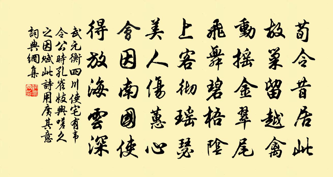 詩詞名句歷史字典書法欣賞書法字典國語詞典說文解字康熙字典古漢語字典標 題 作 者 詩 句 四川使宅有韋令公時孔雀…妓興嗟久之因賦此詩用廣其意作者:武元衡 朝代:唐代原文荀令昔居此,故巢留越禽。動搖金翠尾,飛舞碧梧陰。上客徹瑤瑟,美人傷蕙心。會因南國使,得放海雲深。詩詞問答問:《四川使宅有韋令公時孔雀…妓興嗟久之因賦此詩用廣其意》的作者是誰?答:武元衡問:該詩寫於哪個朝代?答:唐代書法欣賞四川使宅有韋令公時孔雀…妓興嗟久之因賦此詩用廣其意書法作品注釋全唐詩:卷316-32詩詞推薦宿玉泉寺周朴〔唐代〕野寺度殘夏,空房欲暮時。夜聽猿不睡,秋思客先知。竹迥煙生薄,山高月上遲。又登塵路去,難與老僧期。玉田八景文筆夕照李堪〔宋代〕玉邑東南第一峰,銛錐穎脫亂山中。夕陽影里分明見,五色文章耀筆鋒。茅齋納蘭性德〔清代〕閒亭照白日,一室羅古今。偶焉此棲遲,抱膝悠然吟。吟罷有餘適,散矚復披襟。時開玉懷卷,或彈珠柱琴。檐樹何滿子和凝〔唐代〕正是破瓜年幾,含情慣得人饒。桃李精神鸚鵡舌,可堪虛度良宵。卻愛藍羅裙子,羨他長束纖腰。寫得魚箋無限,送施宣教王炎〔宋代〕翩翩貴公子,和氣如春溫。傾蓋一晤語,肯吐胸中真。江頭雨新霽,浮鷁波鱗鱗。騎鳳吹玉簫,歸歟覲慈親。我老馬華父母葉氏輓詞王柏〔宋代〕苕溪猩鬼兮呼嘯幽篁,繡衣一出兮血膏斧鋩。笳鼓歸來兮拜舞北堂,潢池夷靖兮母訓是將。慈顏開喜兮家國之祥,右陳宓〔宋代〕詩跨唐人未數錢,定應妙思入風煙。才堪 * 華寧老,句得驚人即是仙。世事但將酬一醉,侯封那可敵千篇。天葩上益公十絕為壽壽鹿劉過〔宋代〕年永曾聞葛稚川,玉京何處錦紋鮮。賞花應制嘉賓宴,小雅當為第一篇。贈陳君景初王安石〔宋代〕吾嘗奇華佗,腸胃真割剖。神膏既傅之,頃刻活殘朽。昔聞今則信,絕伎世嘗有。堂堂潁川士,察脈極淵藪。珍丸西河(和舊韻)吳潛〔宋代〕都會地,東南盛府堪記。蓬萊縹緲十洲中,雉城擁起。憑高一盼大江橫,遙連滄海無際。壁同眾山翠倚。赤龍、白靈濟庵主僧泉蒙山招飲偶成陳著〔宋代〕水面巧安排,軒窗爽豁哉。橋關江氣定,門約市聲開。遠景天相送,清風客自來。夜床涼睡足,有夢到蓬萊。過九疑馬大同〔宋代〕帝德於今祀萬年,如何遺像托疏椽。憑誰為假丹青手,付與梅仙十萬錢。好事近(同茶漕二使者登大慈寺樓,次前韻)京鏜〔宋代〕傑閣聳層霄,幾度曉風殘月。同是鵷行舊侶,慰十年離別。一杯相屬莫留殘,試倚闌乾說。趁取簪花綠鬢,未駸駸櫻桃煎楊萬里〔宋代〕含桃丹更圜,輕質觸必碎。外看千粒珠,中藏半泓水。何人弄好手?萬顆搗虛脆。印成花鈿薄,染作水澌紫。北果醉留東野韓愈〔唐代〕昔年因讀李白杜甫詩,長恨二人不相從。吾與東野生並世,如何復躡二子蹤。東野不得官,白首夸龍鍾。韓子稍奸窺園張耒〔宋代〕吾老懶讀書,得閒嘗窺園。愛此千樹雪,高低不勝繁。衝風掠之去,頗已隨沙塵。感之可奈何,我豈土木人。畏病甘露歌上呈留守門下侍郎蘇泂〔宋代〕太微淵默嚴不動,斗為其車運中央。四序迴旋變造化,一杓直指無偏傍。柄臣比之號八柱,一柱難闕各有當。紹熙池上構小山詠懷羊士諤〔唐代〕玉立出岩石,風清曲□□。偶成聊近意,靜對想凝神。牛渚中流月,蘭亭上道春。古來心可見,寂寞為斯人。秋雨初霽試筆陸游〔宋代〕墨入紅絲點漆濃,閒將倦筆寫秋容。雨聲已斷時聞滴,雲氣將歸別起峰。斜日半穿臨水竹,好風遙送隔城鍾。遠遊秋塘曉望吳商浩〔唐代〕鍾盡疏桐散曙鴉,故山煙樹隔天涯。西風一夜秋塘曉,零落幾多紅藕花。名句推薦柳帶搖風漢水濱,平蕪兩岸爭勻。牛希濟《臨江仙·柳帶搖風漢水濱》 凡令之行也,必待近者之勝也,而令乃行。管仲《管子·重令》 禪心朗照千江月,真性情涵萬里天。吳承恩《西遊記·第八回》 萬里無人收白骨,家家城下招魂葬。張籍《征婦怨》 遠書歸夢兩悠悠,只有空床敵素秋。李商隱《端居》 清風明月無人管,並作南樓一味涼。黃庭堅《鄂州南樓書事》 鄉書不可寄,秋雁又南回。韋莊《章台夜思》 萬壑樹參天,千山響杜鵑。王維《送梓州李使君》 不見又思量,見了還依舊。李之儀《謝池春·殘寒銷盡》 羈鳥戀舊林,池魚思故淵。陶淵明《歸園田居·其一》