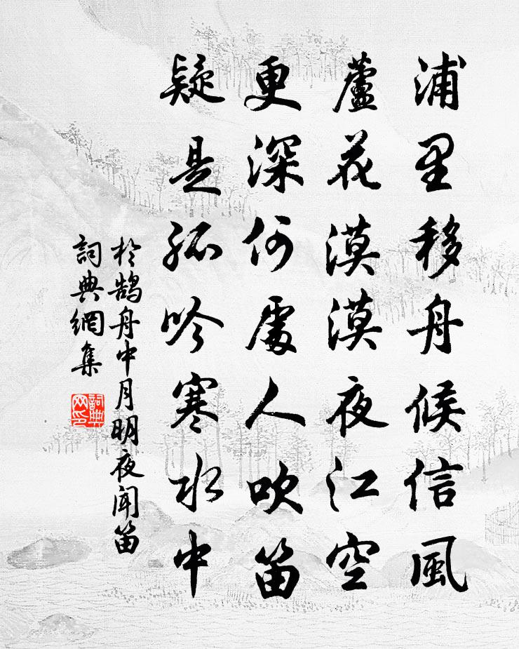 詩詞名句歷史字典書法欣賞書法字典國語詞典說文解字康熙字典古漢語字典標 題 作 者 詩 句 舟中月明夜聞笛作者:於鵠 朝代:唐代舟中月明夜聞笛原文浦里移舟候信風,蘆花漠漠夜江空。更深何處人吹笛,疑是孤吟寒水中。詩詞問答問:舟中月明夜聞笛的作者是誰?答:於鵠問:舟中月明夜聞笛寫於哪個朝代?答:唐代問:舟中月明夜聞笛是什麼體裁?答:七絕於鵠舟中月明夜聞笛書法欣賞舟中月明夜聞笛書法作品注釋全唐詩:卷310-40詩詞推薦春日重至南徐舊居周賀〔唐代〕綠水陰空院,春深喜再來。獨眠從草長,留酒看花開。過雨還山出,向風孤鳥回。忽思秋夕事,雲物卻悠哉。賀新郎黃人傑〔宋代〕曉色收梅雨。玉衡高、寒杓插午,月生銀浦。一片祥光橫碧落,幻出新晴院宇。擁閬苑、擎香天女。簇引飛仙來瑞百字令 燕城晚望張翥〔元代〕碧天向晚,遠雲開疑是、江南山色。渺渺孤鴻殘照外,獨上高城望極。雞散台空,螢沉苑廢,龍去溝無跡。英雄安秋胡行 其一曹操〔魏晉〕晨上散關山,此道當何難!晨上散關山,此道當何難!牛頓不起,車墮谷間。坐磐石之上,彈五弦之琴。作為清角偃柏李廌〔宋代〕名園氣虛闊,怪柏獨凝偃。高枝翳浮雲,翻然志飄遠。赤松來何遲,黃鶴去未返。蘇武游虜庭,矜傲何蹇蹇。朔風人日重宴大明宮賜彩縷人勝應制沈佺期〔唐代〕拂旦雞鳴仙衛陳,憑高龍首帝城春。千官黼帳杯前壽,百福香奩勝里人。山鳥初來猶怯囀,林花未發已偷新。天文送梵才大師歸天台葉清臣〔宋代〕江水望不極,楊花江面飛。春風自無定,遠客又言歸。景勝詩逾老,心冥語亦稀。從來林下意,為謝北山薇。留汪子明徐瑞〔宋代〕美人渺渺隔秋水,六年不見心茫茫。麥昴黍低各自媚,鶴長鎬短庸何傷。荷鑰未未素業在,讀憶具來真味長。是間懷濟北弟侄晁說之〔宋代〕久客思吾子,生涯滯故鄉。獨攜高士傳,翻憶紫香囊。合榻言猶在,同堂樂未央。翩翩春草夢,隨意遶池塘。觀拽龍舟懷裴宋韓李梅堯臣〔宋代〕截春流,築沙坻。拽龍舟,過天池。尾矯矯,角岐岐。千夫推,萬鱗隨。驚鴻鵠,沉魚龜。春三月,輕服時。薄水跋忠敏任公遣帖楊萬里〔宋代〕巿中貨鵷作參苓,遮莫秦和若口爭。殺盡蒼生消底物,卞京兩把老蔓菁。走筆次韻芻父喜雨三首蘇泂〔宋代〕薰兮有南風,下此沛然雨。後天初震怒,盍燎緇黃侶。端來丹山鳳,況戢螽斯羽。君詩如民謠,能共天公語。臨卒書詩古成之〔宋代〕物外乾坤誰得到,壺中日月我曾游。留今留古曾留得,一醉浮生萬事休。白鶴峰張祉〔宋代〕我登白鶴峰,下窺滄海日。色與朱橘同,形比彈丸一。夜半佇玩間,無質而生質。所以神仙侶, * 須超出。葬西施輓歌王炎〔宋代〕西望吳王國,雲書鳳字牌。連江起珠帳,擇地葬金釵。滿地紅心草,三層碧玉階。春風無處所,淒恨不勝懷。演雅十章張至龍〔宋代〕蠶飽辦絲課,蜂忙供蜜工。役役為人勞,衣食還自空。賀新郎(丙辰自壽、游景泰小隱作)李昴英〔宋代〕天地中間大。縱遨遊、登山臨水,散人一個。學易已來秋又六,肯趁名韁利鎖。得日日、安閒笑過。金馬玉堂也曾大行皇帝輓詩六首劉克莊〔宋代〕英鑒高千古,名尤不假人。周惟十夫哲,漢止一儒醇。聖筆嚴褒貶,臣材豈擬倫。驪珠六十九,誰謂橐中貧。句范氏子〔唐代〕掃葉隨風便,澆花趁日陰。閒雲生不雨,病葉落非秋。題一犁春雨圖後劉過〔宋代〕阿耘無田食破硯,奉親日糴供朝飯。有田正恐拙把犂,何得更為圖畫看。汝父名汝汝當知,有田無田未可期。有田名句推薦居必擇鄉,游必就士。荀子《荀子·勸學》 反古者未必可非,循禮者未足多是也。商鞅《商君書·更法》 李白乘舟將欲行,忽聞岸上踏歌聲。李白《贈汪倫》 津橋春水浸紅霞,煙柳風絲拂岸斜。雍陶《天津橋望春》 張翰江東去,正值秋風時。李白《送張舍人之江東》 春到南樓雪盡。驚動燈期花信。万俟詠《昭君怨·春到南樓雪盡》 誠信者,天下之結也。管仲《管子·樞言》 柏府樓台銜倒影,茅茨松竹瀉寒聲。王守仁《次韻陸僉憲元日春晴》 求備之心,可用之以修身,不可用之心接物王永彬《圍爐夜話·第一五九則》 取次花叢懶回顧,半緣修道半緣君。元稹《離思五首·其四》
