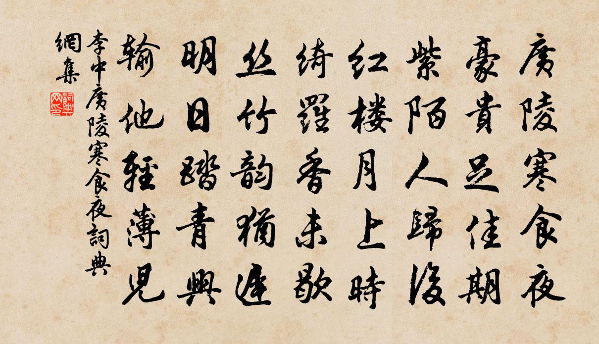 詩詞名句歷史字典書法欣賞書法字典國語詞典說文解字康熙字典古漢語字典標 題 作 者 詩 句 廣陵寒食夜作者:李中 朝代:唐代廣陵寒食夜原文廣陵寒食夜,豪貴足佳期。紫陌人歸後,紅樓月上時。綺羅香未歇,絲竹韻猶遲。明日踏青興,輸他輕薄兒。詩詞問答問:廣陵寒食夜的作者是誰?答:李中問:廣陵寒食夜寫於哪個朝代?答:唐代問:廣陵寒食夜是什麼體裁?答:五律李中廣陵寒食夜書法欣賞廣陵寒食夜書法作品注釋全唐詩:卷749-33詩詞推薦鄂州節推陳榮緒惠示沿檄崇陽道中六詩老懶不黃庭堅〔宋代〕張公少為令,愍俗有遺書。左販洞庭橘,右擔彭蠡魚。歌奔中夜女,歸抱十年雛。近歲多儒學,仁風似有初。破虜凱歌六首周麟之〔宋代〕將軍羽扇自臨戎,帳下健兒爭立功。鐵馬莫來淮上牧,漢家旗纛半天紅。金剛隨機無盡頌知見不生分第三十一釋印肅〔宋代〕能有幾人知。鼓是兩頭皮,禾山打不迷。道吾聞舉笏,句蕭敬夫〔宋代〕八風捲地翻雷雨,萬甲從天驟雪騣。雨晴杜甫〔唐代〕雨時山不改,晴罷峽如新。天路看殊俗,秋江思 * 。有猿揮淚盡,無犬附書頻。故國愁眉外,長歌欲損神。早飯後戲作陸游〔宋代〕髯須主簿方用事,冰壼先生來解圍。蠻童取火炷香碗,不讀南華誰與歸?支詩佚名〔先秦〕天之所支。不可壞也。其所壞亦不可支也。紹興二十八年祀圜丘學士院〔宋代〕肆類上帝,懷柔百神。槀秸既設,珪幣既陳。精誠潛交,已事而竣。佑我億載,基圖日新。歸興方回〔宋代〕投老深知萬事難,骨骸熬暑又煎寒。暗量已覺窮無敵,退省猶須強自寬。稚子能吟青玉案,異人初付紫金丹。先生早春微雨李山甫〔唐代〕怪來鶯蝶似凝愁,不覺看花暫濕頭。疏影未藏千里樹,遠陰微翳萬家樓。青羅舞袖紛紛轉,紅臉啼珠旋旋收。歲旱晚春劉希夷〔唐代〕佳人眠洞房,回首見垂楊。寒盡鴛鴦被,春生玳瑁床。庭陰幕青靄,簾影散紅芳。寄語同心伴,迎春且薄妝。贈別營妓卿卿油蔚〔唐代〕憐君無那是多情,枕上相看直到明。日照綠窗人去住,鴉啼紅粉淚縱橫。愁腸只向金閨斷,白髮應從玉塞生。為報次前韻督高秀才和詩項安世〔宋代〕一雪來何暮,經年望已深。狂於三月絮,清甚九皋禽。縱未扁舟興,能忘五字心。如何高處士,斷得此時吟。金菊對芙蓉元好問〔金代〕銀燭文章搖紅,獸文章煙噴翠,文章正小春時文章候,愛日和融。玉□法日生英傑,天付與、道骨仙風。文章冠世江梅曾協〔宋代〕北風號喬林,萬象無容姿。高標自有時,正與冰雪宜。老乾儼枯木,疏花粲橫枝。刻玉費天巧,不為俗跟窺。托質答內翰學士舒雅〔宋代〕清貴無過近侍臣,多情猶憶舊交親。金蓮燭下裁詩句,麟角峰前寄隱淪。和氣忽飄燕谷暖,好風徐起謝庭春。緘藏書事戴復古〔宋代〕喜作羊城客,忘為鶴髮翁。問天求酒量,翻海洗詩窮。已過西南道,適遭東北風。扁舟載明月,枉作賣油公。山中寄友人李九齡〔唐代〕亂雲堆里結茅廬,已共紅塵跡漸疏。莫問野人生計事,窗前流水枕前書。曉行望雲山楊萬里〔宋代〕霽天欲曉未明間,滿目奇峰總可觀。卻有一峰忽然長,方知不動是真山。念奴嬌(坐上次王伯開韻)李彌遜〔宋代〕風簾弄影,正閒堂永晝,香銷人寂。軋軋鄰機芳思亂,愁入回文新織。燕蹴巢泥,鶯喧庭柳,好夢無蹤跡。那堪春名句推薦三日柴門擁不開,階平庭滿白皚皚。柳宗元《酬王二十舍人雪中見寄》 回首天涯歸夢,幾魂飛西浦,淚灑東州。周密《一萼紅·登蓬萊閣有感》 望征路愁迷,離緒難整陸叡《瑞鶴仙梅》 春去花還在,人來鳥不驚。王維《畫》 風波不信菱枝弱,月露誰教桂葉香李商隱《無題·重幃深下莫愁堂》 渡頭餘落日,墟里上孤煙。王維《輞川閒居贈裴秀才迪》 為誰醉倒為誰醒,到今猶恨輕離別。呂本中《踏莎行·雪似梅花》 鎖離愁,連綿無際,來時陌上初熏。韓縝《鳳簫吟·鎖離愁》 黃華自與西風約,白髮先從遠客生。元好問《秋懷》 他年我若為青帝,報與桃花一處開。黃巢《題菊花》