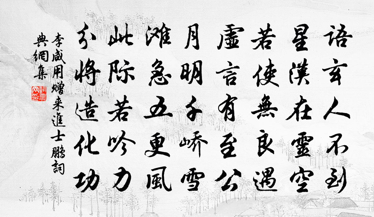 詩詞名句歷史字典書法欣賞書法字典國語詞典說文解字康熙字典古漢語字典標 題 作 者 詩 句 贈來進士鵬作者:李鹹用 朝代:唐代贈來進士鵬原文語玄人不到,星漢在靈空。若使無良遇,虛言有至公。月明千嶠雪,灘急五更風。此際若吟力,分將造化功。詩詞問答問:贈來進士鵬的作者是誰?答:李鹹用問:贈來進士鵬寫於哪個朝代?答:唐代問:贈來進士鵬是什麼體裁?答:五律李鹹用贈來進士鵬書法欣賞贈來進士鵬書法作品注釋全唐詩:卷645-27詩詞推薦望江南/憶江南佚名〔宋代〕左右字,從古不曾聞。未必書生能點墨,安知蔭子不能文。爾汝今朝。除去了,多謝聖明恩。既不可高談闊論,又下山歌宋之問〔唐代〕下嵩山兮多所思,攜佳人兮步遲遲。松間明月長如此,君再游兮復何時?題曹溪祖師堂貫休〔唐代〕皎潔曹溪月,嵯峨七寶林。空傳智藥記,豈見祖禪心。信衣非苧麻,白雲無知音。大哉雙峰溪,萬古青沈沈。泊上虞驛來日行四首陳造〔宋代〕梁湖莽蒼外,後去未雲遲。縣市容吾戀,江潮不汝期。用伯修韻迓虞提刑洪咨夔〔宋代〕從來圖易必思艱,運甓工夫莫放閒。萬里功名終竟在,百年元氣早須還。安危著眼棋枰外,中否留心弩括間。寄似霜天曉角趙師俠〔宋代〕雨餘風勁。霧重千山暝。茅舍寒林相映。分明是、圖畫景。去程何日定。天遠長安近。喚起新愁無盡。全沒個、故兒纜船並敘譚嗣同〔清代〕友人泛舟衡陽,遇風,舟瀕覆。船上兒甫十齡,曳舟入港,風引舟退,連曳兒仆,兒啼號不釋纜,卒曳入港,兒兩句鄭文寶〔宋代〕越絕曉殘蝴蝶夢,單于秋引畫龍聲。謝通講師五偈釋正覺〔宋代〕得得客來窺大方,松間目擊揖歸堂。秋橫兩眼瞳人碧,雲擁三衣梔子香。奪席胸襟君隗礧,愕鄰鬚髮我滄浪。竹床歲暮山中紀事三首洪咨夔〔宋代〕南山大小空,橫行無常時。蓄狗豢豕盡,澤吻樵牧兒。翁嫗起譟逐,妥尾行逾遲。力窮哭且罵,天網不汝遺。觀採茶作歌乾隆〔清代〕前日餅采餅我不喜,率緣供覽官經理;今日采餅我愛觀,吳民生計勤自然。雲棲取近跋山路,都非吏備清蹕處,無和山谷賦黃迪墨竹韻釋寶曇〔宋代〕平生黃太史,翰墨四海知。風流過修竹,自棄或若遺。豈伊歲寒質,似我槃礴時。此君不解語,風雨扶持之。夜窗重陽宴集同用寒字張登〔唐代〕錫宴逢佳節,窮荒亦共歡。恩深百日澤,雨借九秋寒。望氣人謠洽,臨風客以難。座移山色在,杯盡菊香殘。欲識更漏子晏殊〔宋代〕蕣華濃,山翠淺。一寸秋波如剪。紅日永,綺筵開。暗隨仙馭來。遏雲聲,回雪袖。占斷曉鶯春柳。才送目,又顰夢覺釋文珦〔宋代〕岝崿東邊舊草堂,久拋日日費思量。夢中分曉曾歸去,覺後身仍在異鄉。題黃司理園王安石〔宋代〕為憶去年梅,凌寒特地來。閏前空臘盡,渾未有花開。羅浮山上過鐵橋白玉蟾〔宋代〕飛雲頂下見羅浮,五色珍禽繞石樓。行過鐵橋猿嘯罷,稚川丹灶冷颼颼。三山亭陶弼〔宋代〕三山亭下水悠悠,山聳潮平地欲浮。草木秀多窮海角,棟樑高處壓鰲頭。莫辭樽俎金船夜,曾駐旌旗玉帳秋。好景賀新郎(代黃端夫·白牡丹,京師妓李師師也。畫者曲盡其妙,輸棋者賦之)劉學箕〔宋代〕午睡鶯驚起。鬢雲偏、鬅鬆未整,鳳釵斜墜。宿酒殘妝無意緒,春恨春愁如水。誰共說、厭厭情味。手展流蘇腰肢送制帥林和叔歸樓鑰〔宋代〕使君一何清,鶴骨天與瘦。少年場屋聲,六藝飽芳漱。一行起作吏,所立已不苟。立朝凜大節,論事幾及霤。發言名句推薦鴻雁向西北,因書報天涯。李白《千里思》 藥醫不死病,死病無藥醫。張南莊《何典·第三回》 夫志,氣之帥也;氣,體之充也。孟子《孟子·公孫丑章句上·第二節》 城上風光鶯語亂,城下煙波春拍岸。錢惟演《木蘭花·城上風光鶯語亂》 今夕復何夕,共此燈燭光。杜甫《贈衛八處士》 夫尚賢者,政之本也。墨子《墨子·08章 尚賢(上)》 羈鳥戀舊林,池魚思故淵。陶淵明《歸園田居·其一》 民之從事,常於幾成而敗之。老子《老子·德經·第六十四章》 桃花潭水深千尺,不及汪倫送我情。李白《贈汪倫》 明月松間照,清泉石上流。王維《山居秋暝》