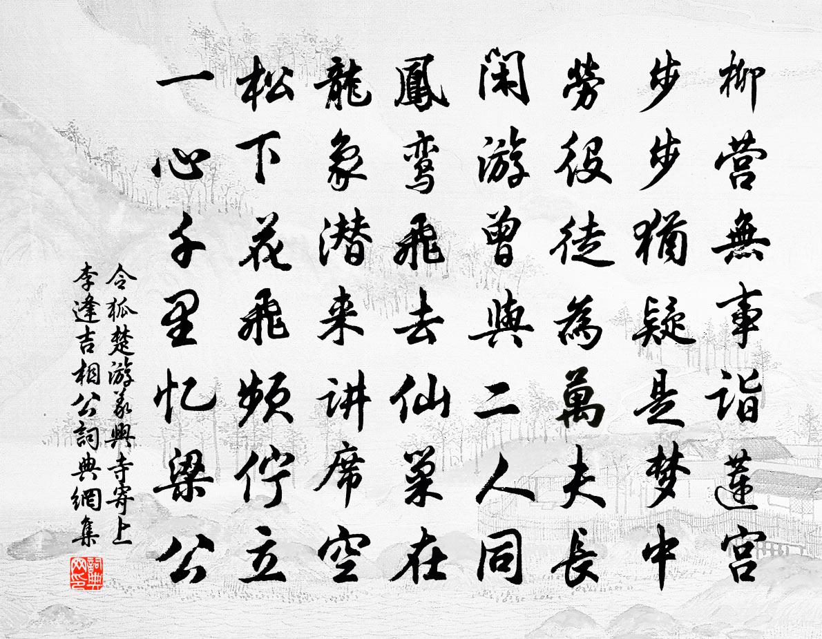 詩詞名句歷史字典書法欣賞書法字典國語詞典說文解字康熙字典古漢語字典標 題 作 者 詩 句 游義興寺寄上李逢吉相公作者:令狐楚 朝代:唐代游義興寺寄上李逢吉相公原文柳營無事詣蓮宮,步步猶疑是夢中。勞役徒為萬夫長,閒遊曾與二人同。鳳鸞飛去仙巢在,龍象潛來講席空。松下花飛頻佇立,一心千里憶梁公。詩詞問答問:游義興寺寄上李逢吉相公的作者是誰?答:令狐楚問:游義興寺寄上李逢吉相公寫於哪個朝代?答:唐代令狐楚游義興寺寄上李逢吉相公書法欣賞游義興寺寄上李逢吉相公書法作品詩詞推薦紀夢連文鳳〔宋代〕薰風一榻臥南窗,無事縈心暑亦涼。半夜忽生鄉土夢,屋前屋後荔枝香。送五六弟赴四明倉官劉克莊〔宋代〕子去為倉氏,人應重客卿。須憐舂簸苦,勿愛釜鍾贏。羊貴脾神厄,葠佳肺氣平。親闈最關念,頻寄雁傳聲。春日偶書寇準〔宋代〕柳岸花塘慵獨賞,閒門春盡阻閒遊。少年多故心先老,卻被人疑似白頭。故趙王屬贈黃門侍郎上官公輓詞二首宋之問〔唐代〕韋門旌舊德,班氏業前書。謫去因丞相,歸來為婕妤。周原烏相冢,越嶺雁隨車。冥漠辭昭代,空憐賦子虛。綠車贈主人孟郊〔唐代〕斗水瀉大海,不如瀉枯池。分明賢達交,豈顧豪華兒。海有不足流,豪有不足資。枯鱗易為水,貧士易為施。幸睹次韻錢舍人病起蘇軾〔宋代〕床下龜寒且耐支,杯中蛇去未應衰。殿門明日逢王傅,櫑具爭先看不疑。坐覺香菸攜袖少,獨愁花影上廊遲。何妨暮春聯句九首許月卿〔宋代〕燮調能十雨,具訓微三風。希聖如顏子,何時笑叔通。明經徒為利,穢史不能公。落落經綸腹,悠悠錦繡胸。茶煙代上張丞相生朝四首張元乾〔宋代〕將相兼文武,謙光接下僚。輿情爭快睹,善頌適生朝。勳業當興宋,謀猷永佐堯。千秋迎壽母,忠孝稱金貂。用前韻贈張正仲朝散二首曹勛〔宋代〕郎官出宰鎮方隅,聊試牛刀意未攄。不特持平爭結友,要知博物有成書。不驚雉羽桑陰靜,一洗蠻煙霽景初。恨識滿江紅(壽東人)范飛〔宋代〕律轉黃鐘,堯蓂尚、零星一葉。人盡道、當年此日,誕生豪傑。我是君家門下士,三年屢獻陽春雪。更此行、騎鶴殘秋感愴齊己〔唐代〕日日加衰病,心心趣寂寥。殘陽起閒望,萬木聳寒條。楚寺新為客,吳江舊看潮。此懷何以寄,風雨暮蕭蕭。憶昔柴隨亨〔宋代〕憶昔長安都會地,草木晴輝鐘王氣。襟帶江湖氣象雄,自是天王興復際。春風樓閣五鳳城,玉漏聲催香霧盈。戶外題袁右丞滋像汪大猷〔宋代〕金玉相輝滿畫扉,高風未許一行題。五朝冠蓋聯朱紫,八代文章煥壁奎。四老德推商皓並,群英名許魯賢齊。憑將烏龍寺呂希純〔宋代〕秀嶺奇峰接釣台,烏龍直馮更崔嵬。萬松合處虛亭敞,千佛光中梵宇開。林外瀑泉飛朔雪,雲間寶藏轉春雷。攀藤至新息寄信州王守孔武仲〔宋代〕熙熙樂國似登台,北圃南亭春事催。惆悵音塵難再會,瑞香應已繞檐開。題人畫扇十首曹勛〔宋代〕慘慘江天散六花,磷磷寒碧不藏砂。扁舟蓑笠撐何去,應向溪頭問酒家。次韻張耒學士病中二首蘇轍〔宋代〕一臥憐君三十朝,呼醫仍苦禁城遙。靈根自遂新陽發,病枿從經野火燒。吻燥未須尋麴櫱,囊空誰與典絺蕉。何時觀荷方岳〔宋代〕蓮有濂溪梅有逋,兩家言句滿江湖。自惟尚與梅花隔,曾識先生太極圖。龍隱岩朱元升〔宋代〕岩根嵐霧深,神龍隱其所。莫恃雲霄近,容易興雲雨。送陳校書赴蔡州幕章孝標〔唐代〕天假縱橫入幕籌,東南頓減一方憂。行齎健筆辭天閣,坐見妖星落蔡州。青草袍襟翻日腳,黃金馬鐙照旄頭。此行名句推薦鄉書不可寄,秋雁又南回。韋莊《章台夜思》 豆蔻連梢煎熟水,莫分茶。李清照《攤破浣溪沙·病起蕭蕭兩鬢華》 八百里分麾下炙,五十弦翻塞外聲。辛棄疾《破陣子·為陳同甫賦壯詞以寄之》 落花有淚因風雨,啼鳥無情自古今。屈大均《壬戌清明作》 白雲依靜渚,春草閉閒門。劉長卿《尋南溪常山道人隱居 / 尋南溪常道士》 柳垂江上影,梅謝雪中枝。晏幾道《臨江仙·身外閒愁空滿》 花開深洞仙門小,路過懸橋羽節輕。劉滄《贈道者》 牆倒眾人推。曹雪芹《紅樓夢·第五十五回》 思親堂上茱初插,憶妹窗前句乍裁。秋瑾《九日感賦》 穗帷飄井幹,樽酒若平生。謝朓《同謝諮議詠銅雀台》