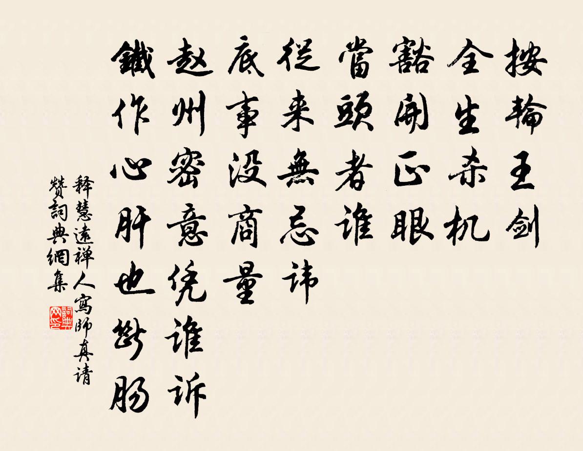 詩詞名句歷史字典書法欣賞書法字典國語詞典說文解字康熙字典古漢語字典標 題 作 者 詩 句 禪人寫師真請贊作者:釋慧遠 朝代:宋代禪人寫師真請贊原文按輪王劍,全生殺機。豁開正眼,當頭者誰。從來無忌諱,底事沒商量。趙州密意憑誰訴,鐵作心肝也斷腸。詩詞問答問:禪人寫師真請贊的作者是誰?答:釋慧遠問:禪人寫師真請贊寫於哪個朝代?答:宋代釋慧遠禪人寫師真請贊書法欣賞禪人寫師真請贊書法作品詩詞推薦慶東宮生辰四首周必大〔宋代〕舊聞西北海,巍然峙瑤山。高辛賢太子,制樂山之間。坐閱幾春秋,不老常朱顏。至今重其潤,恩波浹人寰。四安道中所見牟巘五〔宋代〕狹路傾敧下澗隈,歸牛忽帶夕陽來。狂遮瞪視渾無奈,憑仗誰人拽鼻回。觀闍梨庵高樹梅花盛發一首蘇籀〔宋代〕臞儒花裓戒,疇昔井眉箴。危綠擅丘壑,攢叢薌弁簪。殷勤蒔芳墢,浪莽縱疏森。迥映晴空馥,乘凌陰霰任。狂儔陳。宣帝傷將卒孫元晏〔唐代〕前後兵師戰勝回,百餘城壘盡歸來。當時將卒應知感,況得君王為舉哀。送劉北秀二首楊萬里〔宋代〕劉子過逢二十年,別來風月幾千篇。黃金賣盡延賓友,囊底何須看一錢。生查子王千秋〔宋代〕枝垂雲碧長,心展鵝黃嫩。無力倚闌時,掃盡漫山杏。玲瓏影結陰,蘊藉香成陣。誰為祝東風,更莫催花信。送日本國聘賀使晁巨卿東歸包佶〔唐代〕上才生下國,東海是西鄰。九譯蕃君使,千年聖主臣。野情偏得禮,木性本含真。錦帆乘風轉,金裝照地新。孤城臨江仙(再到桂林)向滈〔宋代〕瘦損東陽綠底事,離愁別恨難禁。夜長誰共擁孤衾。來時青鬢在,今已二毛侵。流水青山依舊是,蘭橈往事空尋。舟中奉懷三館同舍楊萬里〔宋代〕岸樹枝枝瘦,汀蕪節節枯。雲留雪也且,風與屋相呼。一老凍欲死,群仙知也無。更緣詩作祟,病骨轉清臞。別寄一首邵雍〔宋代〕許大秦皇定九州,九州才定卻歸劉。佗人莫謾夸精彩,徒自區區撰白頭。奉和御製冬至夏竦〔宋代〕漢門候景嘉辰啟,魯觀書雲協氣升。玉琯飛灰新節應,璿霄合璧端華凝。陽芸初動猶兼雪,柔荔將芳尚隔冰。繁祉逍遙詠宋太宗〔宋代〕雅澹玄中得,常人故不知。幽深無遠近,道外細推之。碧落神仙境,煙霞日月隨。參詳寰宇內,邪正豈相離。滿江紅佚名〔宋代〕一片閒心,明洞達、天心無曲。身未能輕舉,權作道家梁屋。壺內時看吞日月,世間不羨堆金玉。任自□、虛幻轉建炎丞相成國呂忠穆公退老堂范寅賓〔宋代〕不令甲第起康莊,卻向郊園草作堂。廬阜規模臨嵽嵲,霅溪顏色俯滄浪。參旗井鉞聊遮戶,赤舄貂冠且掛牆。幾淨論語絕句一百首張九成〔宋代〕揚雄苦作艱深語,曹操空嗟幼婦詞。晚悟師言達而已,不須此外更支離。吾郡之望羅彥方過聽以予有詩癖古風特枉傑作曾豐〔宋代〕聲生於氣詩之體,於氣要窮所從起。事制於義詩之理,於義要窮所從止。一元開闢三才矣,萬世綱維十倫爾。我初鄭倅生辰陳棣〔宋代〕柯山插空天為隣,飛仙窟宅無纖塵。降塵孕秀神所相,豈但崧高生甫申。笑別方壺離紫府,道骨清標映華組。二十次韻苗彥先題薛獻可新居四首林季仲〔宋代〕西山拏得落檐前,飛翠侵簾夕更妍。心遠地偏如靖節,江湖處處是斜川。游武夷山陸游〔宋代〕少讀封禪書,始知武夷君;晚乃游斯山,秀傑非昔聞。三十六奇峰,秋晴無纖雲。空岩雞晨號,峭壁丹夜暾。巢居欲卜庵居未有勝地作詩識之陸游〔宋代〕破裘百結鬢垂蓬,旋過流年旋已空。魔眷屬如雲盡散,性光明似日方中。極知萬事不勞問,欲住一庵誰與同?會向名句推薦目斷秋霄落雁,醉來時響空弦。辛棄疾《木蘭花慢·滁州送范倅》 無論習何等業,總不可有粗浮心。王永彬《圍爐夜話·第三五則》 幾硯昔年游,於今成十秋。司馬光《送龔章判官之衛州·新及第》 念月榭攜手,露橋聞笛。周邦彥《蘭陵王·柳》 東風有信無人見,露微意、柳際花邊。蘇軾《一叢花·今年春淺侵年》 窮年憂黎元,嘆息腸內熱。杜甫《自京赴奉先縣詠懷五百字 / 自京赴奉先詠懷五百字》 三月三日天氣新,長安水邊多麗人。杜甫《麗人行》 集韻增廣,多見多聞。佚名《增廣賢文·上集》 逆其根則伐其本,壞其真矣。佚名《黃帝內經·四氣調神大論》 玉可碎而不可改其白,竹可焚而不可毀其節。羅貫中《三國演義·第七十六回》