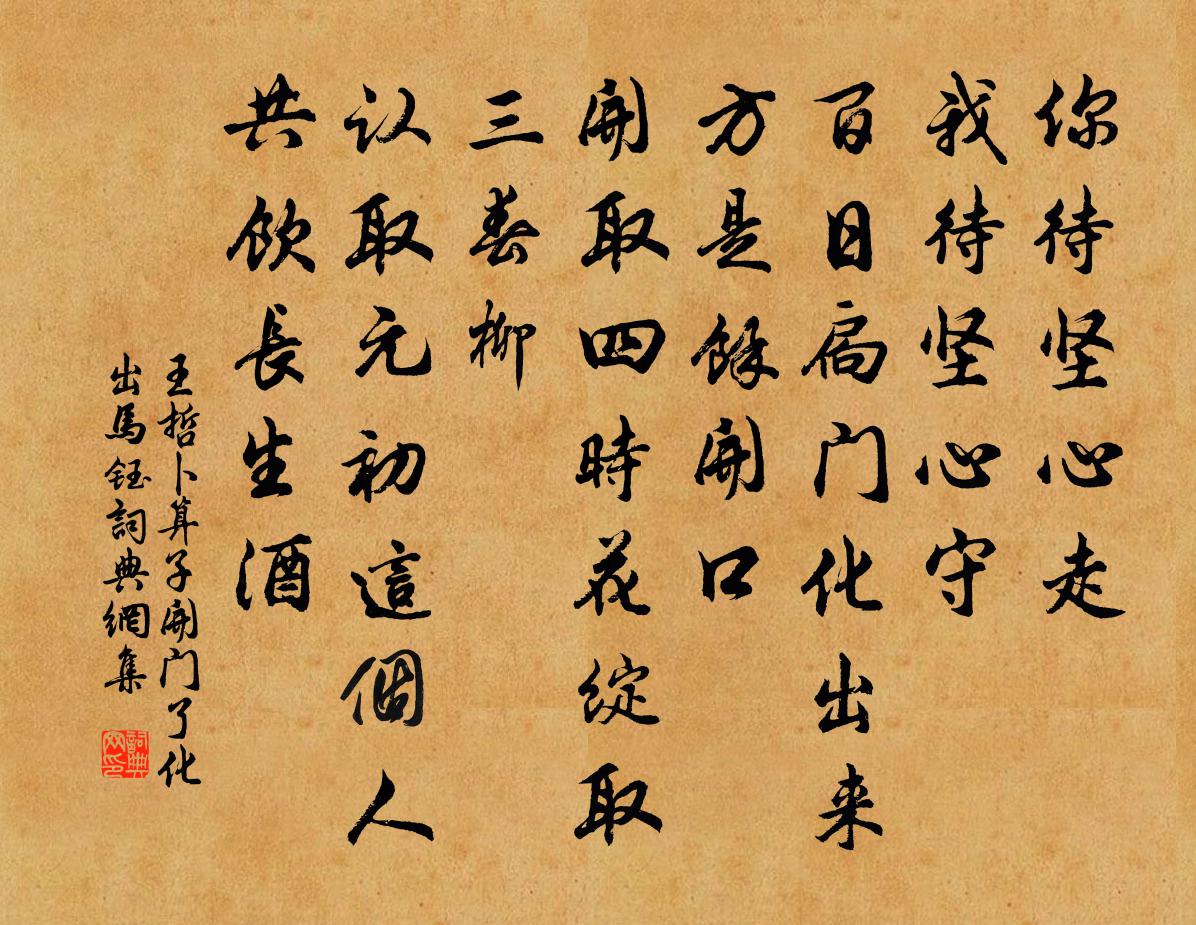 詩詞名句歷史字典書法欣賞書法字典國語詞典說文解字康熙字典古漢語字典標 題 作 者 詩 句 卜運算元 開門了化出馬鈺作者:王哲 朝代:元代卜運算元 開門了化出馬鈺原文你待堅心走。我待堅心守。百日扃門化出來,方是余開口。開取四時花,綻取三春柳。認取元初這個人,共飲長生酒。詩詞問答問:卜運算元 開門了化出馬鈺的作者是誰?答:王哲問:卜運算元 開門了化出馬鈺寫於哪個朝代?答:元代問:卜運算元 開門了化出馬鈺是什麼體裁?答:詞王哲卜運算元 開門了化出馬鈺書法欣賞卜運算元 開門了化出馬鈺書法作品詩詞推薦贈趙神眼姚勉〔宋代〕杜門人事少,排闥相師來。童子忙驅鶴,先生正看梅。煩君滕口說,如我豈身媒。水鏡能司馬,隆中覓異才。大冶縣見梅晁公溯〔宋代〕客里逢春色,江梅發故枝。正應傷老大,似欲慰棲遲。雪樹真相引,風花莫倒吹。南來愧何遜,吾病不難詩。毛詩谷風陳普〔宋代〕從一真心出自然,每於勤苦見貞堅。細看行道遲遲處,足驗民彝得自天。幾年游泳與方舟,一旦同心友作讎。苦是虞美人王灼〔宋代〕別來楊柳團輕絮。擺撼春風去。小園桃李卻依依。猶自留花不發、待郎歸。枝頭便覺層層好。信是花相惱。觥船一出行湖山間雜賦陸游〔宋代〕新釀學鵝黃,幽花作蜜香。客邀閒即去,病起醉何傷?野寺無晨粥,村伶有夜場。吾心靜如水,隨事答年光。騎馬張煒〔宋代〕陌上騎驄馬,朱纓耀日丹。袖欺鞭竹瘦,靴入{左革右登}金寒。毳帽兜貂鼠,茸裘織雁團。戎裝吾亦可,初不礙感遇之十九陳子昂〔唐代〕聖人不利己。憂濟在元元。黃屋非堯意。瑤台安可論。吾聞西方化。清淨道彌敦。奈何窮金玉。雕刻以為尊。雲構又和晦翁棹歌方岳〔宋代〕桃花認得捕魚船,醉著歸來月滿川。山鬼已磨蒼玉碧,要留名字與風煙。諸暨道中遇雪鄭剛中〔宋代〕亂花催臘舞江乾,村酒沽來豈問酸。仟女雲間休剪水,孤松嶺上不知寒。自詠馮楫〔宋代〕公事之餘喜坐禪,少曾將脅到床眠。雖然現出宰官相,長老之名四海傳。徐僊書三首陳師道〔宋代〕蓬壺仙子補天手,筆妙詩清萬世功。肯學黃家元佑腳,信知人厄匪天窮。野步書觸目陸游〔宋代〕村落初過雨,園林殊未霜。幽花雜紅碧,野橘半青黃。飛鷺橫秋浦,啼鴉滿夕陽。最憐山腳水,撩亂入陂塘。頌古十九首釋慧暉〔宋代〕那吒太子本來身,卓卓無依不受塵。雲散水流天地靜,籬間 * 正爭春。水淺舟滯解悶十絕鄭獬〔宋代〕春水駸駸抹舊痕,兒童乘浪戲青雲。去如跳鯉忽驚散,來似游鳧還作群。途中回寄閭丘秀才林逋〔宋代〕極目半秋色,此情聊慘悽。行人古道上,落日破村西。劍飲無高會,驢游困解攜。祇因風與月,吾子有新題。觀慶雲圖李程〔唐代〕五雲從表瑞,藻繪宛成圖。柯葉何時改,丹青此不渝。非煙色尚麗,似蓋狀應殊。渥彩看猶在,輕陰望已無。方將詠黃石公葛慶龍〔宋代〕挾書律重火猶光,天下岩搜不敢藏。圯上老人無見者,一編親寫授張良。普向山門王月窗〔宋代〕來訪山中景,亭闌鼠甘陰。客投孤寺宿,蟬趁夕陽晴。滿樹青苔濕,一村黃葉深。納涼歸去晚,湖月掛遙林。李工部輓歌三首張說〔唐代〕錦帳為郎日,金門待詔時。楊宮先上賦,柏殿幾連詩。瞬息琴歌斷,淒涼簫挽悲。那堪霸陵岸,回首望京師。宅兆杜大卿滸第一百三十二文天祥〔宋代〕昔沒賊中時,中夜問道歸。辛苦救衰朽,微爾人盡非。名句推薦枕簟溪堂冷欲秋。斷雲依水晚來收。辛棄疾《鷓鴣天·鵝湖歸病起作》 出於其類,拔乎其萃。孟子《孟子·公孫丑章句上·第二節》 師嚴然後道尊,道尊然後民知敬學。戴聖《禮記·學記》 客愁全為減,舍此復何之?杜甫《後游》 為有犧牲多壯志,敢叫日月換新天。 * 《七律·到韶山》 四時有不謝之花,八節有長青之草。李汝珍《鏡花緣·第一回》 而今識盡愁滋味,欲說還休。辛棄疾《醜奴兒·書博山道中壁》 丈夫志四海,萬里猶比鄰。曹植《贈白馬王彪·並序》 君子素其位而行,不願乎其外。子思《中庸·第十四章》 我今因病魂顛倒,唯夢閒人不夢君。元稹《酬樂天頻夢微之》