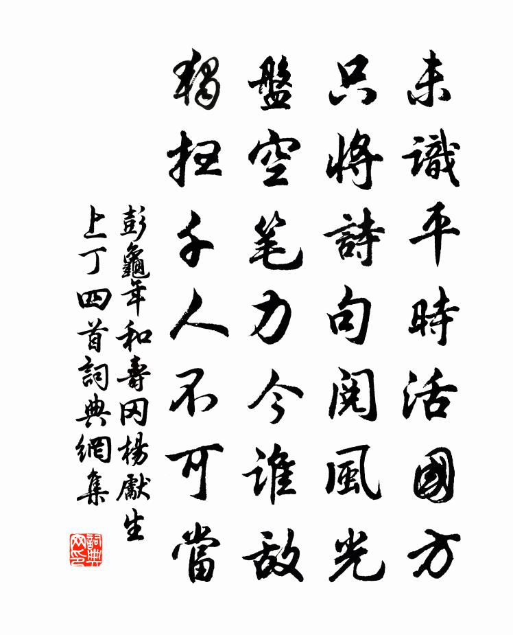 詩詞名句歷史字典書法欣賞書法字典國語詞典說文解字康熙字典古漢語字典標 題 作 者 詩 句 和壽岡楊先生上丁四首作者:彭龜年 朝代:宋代和壽岡楊先生上丁四首原文未識平時活國方,只將詩句閱風光。盤空筆力今誰敵,獨掃千人不可當。詩詞問答問:和壽岡楊先生上丁四首的作者是誰?答:彭龜年問:和壽岡楊先生上丁四首寫於哪個朝代?答:宋代彭龜年和壽岡楊先生上丁四首書法欣賞和壽岡楊先生上丁四首書法作品詩詞推薦惜花張籍〔唐代〕春潭足芳樹,水清不如素。幽人愛華景,一一空山暮。月出潭氣白,游魚暗沖石。夜深春思多,酒醒山寂寂。二十一弟壽二首項安世〔宋代〕歡兄齷齪身全老,喜弟生獰臉正童。色要如童長不改,學須似老始多功。遁翁賜詩不已複次韻二首方回〔宋代〕極知旅瑣酒難賒,亦欠魚如丙穴嘉。稍向市工求舊硯,更從山戶覓新茶。芙蓉欲度崔嵬嶺,芍藥猶余爛漫花。但恐惠文伯居士請贊釋崇岳〔宋代〕不著佛求,不著法求。人天眼目,佛祖冤讎。香岩下指南作北,劍池上看樓打樓。機輪妙轉一絲頭,不得鯢鯨不肯課伐木林尚仁〔宋代〕手揮樵斧氣如虹,幾樹寒煙一餉空。午夜無依烏鵲冷,數聲應恨月明中。喜康將軍見訪劉禹錫〔唐代〕謫居愁寂似幽棲,百草當門茅舍低。夜獵將軍忽相訪,鷓鴣驚起繞籬啼。沁園春佚名〔宋代〕不喜輕裘,布衣芒履,任春與秋。傍人笑我生涯拙,塵寰碌碌,畢竟何求。物外蓬瀛,壺中方寸,論此宗風沒價酬相和歌辭子夜春歌王翰〔唐代〕第二十一卷春氣滿林香,春遊不可忘。落花吹欲盡,垂柳折還長。桑女淮南曲,金鞍塞北裝。行行小垂手,日暮渭賦京口蘇園陳藻〔宋代〕揚子江邊犬吠村,蘇公宅畔蝶遊園。淪波對景標層塔,野市逃喧植外樊。亭榭高低隨卉木,門庭光彩屬兒孫。本朝孺人陳氏輓詞樓鑰〔宋代〕追憶宮端舊典刑,三貞況復是難兄。豈惟門戶生光彩,直使朝廷列姓名。煙海乘桴誰可奪,天風反火報尤明。雖雲四明十題其十師子岩梅堯臣〔宋代〕岩形若狻猊,不能千里走。豈無鳥獸群,當假風雷吼。寄謝棲息人,想像真妄有。宮詞十首張樞〔宋代〕紫閣深嚴邃殿西,書林飛白揭宸奎。黃封繳進昇平奏,直筆夫人看內批。次韻趙制置制勝軒詩魏了翁〔宋代〕何年誤認貙作熊,力小知薄當戎沖。級夷蕃拔牖戶破,至今風色長如冬。去年推轂以授公,腳踏車飛度雙劍峰。風棱寄陳彥邦二首吳芾〔宋代〕自古中興用實才,正資賢哲共圖回。若為清禁挽不住,亦效衰翁歸去來。幸有江水供笑傲,更邀風月與徘徊。得閒酬李侍御書記秋夕雨中病假見寄孟郊〔唐代〕秋風繞衰柳,遠客聞雨聲。重茲阻良夕,孤坐唯積誠。果枉移疾詠,中含嘉慮明。洗滌煩濁盡,視聽昭曠生。未覺和劉後村梅花百詠方蒙仲〔宋代〕忍寒寧死餓寧僵,不去偷它賈女香。感嘆懷鉛成底事,辛勤餐玉竟無方。掃花游/掃地游趙文〔宋代〕結廬勝境,似舊日曾游,玉蓮佳處。萬花織組。愛迴廊宛轉,楚腰束素。度密穿青,上有燕支萬樹。探梅去。正竹道中病瘍久不飲酒至魚梁小酌因賦長句陸游〔宋代〕我行蒲城道,小疾屏杯酌。癬疥何足言,亦復妨作樂。此身會當壞,百歲均電雹。胡為過自惜,憊臥困鍼烙?未嘗題玉岩李傅〔宋代〕雨餘山色一番新,物態民情若遇春。正好憑高飄逸興,便教避世出紅塵。再登雲外通天路,就見岩中慕道人。俯仰三月二十九日還家花事已過獨碧桃盛開黎廷瑞〔宋代〕出門紅未芳,還家綠成幄。仙葩獨婉娩,書聲共寥落。日暮碧雲合,天寒翠袖薄。念遠悵悠悠,緱山緲孤鶴。名句推薦何事非相思,江上葳蕤竹。吳均《登二妃廟》 已從招提游,更宿招提境杜甫《游龍門奉先寺》 君子無入而不自得焉。子思《中庸·第十四章》 枝上流鶯和淚聞,新啼痕間舊啼痕。秦觀《鷓鴣天·枝上流鶯和淚聞》 如何同枝葉,各自有枯榮李白《樹中草》 盈盈一點芳心,占多少春光,問卿知否?紅妝莫斗顧太清《玉燭新·白海棠》 相逢喚醒京華夢,吳塵暗斑吟發。詹玉《齊天樂·送童瓮天兵後歸杭》 杖劍對尊酒,恥為遊子顏。陸龜蒙《別離》 相逢意氣為君飲,系馬高樓垂柳邊。王維《少年行四首》 在家不會迎賓客,出門方知少主人。佚名《增廣賢文·上集》