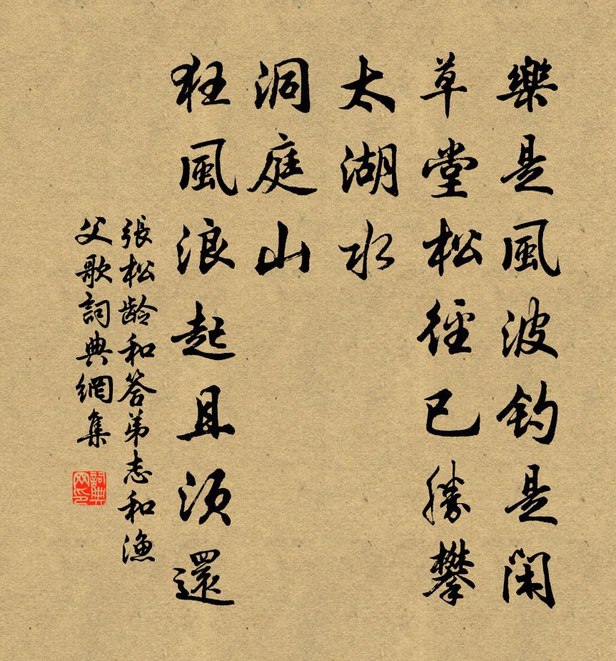 詩詞名句歷史字典書法欣賞書法字典國語詞典說文解字康熙字典古漢語字典標 題 作 者 詩 句 和答弟志和漁父歌作者:張松齡 朝代:唐代和答弟志和漁父歌原文樂是風波釣是閒,草堂松徑已勝攀。太湖水,洞庭山,狂風浪起且須還。詩詞問答問:和答弟志和漁父歌的作者是誰?答:張松齡問:和答弟志和漁父歌寫於哪個朝代?答:唐代問:和答弟志和漁父歌是什麼體裁?答:樂府張松齡和答弟志和漁父歌書法欣賞和答弟志和漁父歌書法作品注釋全唐詩:卷308-6詩詞推薦壽高內翰汪莘〔宋代〕璞玉渾金表裹同,心知言動有陰功。一門人傑成龍種,三世科名各繼宮。華蓋共瞻天座北,勾陳長扈帝垣中。野人送韓子華十月拜掃梅堯臣〔宋代〕白露已變霜,孝心竟悲惻。薦衣如念存,拜壠不遑息。帶劍蓬池外,兼程困馬力。禮畢便當還,於誠乃為得。歲暮病懷贈夢得 時與夢得同患足疾。白居易〔唐代〕十年四海故交親,零落唯殘兩病身。共遣數奇從是命,同教步蹇有何因?眼隨老減嫌長夜,體待陽舒望早春。新樂春日書懷朱淑真〔宋代〕從宦東西不自由,親幃千里淚長流。已無鴻雁傳家信,更被杜鵑追客愁。月落鳥歌空美景,花光柳影漫盈眸;高樓贈李道士蘇軾〔宋代〕世人只數曹將軍,誰知虎頭非痴人。腰間大羽何足道,頰上三毛自有神。平生狎侮諸公子,戲著幼輿岩石里。故教次韻金陵趙民曹水閣即事張榘〔宋代〕尚想溪亭跨鴨頭,市囂到曉不曾休。角聲吹斷老梅月,橋影壓翻寒葦秋。三語固知非昔比,十年不到使人愁。老來壽朴翁姜夔〔宋代〕與師同月不同年,歸墨歸儒各自緣。想得山中無壽酒,但攜茶到菊花前。官亭夕坐戲簡顏十少府杜甫〔唐代〕南國調寒杵,西江浸日車。客愁連蟋蟀,亭古帶蒹葭。不返青絲鞚,虛燒夜燭花。老翁須地主,細細酌流霞。玉抱肚佚名〔宋代〕若論玄妙,聽周風一訣。把嬰兒奼女,木金間隔。從頭分別。先擒六賊三屍滅。後捉玉兔飲鳥烏血。仗劍鋒,麾魔初秋大熱孔武仲〔宋代〕金神整霜仗,昨日從西回。謂當有爽氣,吹盪滄溟開。誰知祝融軍,執熱{走中加參}{走中加覃}來。六龍駐長無客回天意邵雍〔宋代〕無客回於意,有人資盜糧。日中屢見斗,六月時降霜。有書不暇讀,有食不暇嘗。食況不盈缶,書空堆滿床。嚴陵灘羅隱〔唐代〕中都九鼎勤英髦,漁釣牛蓑且遁逃。世祖升遐夫子死,原陵不及釣台高。頌古四十八首釋慧開〔宋代〕西來直指,事因囑起。找聒叢林,元來是你。經過合寨吊孟氏故居二首王之道〔宋代〕行過春泥沒馬深,幾聲幽鳥囀喬林。感時恨別愁無那,賴有清樽慰此心。戲和答禽語黃庭堅〔宋代〕南村北村雨一犁,新婦餉姑翁哺兒。田中啼鳥自四時,催人脫袴著新衣。著新替舊亦不惡,去年租重無袴著。使風船梅堯臣〔宋代〕清淮直上水連天,坐看高帆後復前。自是乘風有遲速,不由人力愛爭先。秋風謠張耒〔宋代〕秋風起,秋雲高。連山草木如波濤,大江盪潏魚龍逃。羲和奔忙日車逸,八柱傾側恐不牢。柯山老人揜蓬茅,畏寒張守唱和紅字韻詩八首劉子翬〔宋代〕午枕回清夢,疏林逗遠風。茶甌烹葉白,果飣剝方紅。小壘常稀訟,鄰邦近息戎。民謠知善政,佽助亦何功。寄韓卷院南澗常伯之子姜特立〔宋代〕每思南澗一悽然,不見風騷二十年。子厚猶能記先友,審言且喜有家傳。蜩螗聲亂無遺響,山水人亡有絕弦。海內送臨川王丞秩滿造朝趙汝鐩〔宋代〕我來學制君喔松,數月握手臭味同。君今南浦我送客,水萍風云何匆匆。別酒未釂白玉斝,椎鼓催發斜陽紅。青霄名句推薦入苑白泱泱,宮人正靨黃。李賀《同沈駙馬賦得御溝水》 君子反道以修德;正德以出樂;和樂以成順。呂不韋《呂氏春秋·紀·季夏紀》 奇文共欣賞,疑義相與析。陶淵明《移居二首》 少室眾峰幾峰別,一峰晴見一峰雪。李頎《少室雪晴送王寧》 擊楫中流,曾記淚沾裳李好古《江城子·平沙淺草接天長》 孝子之事親也,居則致其敬,養則致其樂,病則致其憂,喪則致其 哀,祭則致其嚴。孔子及其弟子《孝經·紀孝行》 君子之心事,天青日白,不可使人不知洪應明《菜根譚·概論》 青冥浩蕩不見底,日月照耀金銀台。李白《夢遊天姥吟留別 / 別東魯諸公》 此生只是償詩債,白菊開時最不眠。司空圖《白菊雜書四首》 帳底吹笙香吐麝,更無一點塵隨馬。蘇軾《蝶戀花·密州上元》