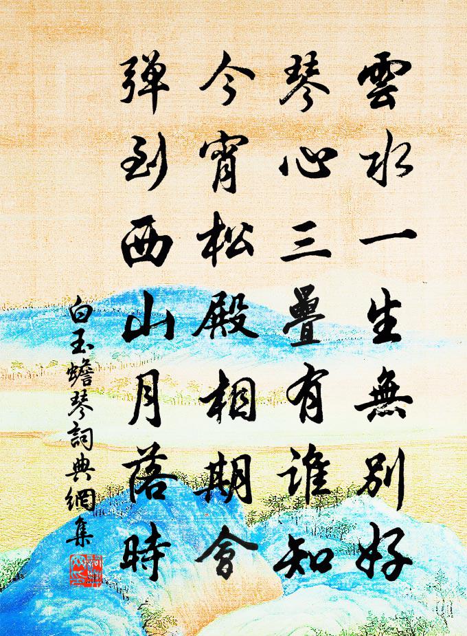 詩詞名句歷史字典書法欣賞書法字典國語詞典說文解字康熙字典古漢語字典標 題 作 者 詩 句 琴作者:白玉蟾 朝代:宋代琴原文雲水一生無別好,琴心三疊有誰知。今宵松殿相期會,彈到西山月落時。詩詞問答問:琴的作者是誰?答:白玉蟾問:琴寫於哪個朝代?答:宋代問:琴是什麼體裁?答:七絕白玉蟾琴書法欣賞琴書法作品詩詞推薦烏目山五題龍院李堪〔宋代〕林下金仙地,苔門揜夕陽。花飛殿塔頂,地照雲霞光。松老鶴仍在,洞閒龍已翔。中宵動清眾,清磬發虛堂。荔枝香近/荔枝香陳允平〔宋代〕臉霞香銷粉薄,淚偷泫。靉靉金獸,瀋水微薰,人簾綠樹春陰,糝徑紅英風卷。芳草怨碧,王孫漸遠。錦屏夢回,句邵伯溫〔宋代〕千載登真謝自然,半山遺蹟號金泉。春夜次韻答肯堂兄鄧深〔宋代〕天賦疏慵性,身將四十年。逢歡開口笑,遇醉倒頭眠。世事多翻覆,時光易變遷。置之無足校,五字要清圓。題上饒半月岩四絕胡寅〔宋代〕每見雲端上下弦,遙憐破鏡兩娟娟。原移此景蟾宮去,日月當令一再圓。君山孫應威〔宋代〕君山盤結青雲梯,堂高更覺天象低。橫江萬頃瑩玻璃,蓬瀛勝概從端倪。幾欲收拾歸品題,分甘獨令倦攀躋。使君宿甘露寺僧舍曾公亮〔宋代〕枕中雲氣千峰近,床底松聲萬壑哀。要看銀山拍天浪,開窗放入大江來。題捫參閣張唐民〔宋代〕訟簡民淳羨小州,兩衙才退似歸休。一懷山果三勝酒。暮掩青峰即下樓。獨秀峰陳岩〔宋代〕一山夐出眾山中,日照煙浮紫翠濃。山不爭高人共仰,幾多丘垤儼相從。遊子杜甫〔唐代〕巴蜀愁誰語,吳門興杳然。九江春草外,三峽暮帆前。厭就成都卜,休為吏部眠。蓬萊如可到,衰白問群仙。送孫潁賢曾鞏〔宋代〕穰穰秦州鐵馬群,青衫吾子仕猶屯。高談消長才驚世,藐視公侯行出人。古氣欲遵奔日月,畏塗曾觸滯荊榛。明夷次蘭皋吳堂長曉起楊公遠〔宋代〕曉起披衣不奈寒,搔頭自愧轉疎頑。吟情冷淡梅花外,畫思微茫煙雨間。有興何妨終日醉,無求贏得此生閒。要知楠樹為風雨所拔嘆杜甫〔唐代〕倚江楠樹草堂前,故老相傳二百年。誅茅卜居總為此,五月仿佛聞寒蟬。東南飄風動地至,江翻石走流雲氣。乾排謝龍山惠柱杖並求石銚四首馬廷鸞〔宋代〕磚爐石銚竹方床,何必銀瓶為瀉湯。苦茗只堪澆菜肚,春風卻負太官羊。檄李嶠〔唐代〕羽檄本宣明,由來□木聲。聯翩至漢國,迢遞入燕營。毛義持書去,張儀韞璧行。曹風雖覺愈,陳草始知名。悟仙庵李石〔宋代〕擔頭活計任推移,前世生身後世知。瀝血山中留語句,至今橛上系驢兒。和范景仁王景彝殿中雜題三十八首並次韻其六梅堯臣〔宋代〕森森漢宮竹,托本異孤生。玉砌緣根迸,朱欄與筍平。朝煙生密習,晚影漏斜明。應待女媧采,參差鳳琯清。西園席上記事駱適正〔宋代〕花隨春盡覓無痕,尚續餘歡索侑尊。一曲未終人已去,西園燈火欲黃昏。戲詠江南土風黃庭堅〔宋代〕十月江南未得霜,高林殘水下寒塘。飯香獵戶分熊白,酒熟漁家擘蟹黃。橘摘金苞隨驛使,禾舂玉粒送官倉。踏歌岳陽即事張喬〔唐代〕遠色岳陽樓,湘帆數片愁。竹風山上路,沙月水中洲。力學桑田廢,思歸鬢髮秋。功名如不立,豈易狎汀鷗。名句推薦君子所,其無逸佚名《尚書·周書·無逸》 魯酒不可醉,齊歌空復情。李白《沙丘城下寄杜甫》 勢有不可得,事有不可成。韓非及後人《韓非子·觀行》 寶馬雕車香滿路。辛棄疾《青玉案·元夕》 近來攀折苦,應為別離多王之渙《送別》 人之情多矯,世之俗多偽,豈可信乎?來俊臣《羅織經·閱人卷第一》 自知者不怨人,知命者不怨天。荀子《荀子·榮辱》 承恩不在貌,教妾若為容。杜荀鶴《 * 怨》 貧士之腸習黎莧,富人之口厭膏梁。程登吉《幼學瓊林·卷三·貧富》 落魄江南載酒行,楚腰纖細掌中輕。杜牧《遣懷》