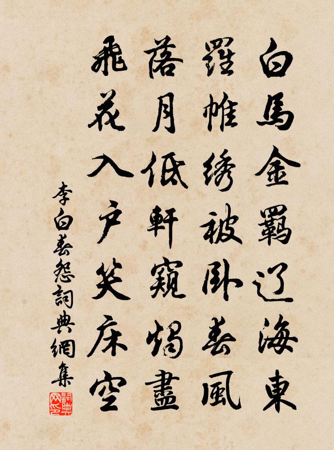 詩詞名句歷史字典書法欣賞書法字典國語詞典說文解字康熙字典古漢語字典標 題 作 者 詩 句 春怨作者:李白 朝代:唐代春怨原文白馬金羈遼海東,羅帷繡被臥春風。落月低軒窺燭盡,飛花入戶笑床空。詩詞問答問:春怨的作者是誰?答:李白問:春怨寫於哪個朝代?答:唐代問:春怨是什麼體裁?答:樂府問:李白的名句有哪些?答:李白名句大全李白春怨書法欣賞春怨書法作品注釋那呆子騎著白色駿馬,黃金羈馬頭,賓士在遼東半島。我這裡繡帳錦被,只有春風陪伴。月下西山,月光透過窗戶 * ,只見蠟燭燃盡,人還未入睡。落花乘春風飛入室內,也笑:怎么只有一個人!標籤:閨怨,春天,婦女,思念詩詞推薦君難托王安石〔宋代〕槿花朝開暮還墜,妾身與花寧獨異。憶昔相逢俱少年,兩情未許誰最先。感君綢繆逐君去,成君家計良辛苦。人事羈春王勃〔唐代〕客心千里倦,春事一朝歸。還傷北園裡,重見落花飛。憶江南李煜〔五代〕多少恨,昨夜夢魂中。還似舊時游上苑,車如流水馬如龍。花月正春風。多少淚,沾袖復橫頤。心事莫將和淚滴,青陽佚名〔兩漢〕青陽開動,根荄以遂,膏潤並愛,跂行畢逮。霆聲發榮,處頃聽,枯槁復產,乃成厥命。眾庶熙熙,施及夭胎,群浪淘沙·簾外五更風李清照〔宋代〕簾外五更風,吹夢無蹤。畫樓重上與誰同?記得玉釵斜撥火,寶篆成空。回首紫金峰,雨潤煙濃。一江春浪醉醒中寄揚州韓綽判官杜牧〔唐代〕青山隱隱水迢迢,秋盡江南草未凋。二十四橋明月夜,玉人何處教 * 。晝夜樂·冬趙顯宏〔元代〕風送梅花過小橋,飄飄。飄飄地亂舞瓊瑤,水面上流將去了。覷絕似落英無消耗,似那人水遠山遙,怎不焦?今日城東早春楊巨源〔唐代〕詩家清景在新春,綠柳才黃半未勻。若待上林花似錦,出門俱是看花人。醉桃源/阮郎歸嚴仁〔宋代〕拍堤春水蘸垂楊。水流花片香。弄花喈柳小鴛鴦。一雙隨一雙。簾半卷,露新妝。春衫是柳黃。倚闌看處背斜陽。定風波·暖日閒窗映碧紗歐陽炯〔唐代〕暖日閒窗映碧紗,小池春水浸晴霞。數樹海棠紅欲盡,爭忍,玉閨深掩過年華。獨憑繡床方寸亂,腸斷,淚珠穿破贈夫二首 / 題雲泉台客韋璜韋璜〔唐代〕不得長相守,青春夭蕣華。舊遊今永已,泉路卻為家。早知離別切人心,悔作從來恩愛深。黃泉冥寞雖長逝,白日應天長·一鉤初月臨妝鏡李璟〔唐代〕一鉤初月臨妝鏡,蟬鬢鳳釵慵不整。重簾靜,層樓迥,惆悵落花風不定。柳堤芳草徑,夢斷轆轤金井。昨夜更闌酒燕歸梁·織錦裁篇寫意柳永〔宋代〕織錦裁編寫意深。字值千金。一回披玩一愁吟。腸成結、淚盈襟。幽歡已散前期遠,無憀賴、是而今。密憑歸雁寄遐方怨·憑繡檻溫庭筠〔唐代〕憑繡檻,解羅幃。未得君書,斷腸瀟湘春雁飛。不知征馬幾時歸,海棠花謝也,雨霏霏。思歸韋莊〔唐代〕暖絲無力自悠揚,牽引東風斷客腸。外地見花終寂寞,異鄉聞樂更淒涼。紅垂野岸櫻還熟,綠染回汀草又芳。舊里送郄昂謫巴中李白〔唐代〕瑤草寒不死,移植滄江濱。東風灑雨露,會入天地春。予若洞庭葉,隨波送逐臣。思歸未可得,書此謝情人。高陽台(豐樂樓分韻得如字)吳文英〔宋代〕修竹凝妝,垂楊駐馬,憑闌淺畫成圖。山色誰題,樓前有雁斜書。東風緊送斜陽下,弄舊寒、晚酒醒餘。自銷凝,春中喜王九相尋(一題作晚春)孟浩然〔唐代〕二月湖水清,家家春鳥鳴。林花掃更落,徑草踏還生。酒伴來相命,開尊共解酲。當杯已入手,歌妓莫停聲。蝶戀花歐陽修〔宋代〕嘗愛西湖春色早。臘雪方銷,已見桃開小。頃刻光陰都過了。如今綠暗紅英少。且趁餘花謀一笑。況有笙歌,艷態明月上高樓曹植〔魏晉〕明月照高樓,流光正徘徊。上有愁思婦,悲嘆有餘哀。借問嘆者誰?雲是宕子妻。君行逾十年,孤妾常獨棲。君若名句推薦對茲佳品酬佳節,桂拂清風菊帶霜。曹雪芹《螃蟹詠》 年時俯仰過,功名宜速崇。張華《壯士篇》 獨自莫憑欄,無限江山,別時容易見時難。李煜《浪淘沙令·簾外雨潺潺》 望章台路杳,金鞍遊蕩,有盈盈淚。章楶《水龍吟·燕忙鶯懶芳殘》 青冥浩蕩不見底,日月照耀金銀台。李白《夢遊天姥吟留別 / 別東魯諸公》 一事真,百事真。馮夢龍《醒世恆言·卷十六》 罔談彼短,靡恃己長。周興嗣《千字文·全文》 自知者不怨人,知命者不怨天;怨人者窮,怨天者無志。荀子《荀子·榮辱》 夫君子之行,靜以修身,儉以養德。諸葛亮《誡子書》 不覺新涼似水,相思兩鬢如霜。劉辰翁《西江月·新秋寫興》