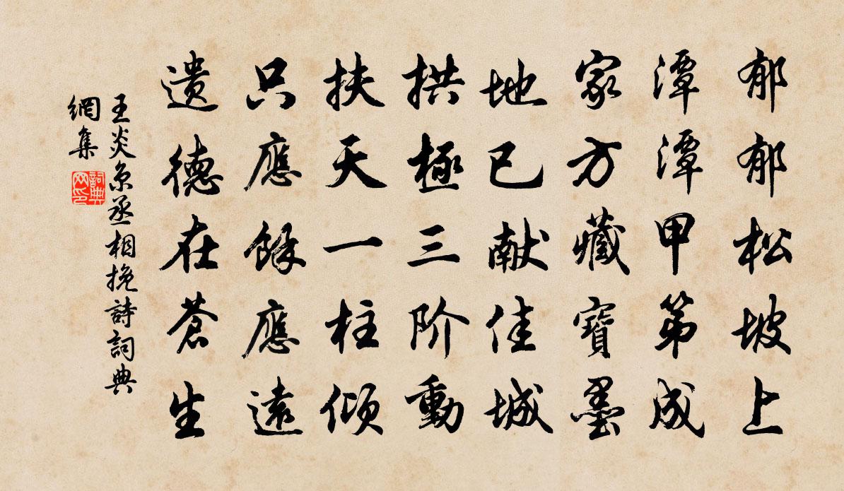 詩詞名句歷史字典書法欣賞書法字典國語詞典說文解字康熙字典古漢語字典標 題 作 者 詩 句 京丞相輓詩作者:王炎 朝代:宋代京丞相輓詩原文鬱郁松坡上,潭潭甲第成。家方藏寶墨,地已獻佳城。拱極三階動,扶天一柱傾。只應余應遠,遺德在蒼生。詩詞問答問:京丞相輓詩的作者是誰?答:王炎問:京丞相輓詩寫於哪個朝代?答:宋代王炎京丞相輓詩書法欣賞京丞相輓詩書法作品詩詞推薦【雙調】折桂令_詠西域吉誠鍾嗣成〔元代〕詠西域吉誠甫是梨園一點文星,西土儲英,中夏揚名。胸次天誠,口角河傾,席上風生。吞學海波瀾萬頃,戰詞壇端午周承勛〔宋代〕誰家解崇吐千瓶,丹墨交輝走百靈。盡使跬蛇歸藥籠,又纏蕭艾作人形。安得彩絲十萬丈,東南西北系飄零。滿庭芳 贈福昌縣趙殿試譚處端〔元代〕儒業尊高,文章顯貴,算來世路榮奢。苦心勞志,求望步雲霞。假使登科攀桂,黃粱夢、空悟咨嗟。無常到,相如金剛隨機無盡頌不受不貪分第二十八釋印肅〔宋代〕片月下伊川,豈是別人源。若還識得水,性海量無邊。壽張亨泉提刑三首吳泳〔宋代〕末學紛紛競為人,公能康濟自家身。形軀元備人間世,肝肺盡收天下春。觀我自應知愛重,識心須會起經綸。壽觥趙表之送梅並詩次韻四首張嵲〔宋代〕不著名身與句身,迥然超過亦無真。誰知終日騰騰者,便是當來本分人。庭梅詠張九齡〔唐代〕芳意何能早,孤榮亦自危。更憐花蒂弱,不受歲寒移。朝雪那相妒,陰風已屢吹。馨香雖尚爾,飄蕩復誰知。劉陽卜氏耕樂堂趙文〔宋代〕君當學君家君子儒,西河之上可以老,諸侯端拜為師模。君莫學君家老中郎,河南田畜豈不好,上林要牧天子羊。次韻石林見貽絕句四首韓元吉〔宋代〕先生德業萬人雄,尋尺猶收爨下桐。乞與朱弦弄流水,坐聽岩壑起松風。觀冬設上東川楊尚書賈島〔唐代〕匏革奏冬非獨樂,軍城未曉啟重門。何時卻入三台貴,此日空知八座尊。羅綺舞中收雨點,貔貅閫外捲雲根。逐遷金剛隨機無盡頌結實分主釋印肅〔宋代〕心傳靜夜鍾,意在九霄中。佇聽鐘聲響,為人萬劫窮。殘句:惟有南宮竇員外王禹偁〔宋代〕惟有南宮竇員外,為予垂淚閤門前。半夜韓偓〔唐代〕板閤數尊后,至今猶酒悲。一宵相見事,半夜獨眠時。明朝窗下照,應有鬢如絲。【商調】百字知秋令王和卿〔元代〕絳蠟殘半明不滅寒灰看時看節落,沉煙燼細里末里微分間即里漸里消。碧紗窗外風弄雨昔留昔零打芭蕉,惱碎芳心挽鄭禹功曾幾〔宋代〕山海淮壖利,吾徒職駿奔。長官惟我在,同事只公存。句法深深見,心宗細細論。清風今已矣,微月耿黃昏。春雪二首張耒〔宋代〕春雲驕不行,凍雨作飛雪。夜深歸無燭,已覺馬蹄滑。那知事未已,通夕注不歇。堂寒曉附火,檐滴更清絕。前者送佛照光老赴徑山陸游〔宋代〕大覺住育王,拗折拄杖強到底;佛照住育王,挑得缽囊隨詔起。從來宗門話,只要句不死。說同說異庵外人,若是太息陸游〔宋代〕書生忠義與誰論?骨朽猶應此念存。砥柱河流僊掌日,死前恨不見中原。太平寺泉眼杜甫〔唐代〕招提憑高岡,疏散連草莽。出泉枯柳根,汲引歲月古。石間見海眼,天畔縈水府。廣深丈尺間,宴息敢輕侮。青白人月圓劉因〔元代〕茫茫大塊洪爐里,何物不寒灰。古今多少,荒煙廢壘,老樹遺台。太行如礪,黃河如帶,等是塵埃。不須更嘆,花名句推薦我欲穿花尋路,直入白雲深處,浩氣展虹霓。黃庭堅《水調歌頭·遊覽》 秋草獨尋人去後,寒林空見日斜時。劉長卿《長沙過賈誼宅》 嗚呼!楚雖三戶能亡秦,豈有堂堂中國空無人!陸游《金錯刀行》 本富為上,末富次之,奸富最下。司馬遷《史記·七十列傳·貨殖列傳》 夜來雨橫與風狂,斷送西園滿地香。阿魯威《湘妃怨·夜來雨橫與風狂》 恨蕭蕭、無情風雨,夜來揉損瓊肌。李清照《多麗·詠白菊》 好問則裕,自用則小。佚名《尚書正義·卷八·仲虺之誥》 學然後知不足,教然後知困。戴聖《禮記·學記》 孤山寺北賈亭西,水面初平雲腳低。白居易《錢塘湖春行》 天不老,情難絕。張先《千秋歲·數聲鶗鴂》