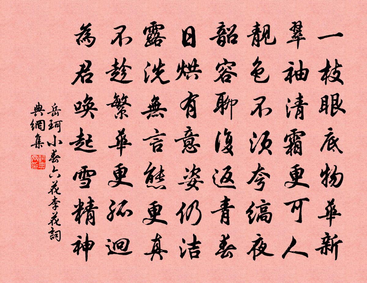 詩詞名句歷史字典書法欣賞書法字典國語詞典說文解字康熙字典古漢語字典標 題 作 者 詩 句 小春六花李花作者:岳珂 朝代:宋代小春六花李花原文一枝眼底物華新,翠袖清霜更可人。靚色不須夸縞夜,韶容聊復返青春。日烘有意姿仍潔,露洗無言態更真。不趁繁華更孤迥,為君喚起雪精神。詩詞問答問:小春六花李花的作者是誰?答:岳珂問:小春六花李花寫於哪個朝代?答:宋代岳珂小春六花李花書法欣賞小春六花李花書法作品詩詞推薦冬日放言二十一首張耒〔宋代〕清冬萬境肅,牆戶益蕭然。薄寒惟可飲,短景不容眠。貧廚煙火暖,塵釜亦烹鮮。且復養口體,何勞更問天。偈頌十七首釋師範〔宋代〕二千年前,尺不如寸。二千年後,寸不如尺。清涼到這裹,眼不見為淨。只將三文錢,娶個黑老婆。長裙短袖,拖初秋閒記園池草木范成大〔宋代〕一株蕭索倚宣華,東苑香風屬內家。丹碧屠蘇銀燭照,平生奇絕象山花。題天平壽老方丈范成大〔宋代〕二十三年再入山,此山於我有前緣。時人不用憐衰病,天與丹房一線泉。次韻郭帥梅三首陳造〔宋代〕薄游他日為尋梅,爛賞菁村十里開。冰影玲瓏想仍舊,夢為莊蝶認香來。績婦詞楊維楨〔元代〕蟋蜶入秋堂,青缸夜未央。李吾今夜惡,東壁滅餘光。次韻鄭守舜舉喜雪四首韓元吉〔宋代〕好雪相仍歲又除,豐年瑞事總堪書。未嫌款段追千騎,化作張仙跨白驢。進讀唐書終帙宋庠〔宋代〕隋室重氛極,唐家景命新。地歸裂殘壤,天洗戰餘塵。遂納諸戎貢,爭陪二月巡。瀛洲登俊老,煙閣盡名臣。輕重延平次趙糾曹韻十四首流杯石陳宓〔宋代〕清波映文石,置此亦奇事。年年上巳時,聊將姓名記。旅悶十首方回〔宋代〕病恐醫難謝,貧驚糴愈昂。未甘頻餌藥,只欲暫休糧。暑殆無涼處,飢容有熟鄉。歸歟謀藿食,不敢畏秋陽。次韻王子植見寄汪炎昶〔宋代〕心親跡難前,視囊勇不逮。夢往謂知路,佶屈迷晻暖。俄鏘潤中作,如瓜養把背。語抵珠顆圓,落祗勝磊磊。豈去七月十八日濃霧作雨不成范成大〔宋代〕曉霧障朝暉,日腳戰未透。儻我成一雨,亦足洗塵瞀。江南富秋暑,老稚呻永晝。田間翻畏涼,能秕嘉穀秀。昨朝即席次必強六絕句李新〔宋代〕夾道紅英碎纈鞍,文園春滿帶圍寬。雙輪不解生方角,只作繁城數日歡。頃年陪恩地赴甘棠之召感動留題司空圖〔唐代〕去時憔悴青衿在,歸路淒涼絳帳空。無限酬恩心未展,又將孤劍別從公。秦樓月/憶秦娥張侃〔宋代〕冰肌削。水沈香透胭脂萼。胭脂萼。怕愁貪睡,等閒梳掠。花前莫惜添杯酌。五更嫌怕春風惡。春風惡。東君不管和壽州宋待制九題其五秋香亭梅堯臣〔宋代〕高軒盛叢菊,可以 * 樽。余甘自同薺,忘憂寧用萱。有木皆剝實,何草不陳根。獨此冒霜艷,芬郁滿中園。答頤齋詩筒走寄胡仲弓〔宋代〕才聽檐花點滴聲,錦囊入手便欣情。啼乾杜宇春言別,賦到牡丹詩改盟。洗滌愁腸憑酒遣,揄揚心事借琴鳴,詰朝送丘員外還山韋應物〔唐代〕長棲白雲表,暫訪高齋宿。還辭郡邑喧,歸泛松江淥。結茅隱蒼嶺,伐薪響深谷。同是山中人,不知往來躅。靈芝新秋旅思趙汝鐩〔宋代〕兩袖塵埃滿,千山道路勤。曉清秋已到,葉落客先聞。鏡裹驚衰態,眉間添皺紋。人生閒第一,回首故山雲。人日立春盧仝〔唐代〕春度春歸無限春,今朝方始覺成人。從今克己應猶及,顏與梅花俱自新。名句推薦脈脈花疏天淡,雲來去、數枝雪。范成大《霜天曉角·梅》 海風吹不斷,江月照還空。李白《望廬山瀑布水二首》 綠陰不減來時路,添得黃鸝四五聲。曾幾《三衢道中》 分明一覺華胥夢,回首東風淚滿衣。趙鼎《鷓鴣天·建康上元作》 造化鍾神秀,陰陽割昏曉。杜甫《望岳》 生財有大道,生之者眾,食之者寡,為之者疾,用之者舒,則財恆足矣。曾子《禮記·大學》 高樓送客不能醉,寂寂寒江明月心。王昌齡《芙蓉樓送辛漸二首》 郵亭無人處,聽檐聲不斷,困眠初熟。周邦彥《大酺·越調春雨》 落木千山天遠大,澄江一道月分明。黃庭堅《登快閣》 蓬山此去無多路,青鳥殷勤為探看。李商隱《無題·相見時難別亦難》