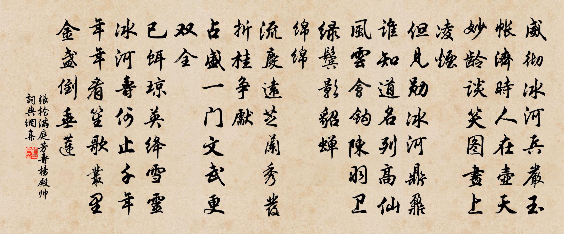 詩詞名句歷史字典書法欣賞書法字典國語詞典說文解字康熙字典古漢語字典標 題 作 者 詩 句 滿庭芳(壽楊殿帥)作者:張掄 朝代:宋代滿庭芳(壽楊殿帥)原文威徹冰河,兵嚴玉帳,濟時人在壺天。妙齡談笑,圖畫上凌煙。但見勛冰河鼎鼐,誰知道、名列高仙。風雲會,鉤陳羽衛,綠鬢影貂蟬。綿綿。流慶遠,芝蘭秀髮,折桂爭先。占盛一門,文武更雙全。已餌瓊英絳雪,靈冰河壽、何止千年。年年看,笙歌叢里,金盞倒垂蓮。詩詞問答問:滿庭芳(壽楊殿帥)的作者是誰?答:張掄問:滿庭芳(壽楊殿帥)寫於哪個朝代?答:宋代問:滿庭芳(壽楊殿帥)是什麼體裁?答:詞張掄滿庭芳(壽楊殿帥)書法欣賞滿庭芳(壽楊殿帥)書法作品詩詞推薦題吳郡王家雙竹曹勛〔宋代〕環碧亭前碧玉枝,森森連璧揖多姿。節涵宿雨蒼龍並,梢舞晴雲翠鳳差。架雪凌霜俱有志,懷仁抱義本同時。戚垣正月晦日與弟觀對酌陳著〔宋代〕聚散等風沙,相知要當家。弟兄窗下酒,世俗眼前花。隱去方為福,貧驅未有涯。明朝吉凶事,分付與昏鴉。送趙教授陳師道〔宋代〕束髮相看到白頭,了知公鬢不勝憂。可堪親老須三釜,又著儒冠忍一羞。平世功名須晚節,向來旬月取封侯。北州壬子歲送方叔姜特立〔宋代〕經年懷抱幾曾開,面上康衢一寸埃。已向西偏營小築,高懸一榻待公來。偈頌三十六首釋如珙〔宋代〕哇地一聲諸境現,周行七步更多能。老僧不是多饒舌,要與諸人絕謂情。臨江仙(九之四)鄧肅〔宋代〕劍水冷冷行碧玉,扁舟一葉吹風。玉人招手畫橋東。浩歌隨月去,春在小樓中。簾幕低垂圍篤耨,雕觴笑捧春蔥。史丞相生辰喻良能〔宋代〕姓名久已覆金甌,一品師臣德業優。黼扆尚詢黃髮舊,袞衣難伴赤松游。松筠勁節高三事,桃李濃陰遍九州。蕭葉拙稿呈許侯楊公遠〔宋代〕拙稿攜將謁使君,區區那敢冀知聞。編成功卷如終卷,賦就三分誦七分。妄意僭乾修月斧,刪蕪端藉運風斤。一經清平樂韋莊〔唐代〕綠楊春雨,金線飄千縷。花拆香枝黃鸝語,玉勒雕鞍何處。碧窗望斷燕鴻,翠簾睡眼溟濛。寶瑟誰家彈罷,含悲斜阮郎歸歐陽修〔宋代〕濃香搓粉細腰肢。青螺深畫眉。玉釵撩亂挽人衣。嬌多長睡遲。繡簾角,月痕低。仙郎東路歸。淚紅滿面濕胭脂。高宗皇帝輓詞二首倪思〔宋代〕黼翣方徐轉,龍輴望已遙。胥濤平似掌,禹穴儼如朝。喪孝群心痛,號旻聖孝昭。稽經崇調號,萬世永尊堯。題張侍郎松菊堂洪皓〔宋代〕松青抱正性,菊黃得正色。蔚在卉木間,厥異存簡策。流膏貫眾壤,千歲名虎魄。落英通鼻觀,服餌供楚客。安神寓意十首次敬助韻 其六王冕〔元代〕聖賢不浪出,處士匪懷居。孔明是何人?高臥南陽廬。躬耕良自苦,待時故躊躕。所為梁父吟,豈比封禪書?寄贈柳殿院開授崇儀使赴邊上潘閬〔宋代〕從來長見說兵機,今日君恩志豈違。驄馬不騎騎鐵馬,繡衣休掛掛戎衣。雄師已聽心皆伏,醜虜將聞魄盡飛。應笑對鏡吟長孫佐輔〔唐代〕憶昔逢君新納娉,青銅鑄出千年鏡。意憐光彩固無瑕,義比恩情永相映。每將鑒面兼鑒心,鑒來不輟情逾深。君非送李道士文同〔宋代〕先生若孤雲,兩在隆山見。清標瘦彌聳,秀骨老愈健。高談吐深詣,大句寫精鏈。忽起憶鵝池,肏飛石泉濺。又寄興化徐虞部蔡襄〔宋代〕梅花狼籍拂輕舟,人日溪行動客愁。上晝去程初北首,故山歸思滿東流。垂垂朝雨隨雙槳,草草春蔬送一甌。不獨夢李白二首杜甫〔唐代〕死別已吞聲,生別常惻惻。江南瘴癘地,逐客無訊息。故人入我夢,明我長相憶。恐非平生魂,路遠不可測。魂來寄鄭谷郎中齊己〔唐代〕詩心何以傳,所證自同禪。覓句如探虎,逢知似得仙。神清太古在,字好雅風全。曾沐星郎許,終慚是斐然。春近王銍〔宋代〕山雪銀屏曉,溪梅玉鏡春。東風露訊息,萬物有精神。索莫貧游世,龍鍾老迫身。欲浮滄海去,風浪闊無津。名句推薦古來存老馬,不必取長途。杜甫《江漢》 唯通乎性命之情,而仁義之術自行矣。呂不韋《呂氏春秋·論·似順論》 舉棋不定,不勝其耦。左丘明《左傳·襄公·襄公二十五年》 聖人不期修古,不法常可,論世之事,因為之備。韓非及後人《韓非子·五蠹》 無限春風來海上。便與春工。染得桃紅似肉紅。蘇軾《減字木蘭花·立春》 夜闌更秉燭,相對如夢寐杜甫《羌村》 撥雪尋春,燒燈續晝。毛滂《踏莎行·元夕》 佳人亦何念,淒斷陽關曲。蘇軾《送頓起》 晚來風起花如雪,飛入宮牆不見人。劉禹錫《楊柳枝詞九首》 禹廟空山里,秋風落日斜。杜甫《禹廟》